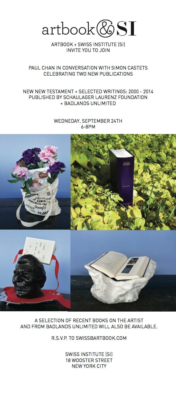 ARTBOOK + SWISS INSTITUTE (SI) invite you to join Paul Chan in conversation with Simon Castets celebrating two new publications, New New TestamentSelected Writings: 2000 – 2014, published by Schaulager Laurenz Foundation + Badlands Unlimited.