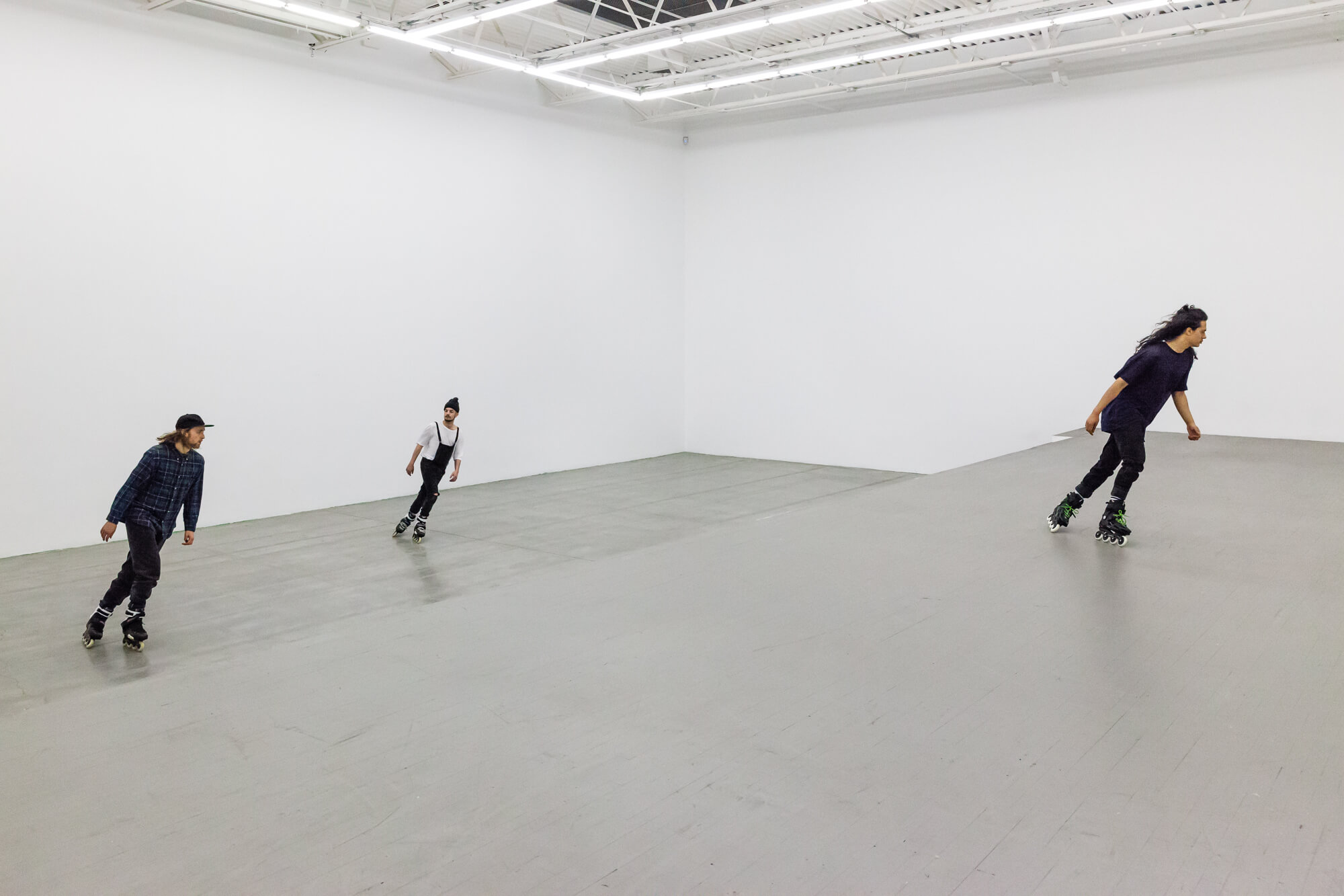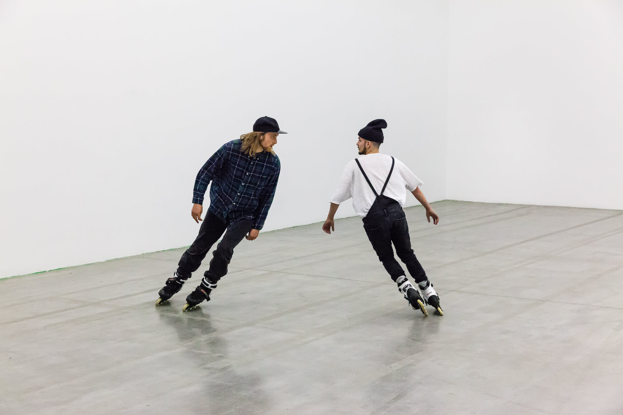 Alex Baczynski-Jenkins has created a choreographic score for performers on rollerblades who orbit one another whilst reciting, remixing and reformulating fragmented lines of poetry that meditate on desire. This contingent, polyphonic script circulates among the performers and is perpetually altered by their movements, attitudes and affects. Through their continued speech, the performers begin to channel a queer archive of verses and inflections, including lines from Essex Hemphill, Eileen Myles, Langston Hughes. The rollerbladers both move through, and are set in motion by, these articulations of desire and the sensuality of repetition.