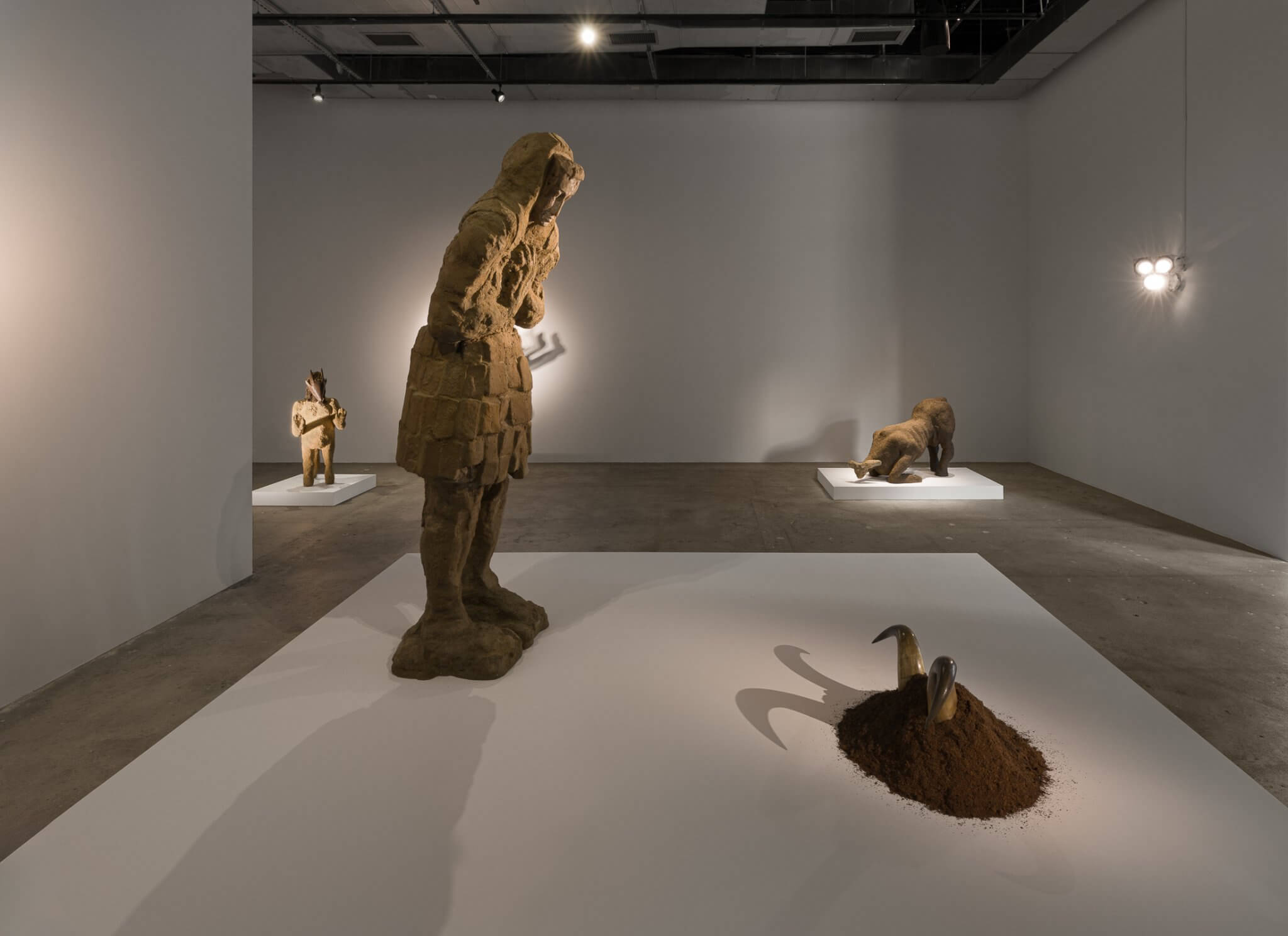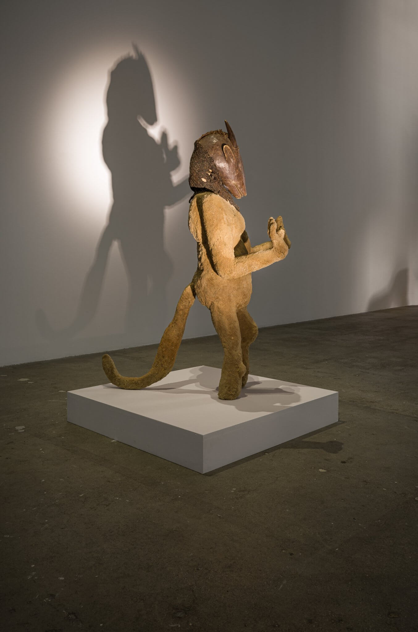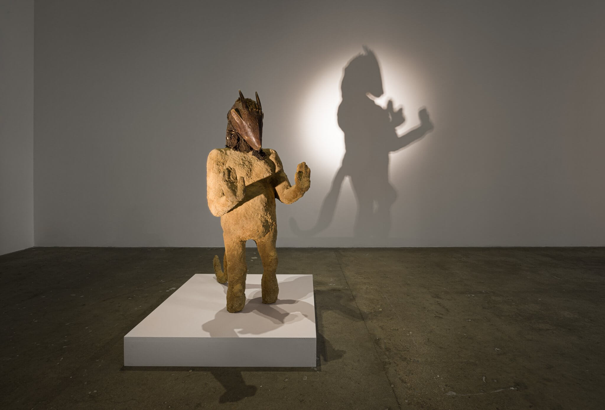 On the first floor of Humble and quiet and soothing as mud, a newly commissioned sculptural installation is fleetingly animated by a choreography of moving lights, retelling the myth of Gilgamesh in a scene surrounding the fabled figure with other characters from the epic poem. In Mesopotamian mythology, Gilgamesh’s rival-turned-companion Enkidu is formed from clay and water to help the semi-mythic king of Uruk on his ventures to achieve immortality. The bodies of Cherri’s sculptures are composed of mud, with masks and fragments of found objects serving as their faces. Cherri buys these sculptural fragments in auctions, where prices fluctuate with changing desires for the objects on sale, mirroring their economic value as cultural artifacts and their political potency in recent discussions of reparations. These objects, which are often forged and then smuggled abroad, are less a question of cultural authenticity for Cherri than about the perpetuation of a lived tradition – an unfixing of these objects from the grips of archaeological time. Yet mud is the material that best preserves archeological finds. What memories might be held by its shifting topographies?