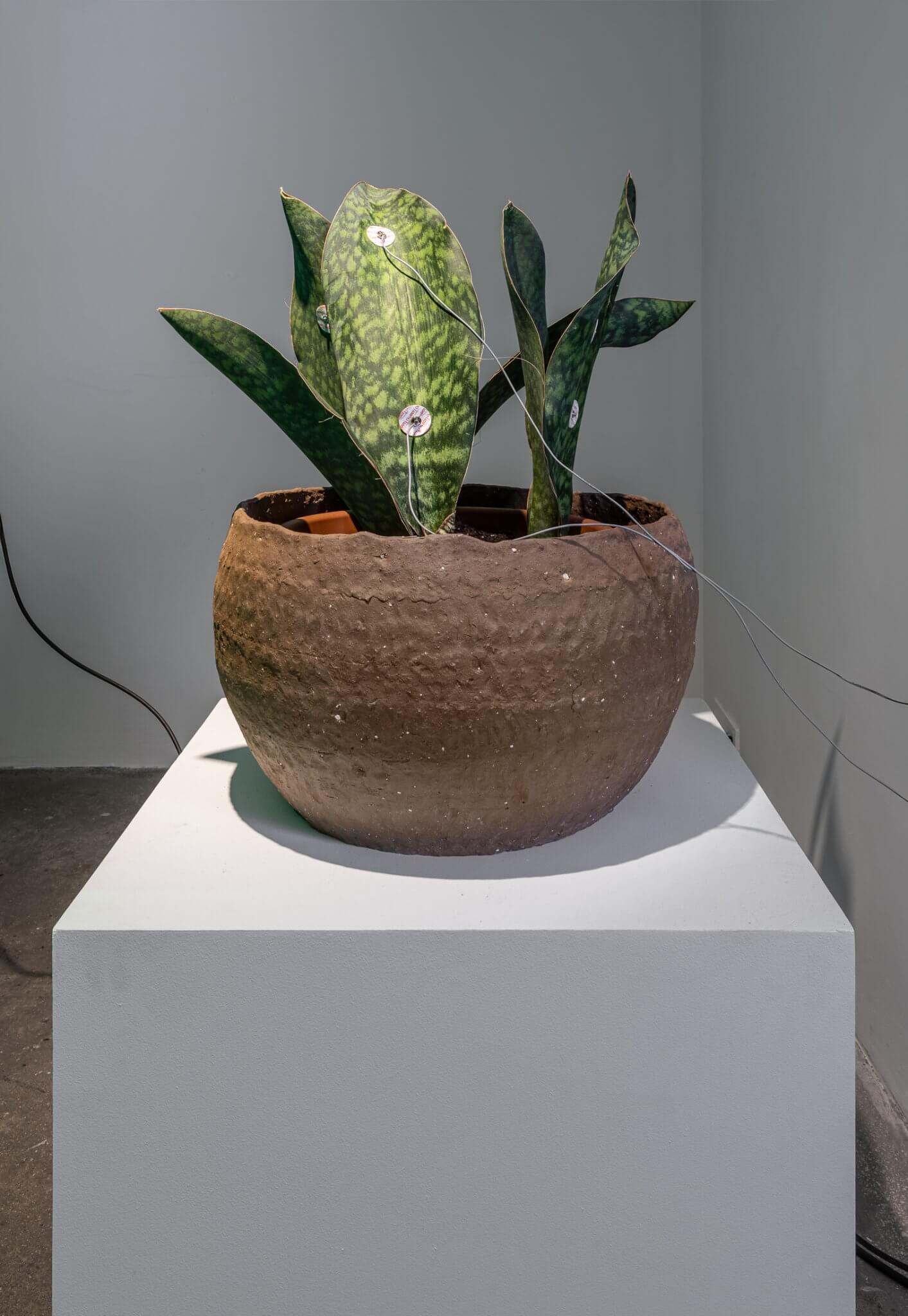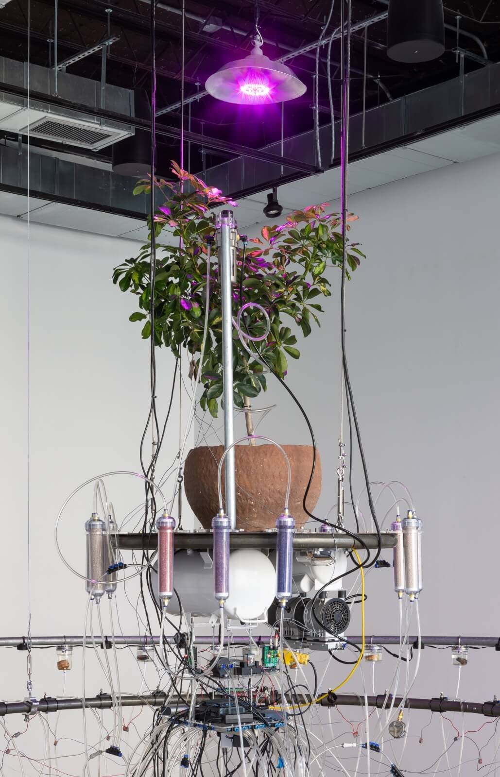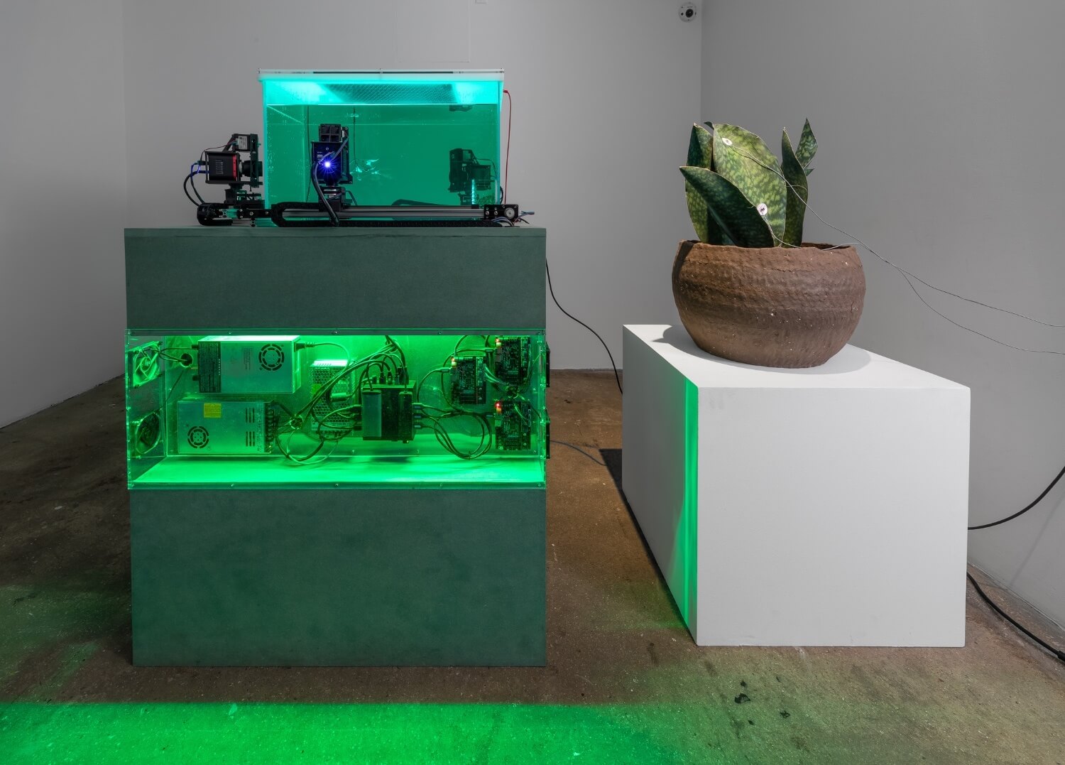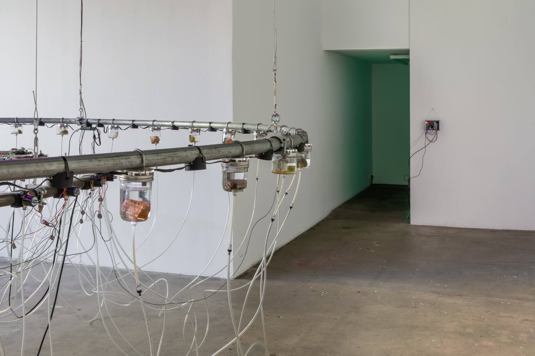 Upon entering the gallery, visitors encounter Hyperpnea Green (2024), a large-scale sculptural installation composed of concentric circles suspended from the ceiling. Positioned along the rings’ circumference are transparent containers housing minerals extracted in Indonesia, native plants commonly sold as houseplants in the US, lights, and a music box. These components are connected to an oxygen machine and a monitoring system that activates chains of biofeedback in reaction to signals set off by the metabolisms of both plants and humans. As viewers exhale carbon dioxide, the apparatus responds by pumping oxygen into the space. Hyperpnea is the medical term for rapid or deep breathing to meet increased oxygen demand. The installation highlights our dependency on the natural world, which we simultaneously deplete through unstable consumption, alongside illuminating the interdependence between organic and artificial systems.