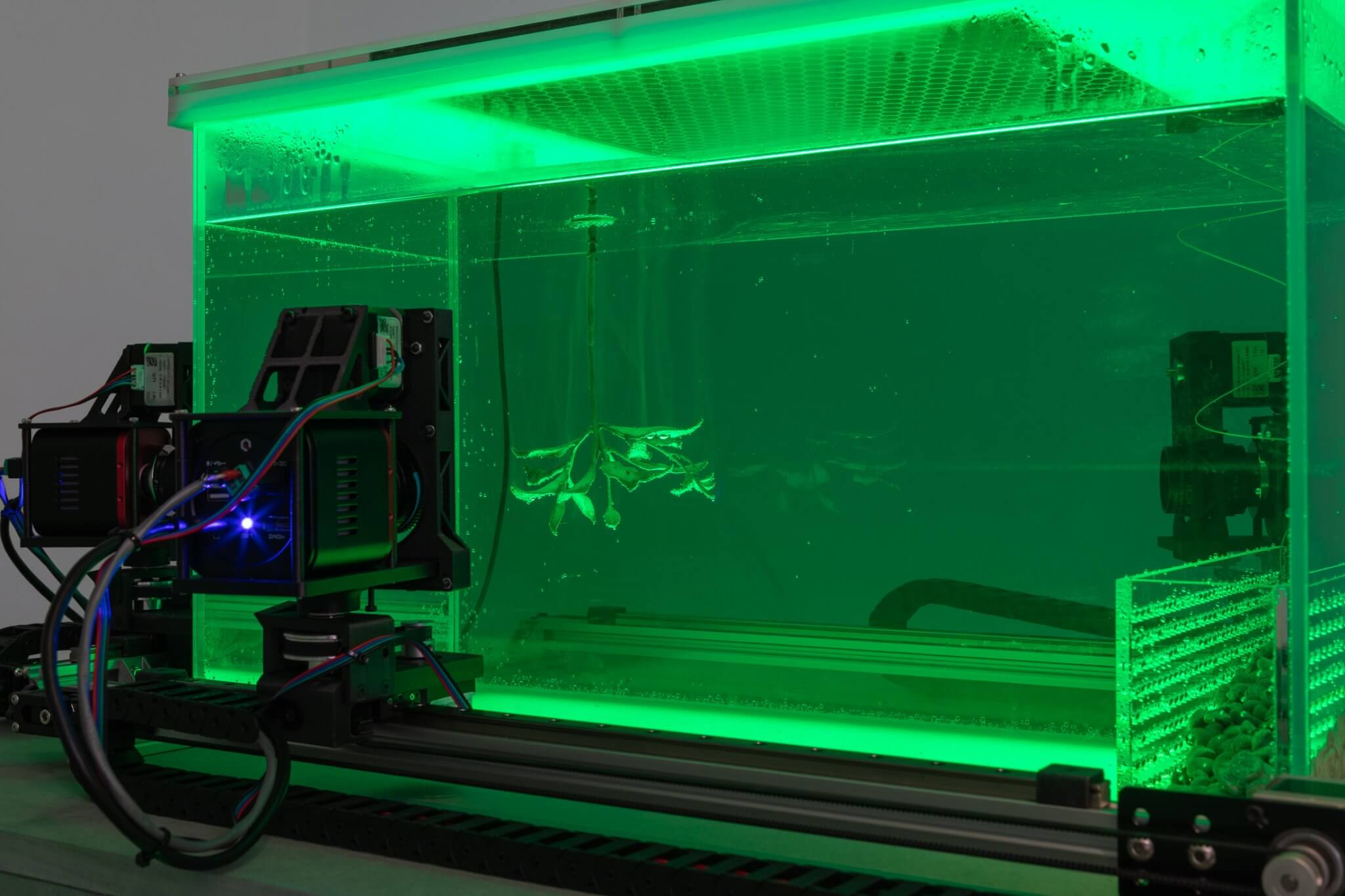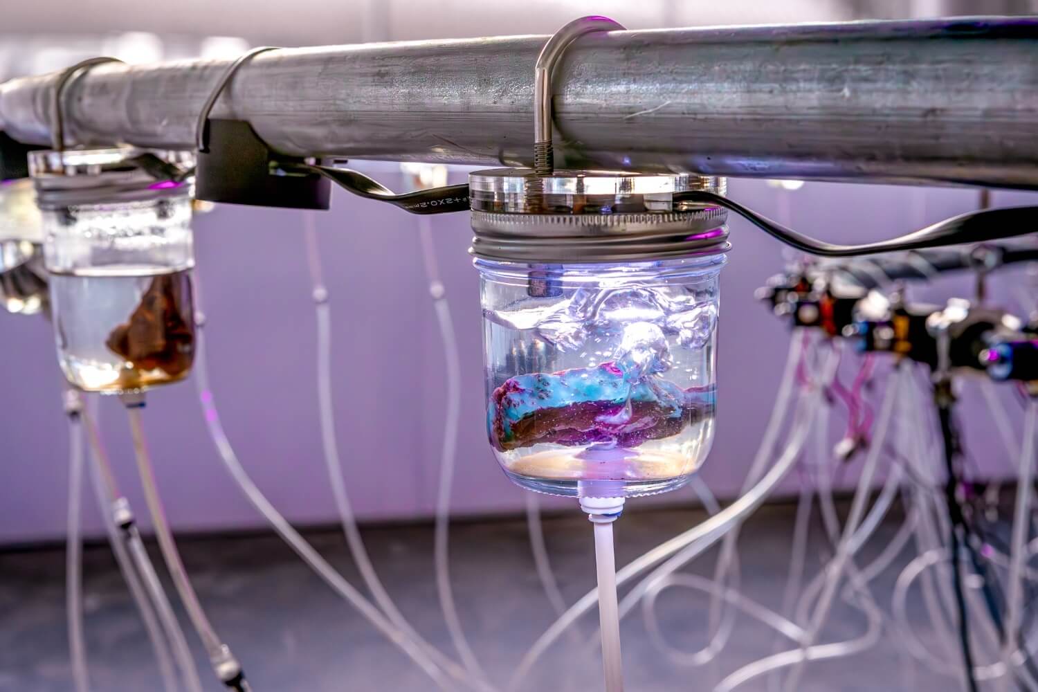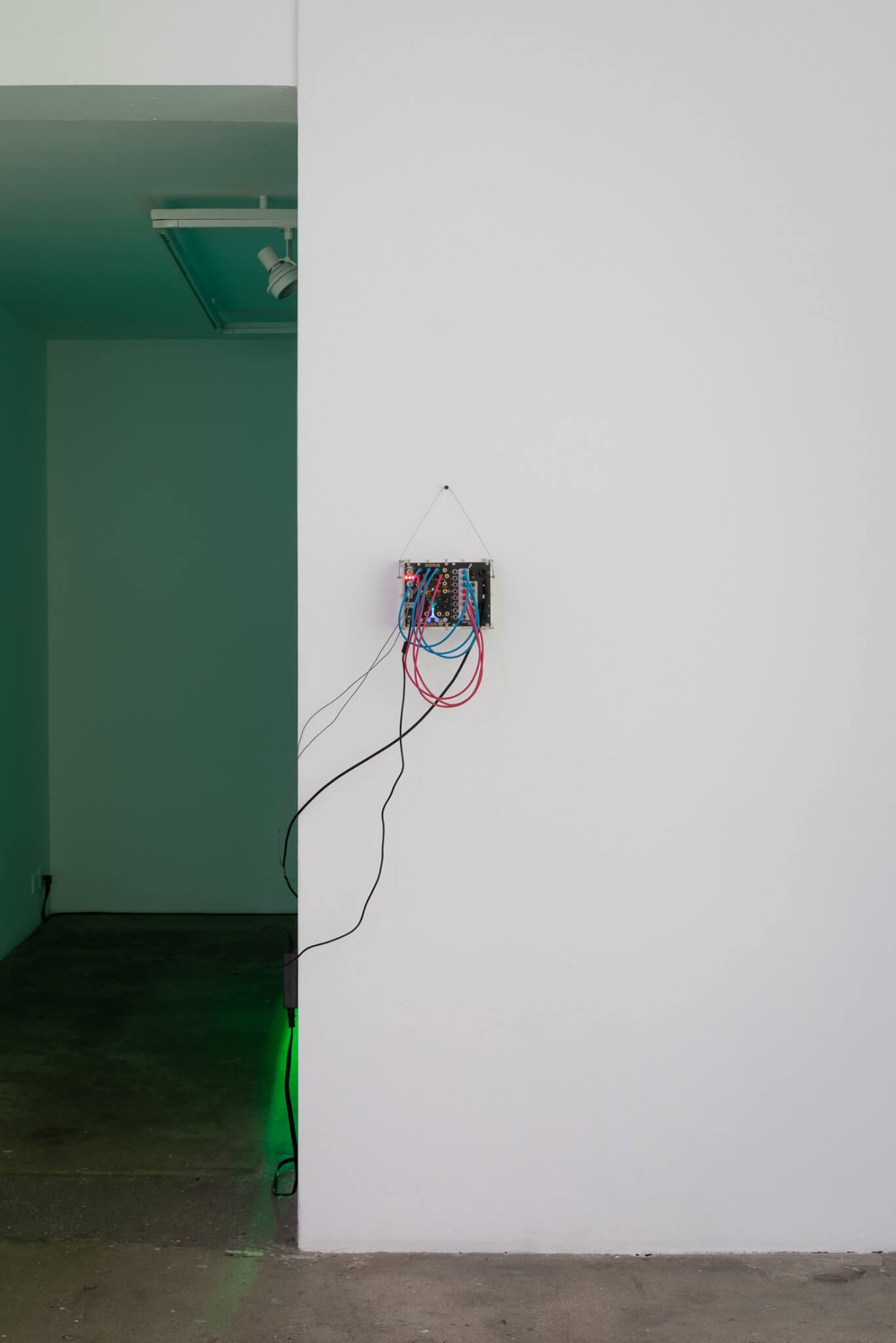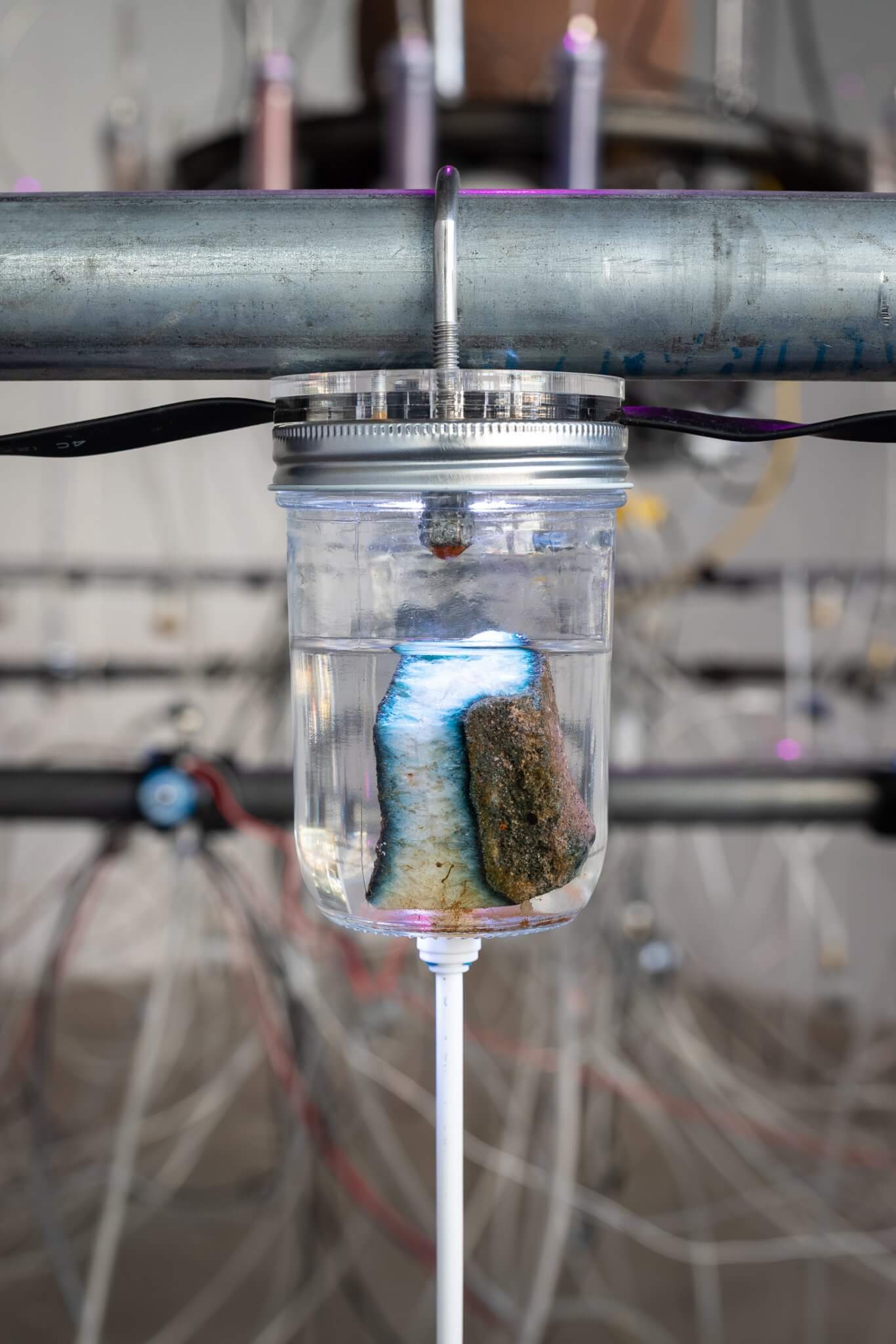 Upon entering the gallery, visitors encounter Hyperpnea Green (2024), a large-scale sculptural installation composed of concentric circles suspended from the ceiling. Positioned along the rings’ circumference are transparent containers housing minerals extracted in Indonesia, native plants commonly sold as houseplants in the US, lights, and a music box. These components are connected to an oxygen machine and a monitoring system that activates chains of biofeedback in reaction to signals set off by the metabolisms of both plants and humans. As viewers exhale carbon dioxide, the apparatus responds by pumping oxygen into the space. Hyperpnea is the medical term for rapid or deep breathing to meet increased oxygen demand. The installation highlights our dependency on the natural world, which we simultaneously deplete through unstable consumption, alongside illuminating the interdependence between organic and artificial systems.