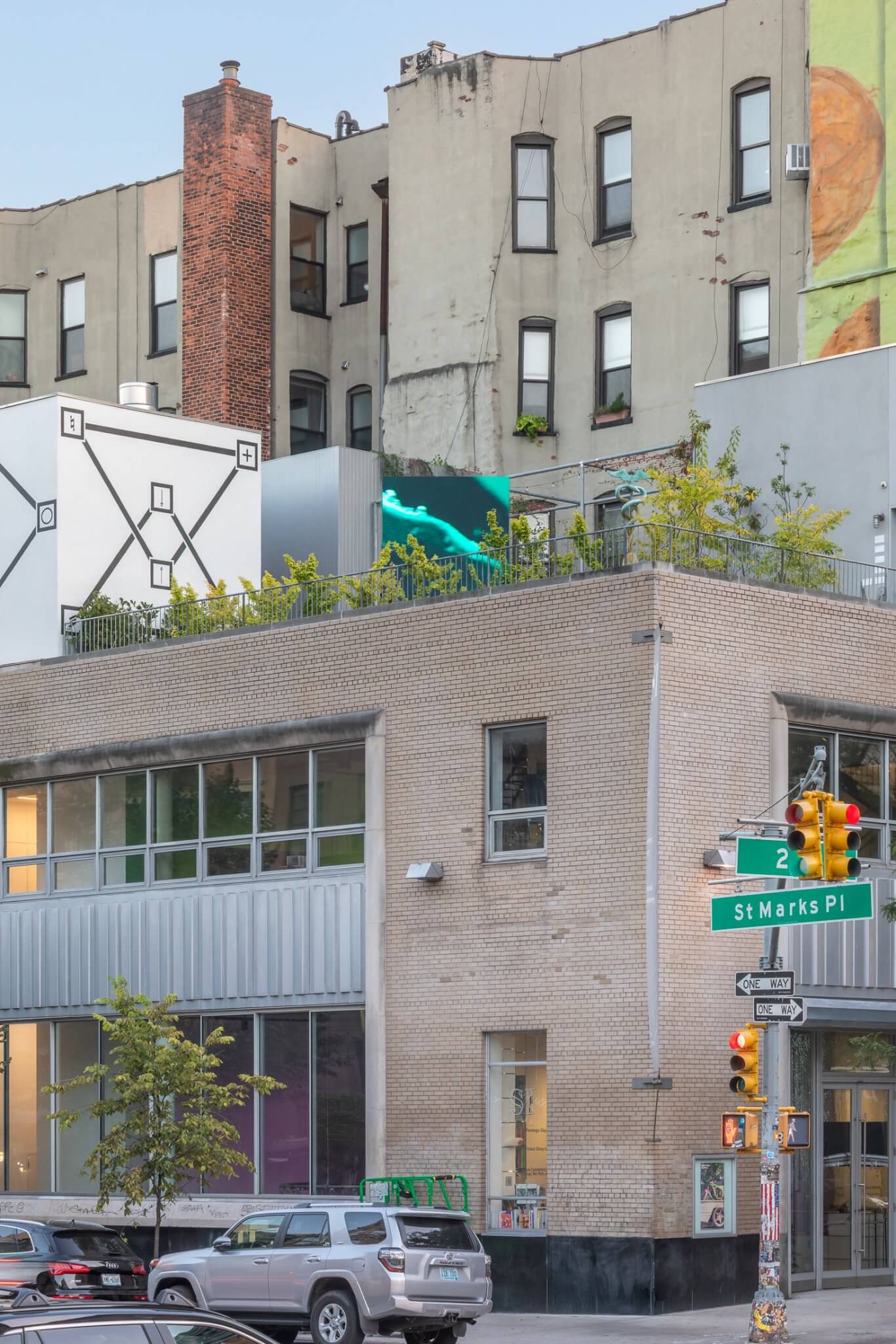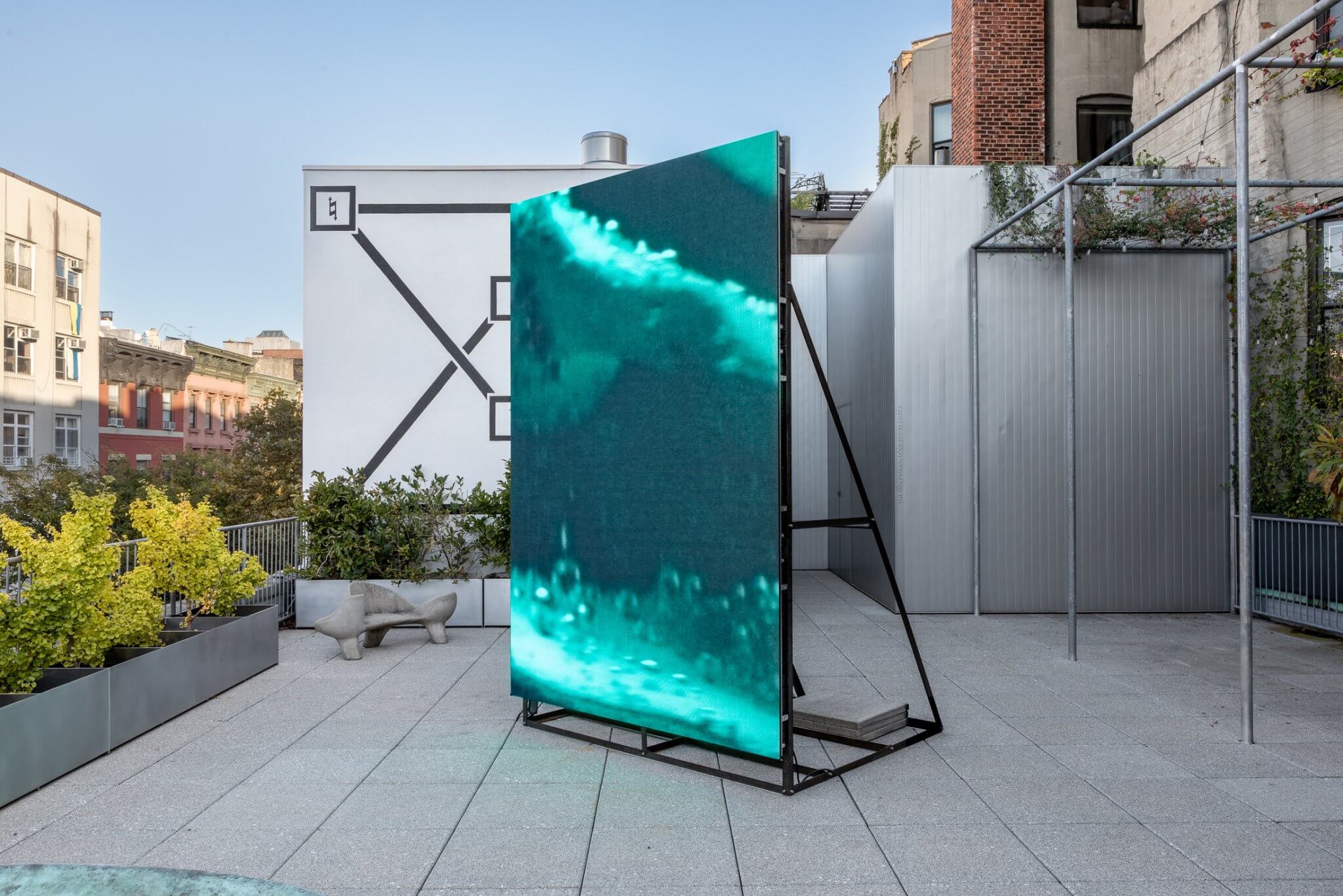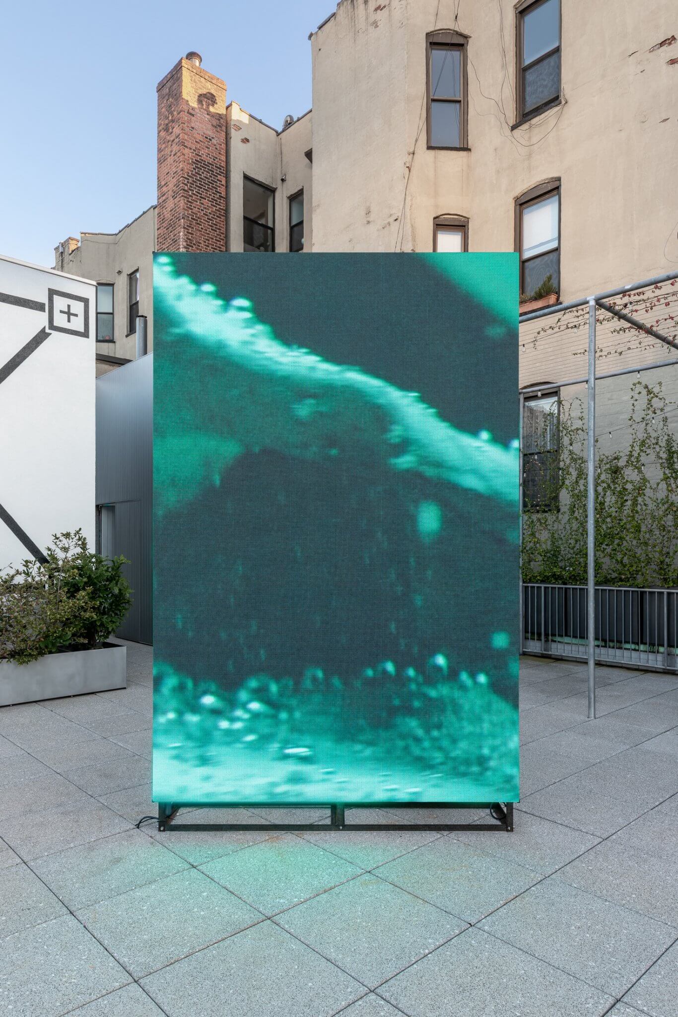 Presented nearby is the newly commissioned installation Anim Wraksa (2025), whose title is derived from Kawi, or Old Javanese, translating to “the spirit of the tree.” Inside an acrylic container filled with an electrolyte solution, a tree branch undergoes a continuous process of nickel plating. Indonesia is the world’s largest exporter of nickel, and its extraction has led to deforestation, water pollution, and soil toxicity – disrupting not only the environment but also social and spiritual relations. Throughout the duration of the show, the branch will continue to accumulate metal, transforming the object over time. A live transmission of the process is broadcast to a large LED wall on SI’s rooftop — which itself includes nickel — visible both from the terrace and the street level below. The image is massively enlarged and flipped upside down, reversing the upward flow of hydrogen gas bubbles released during the plating process so that they appear to fall like raindrops or tears.