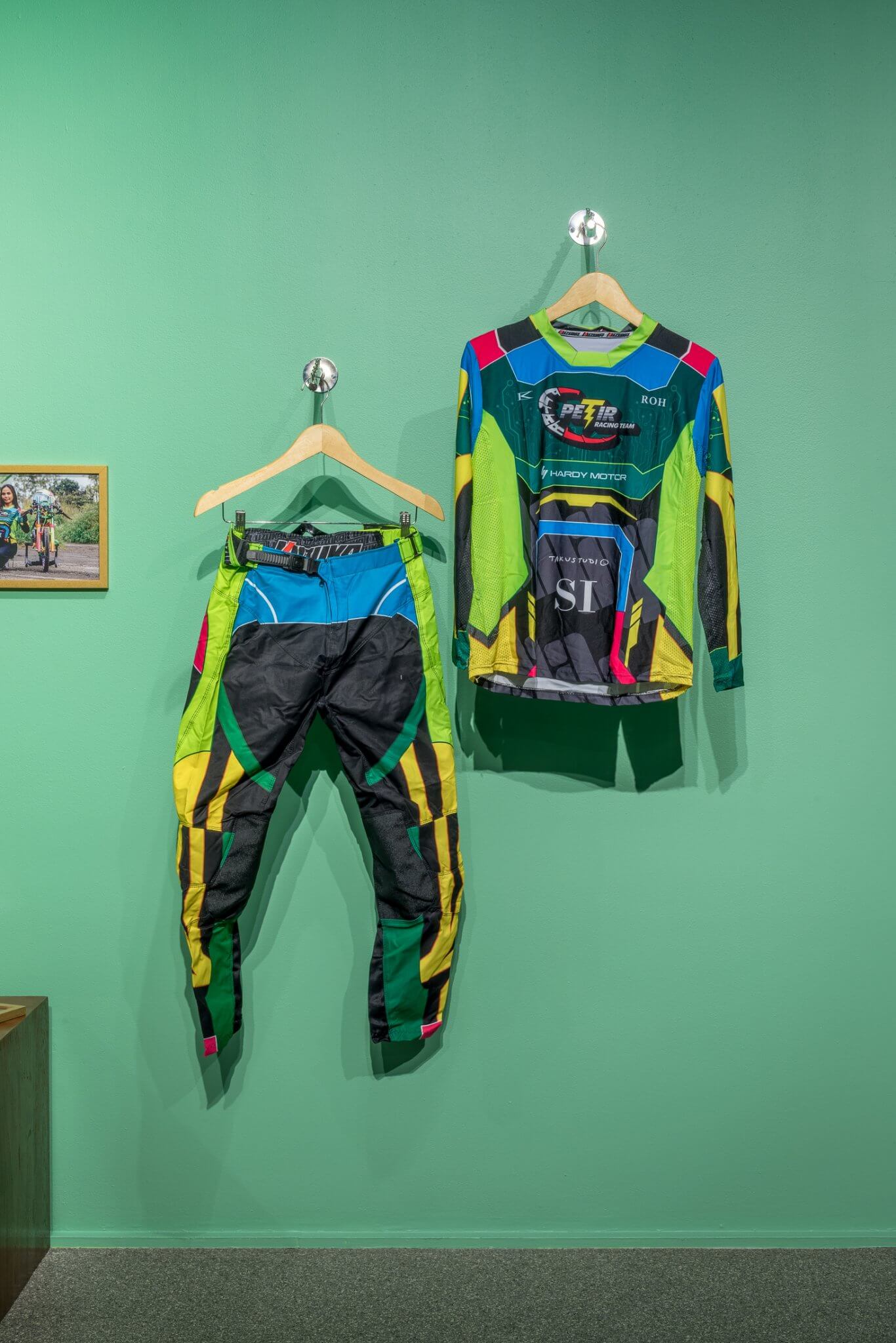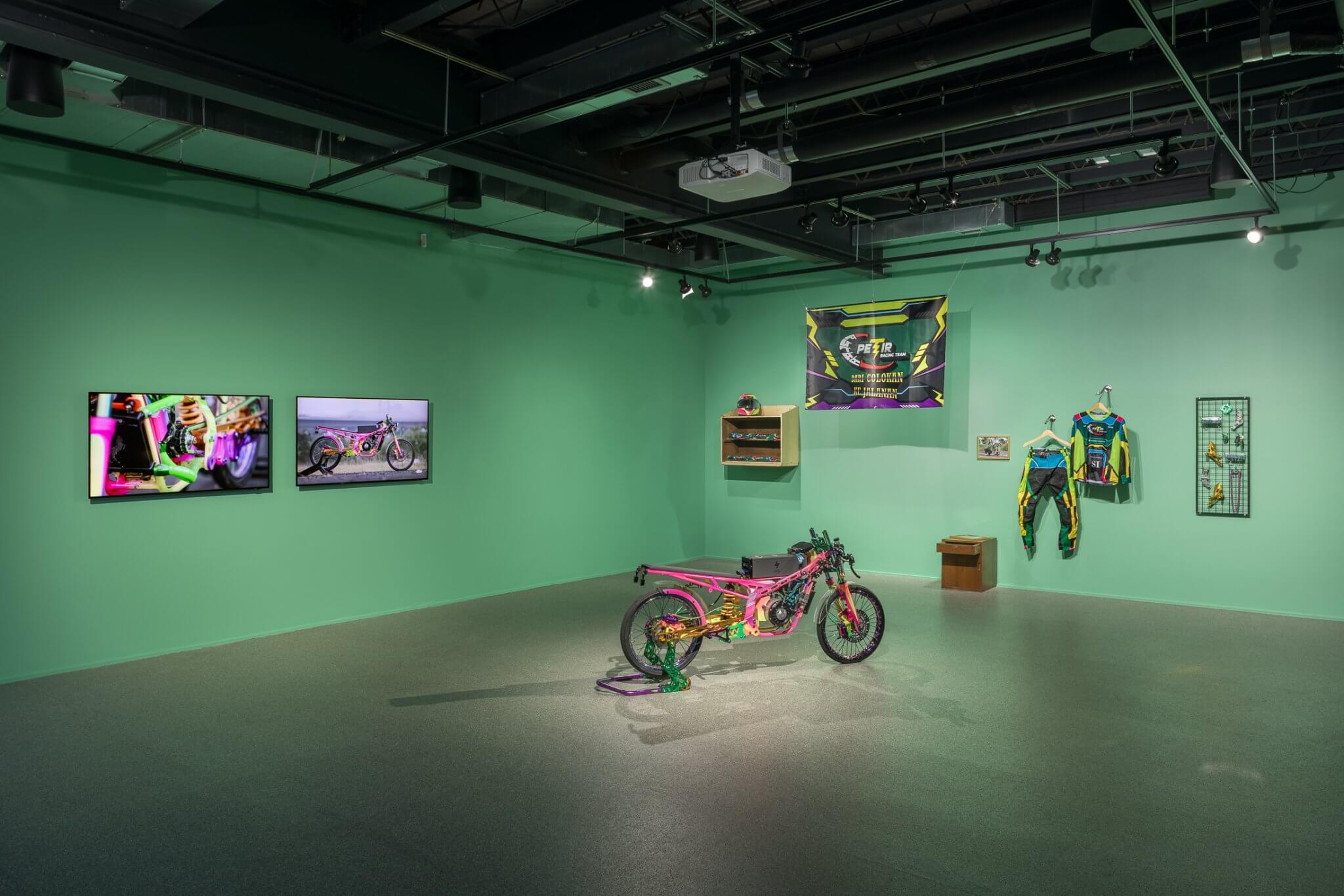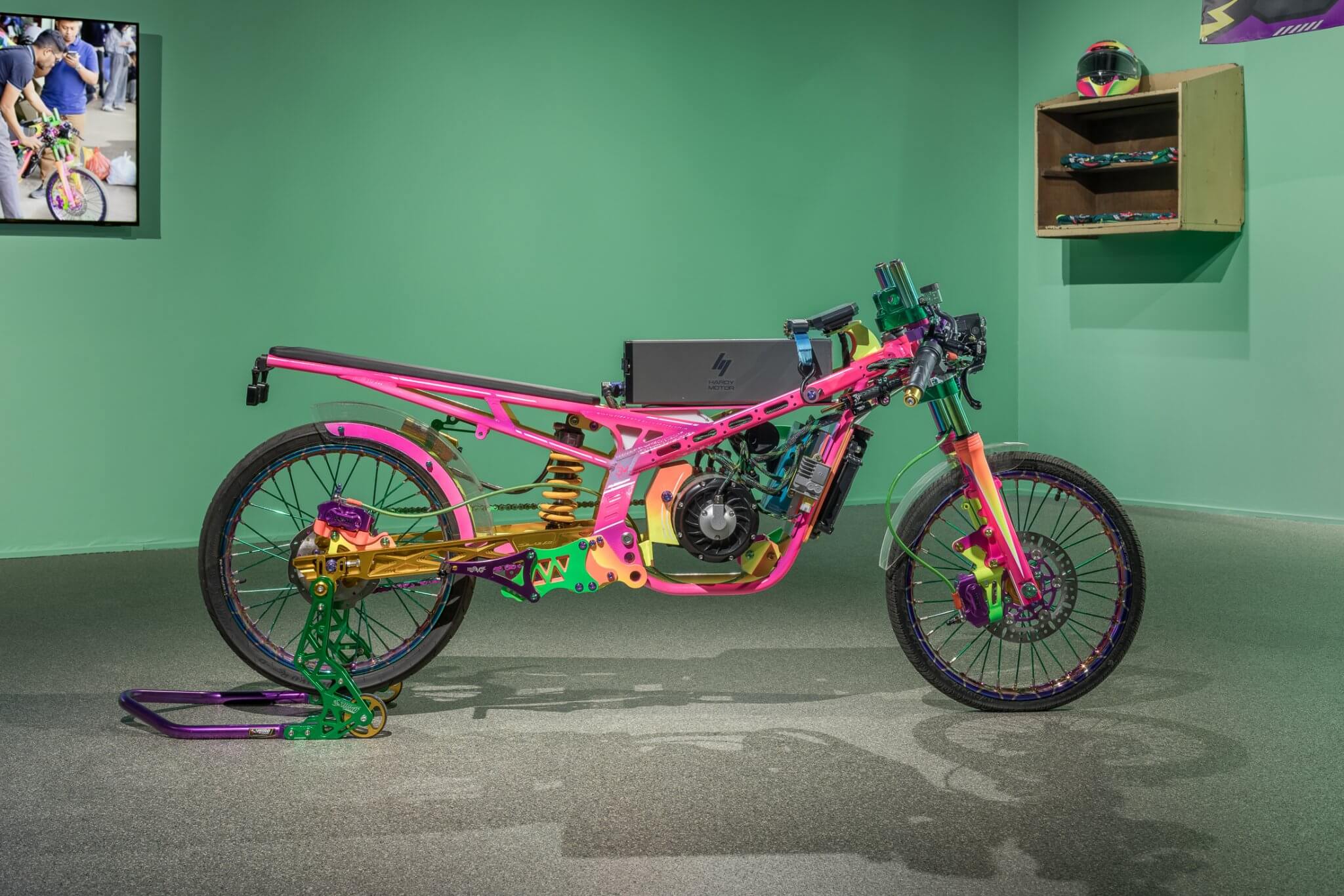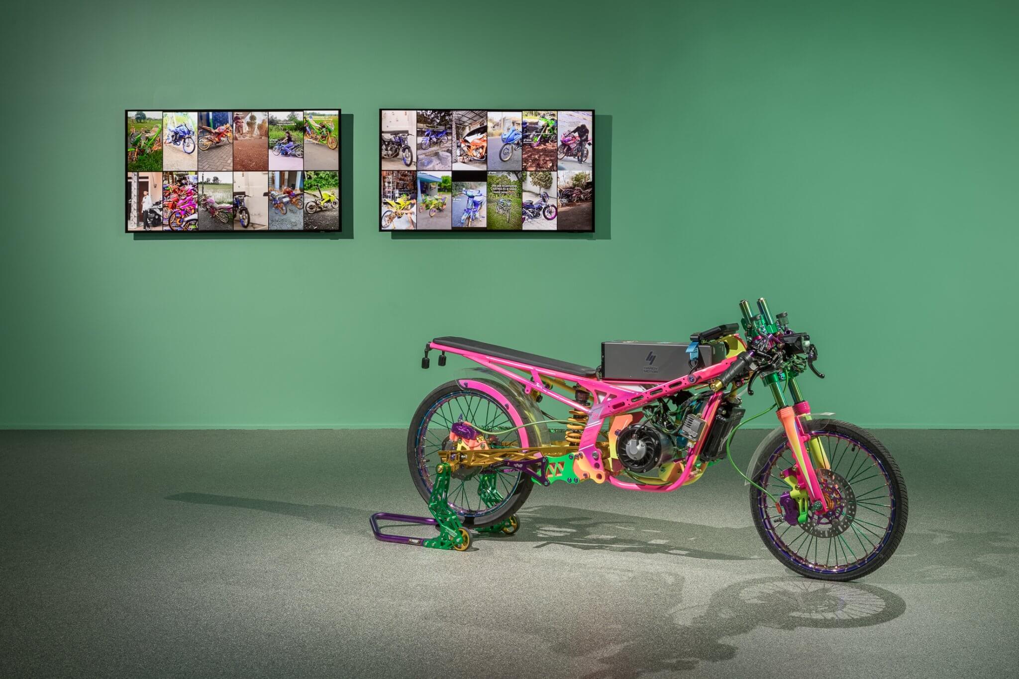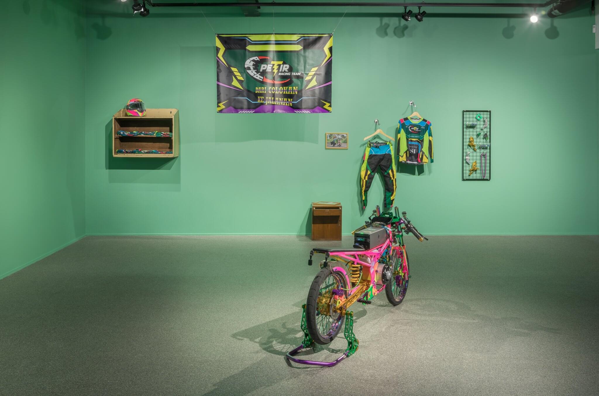 On the second floor is the new commission Putar Petir Racing Team (2025), both a sculpture and a fully operational electric battery-powered motorcycle that Pandega built from scratch. The bike is sprayed in gleaming shades of purple, pink, and gold, drawing inspiration from the local jamet aesthetic – a slang blend of “Javanese” and “metal” that refers to a metalhead-influenced street style associated with popular drag racing. Nearby, a video documents a drag race Pandega organized in Bandung, in which his EV motorcycle competed against regular gasoline-powered bikes. The sculpture and video are accompanied by a custom racing jersey and helmet from a fictitious team created by the artist, displayed on a wall painted in the green hue commonly found in modest homes in Indonesia.