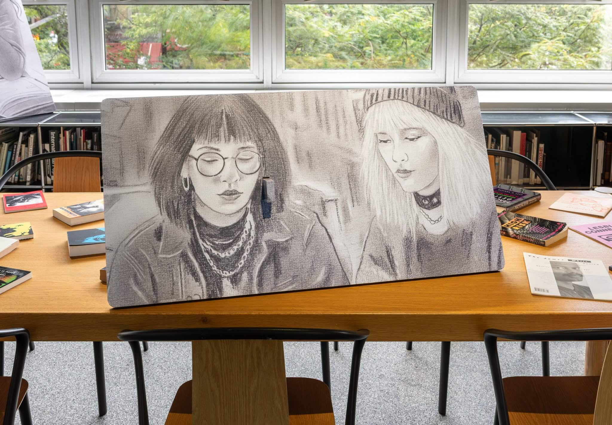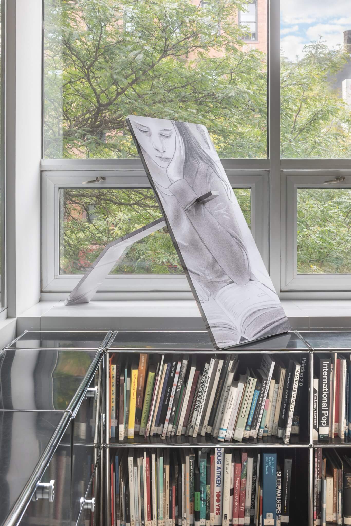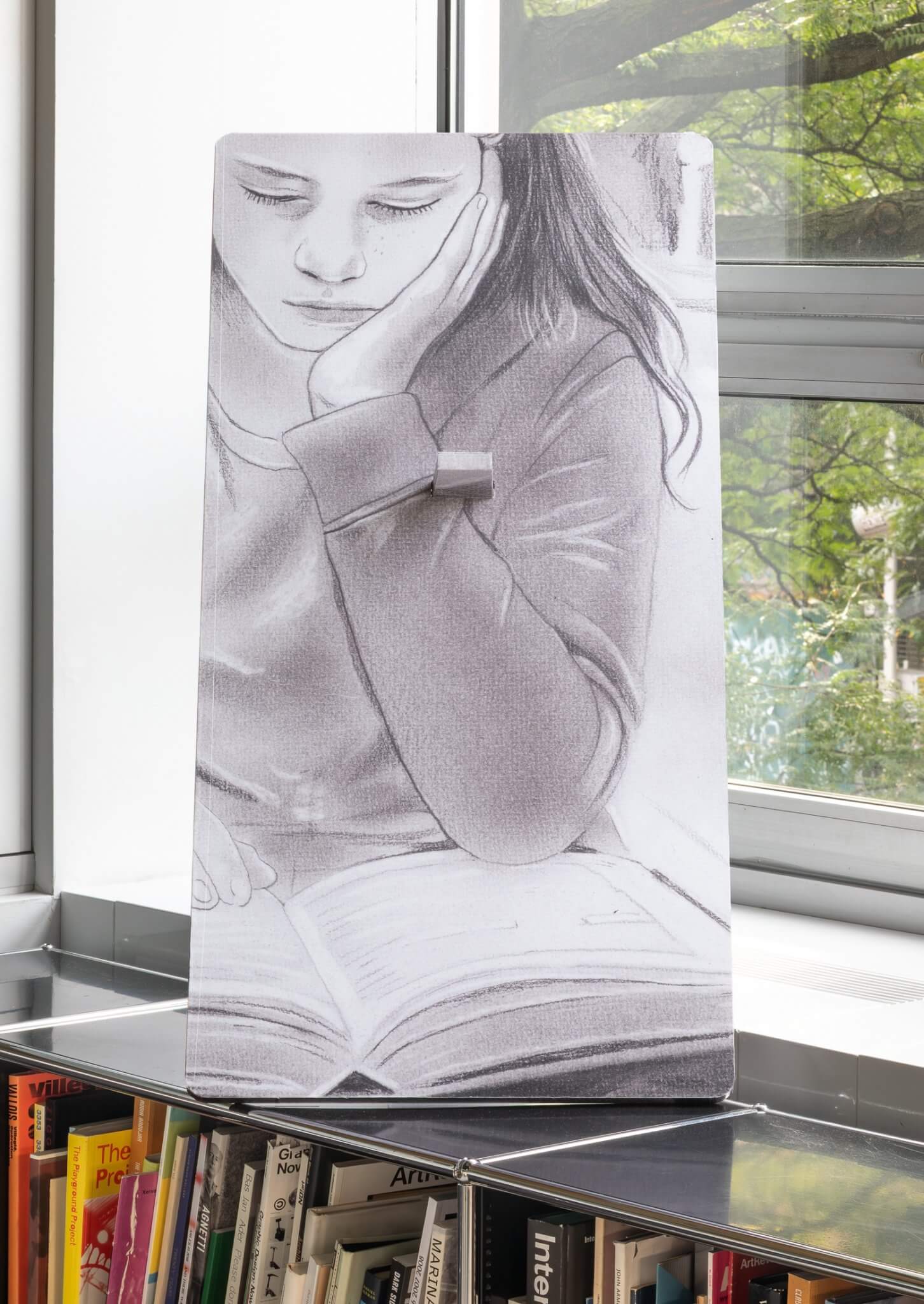 Alongside this selection, the installation includes works that engage with the historical iconography of women reading. Traditionally portrayed in private, domestic settings, where reading is confined away from the public sphere, Candeloro reimagines these poses by placing female readers in urban, crowded, and highly visible contexts. In doing so, she transforms the act of reading into a declarative gesture of presence. Rendered as three-dimensional installations reminiscent of commercial displays, these images aim to subvert conventional dynamics of exposure: what appears in the window is not a commodity, but a self-aware figure asserting her visibility.