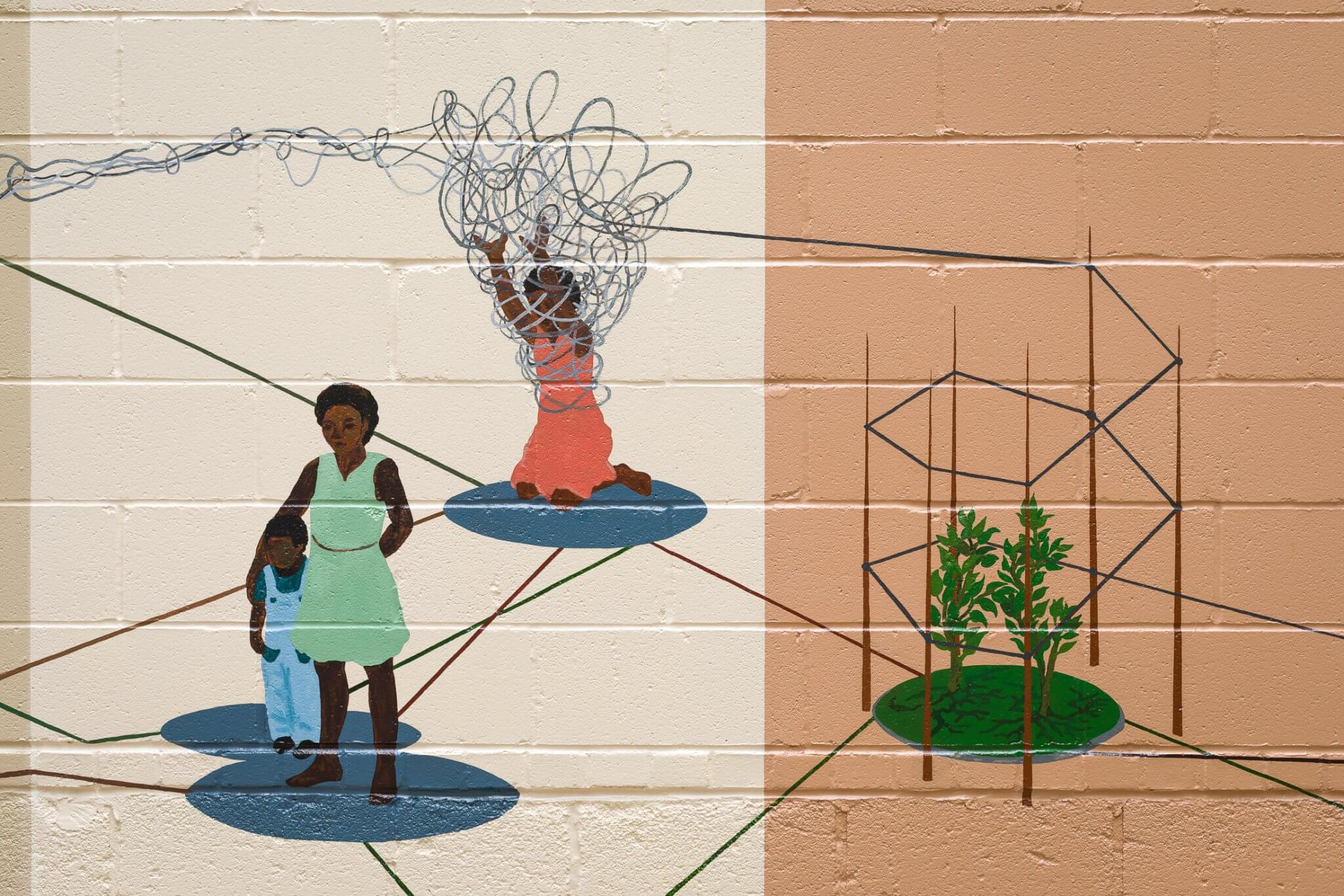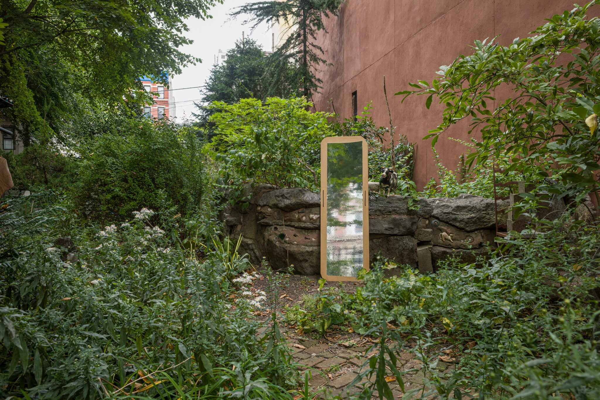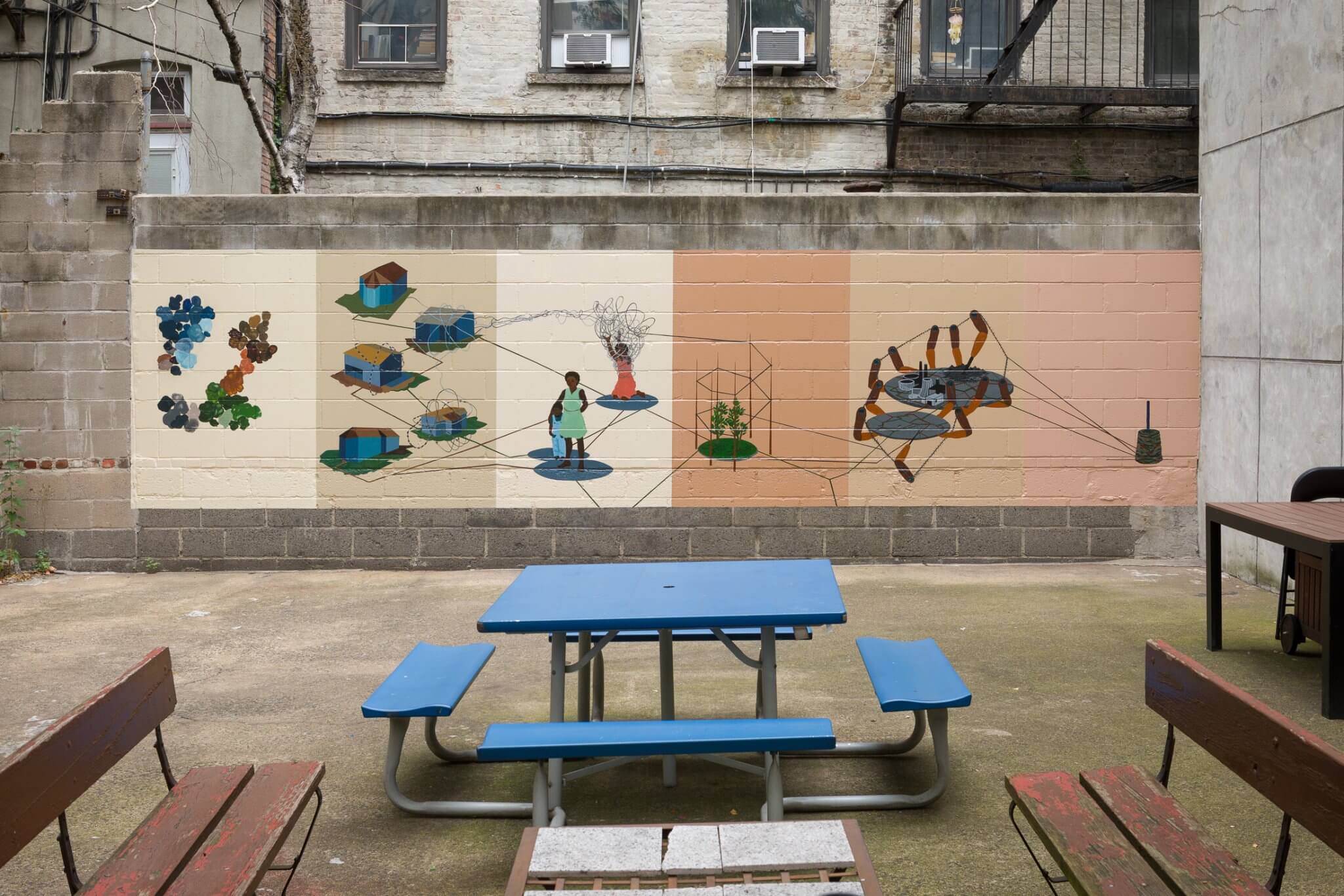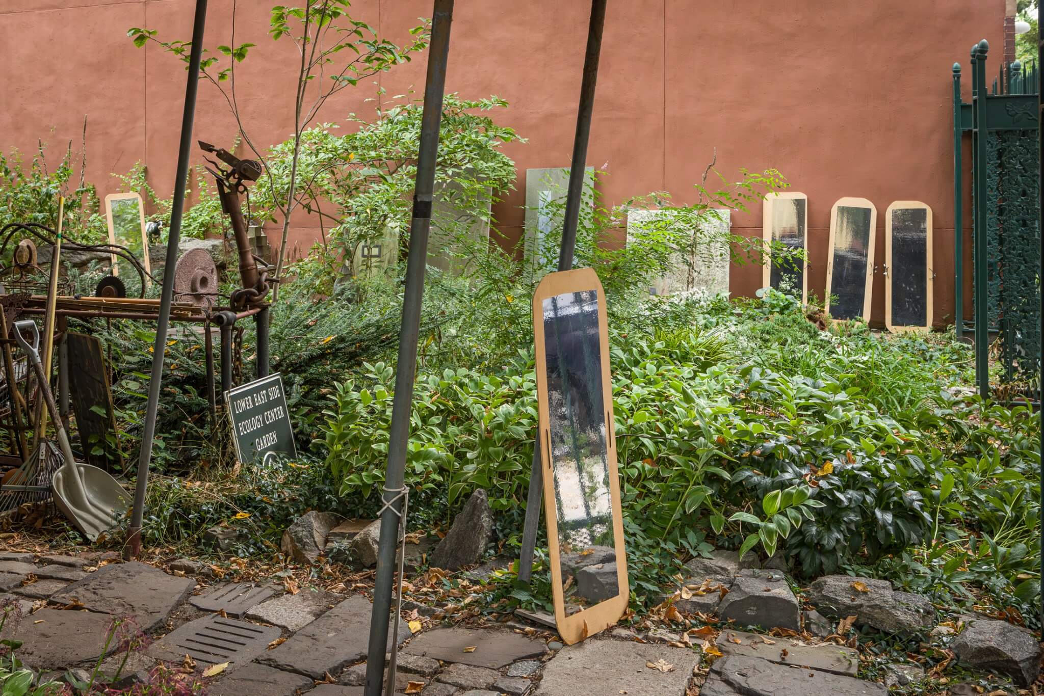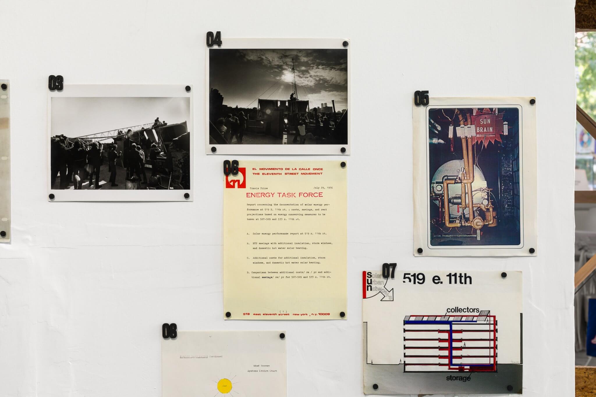 The exhibition sprawls from SI into the East Village, sending metaphoric electric impulses through the neighborhood. Departing from SI, where a selection of Gordon Matta-Clark’s Energy Tree drawings and an original copy of his Guggenheim Foundation proposal for “A Resource Center and Environmental Youth Program for Loisaida” are presented, in the yard of St. Mark’s Church in-the-Bowery the artist’s Rosebush (1972) has been replanted at its original site, on the occasion of the exhibition. Nearby, in the yard of the co-op at 519 E 11th Street, whose wind turbine and solar panels inspired the exhibition, a new mural by Otobong Nkanga has been installed in close collaboration with the community. Titled Social Consequences I: Segregation – Encroaching Barricade – Entangled – Endangered Species – Rationed Measures – Intertwined, the painting weaves together social and ecological relations as well as concerns regarding production, housing, and access, and will remain on long-term view. Mirror shields built in a community workshop by Cannupa Hanska Luger, akin to those the artist made for use by the water protectors at Standing Rock in 2016, are on view at SI as well as in the Lower East Side Ecology Center’s garden on E 7th Street. Energies also incorporates two independent exhibitions, at the Museum of Reclaimed Urban Space, documenting grassroots environmental and housing activism, and the Loisaida Center, showcasing the organization’s Ecolibrium multidisciplinary climate science literacy and environmental justice project.