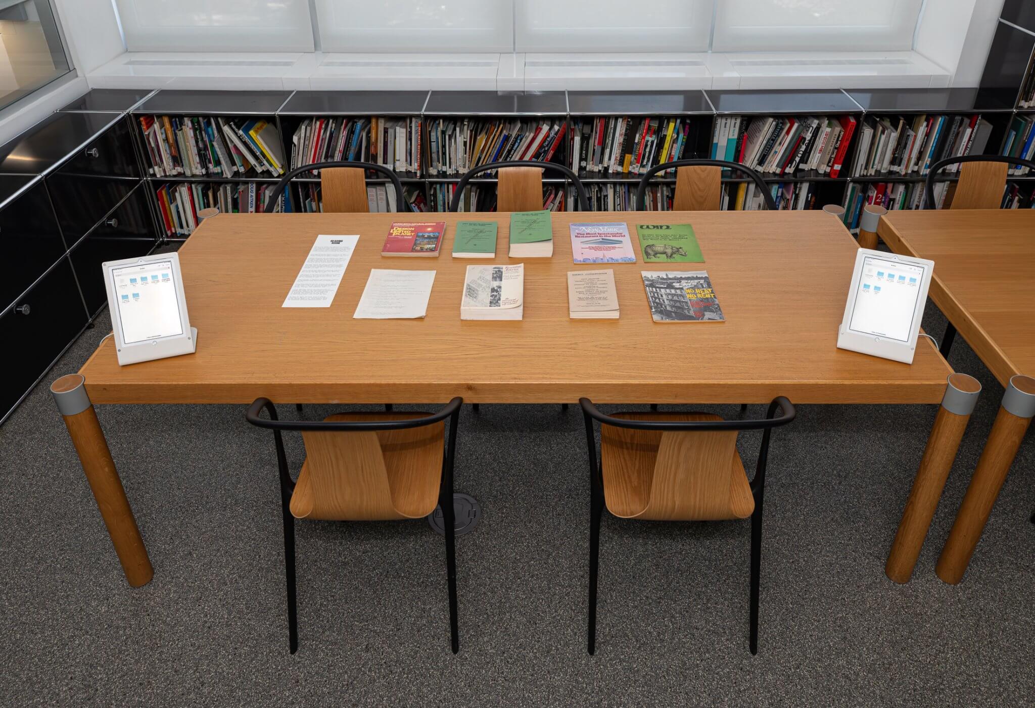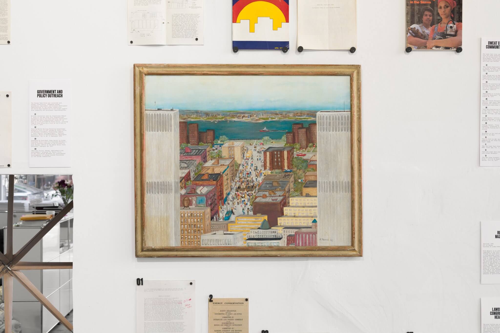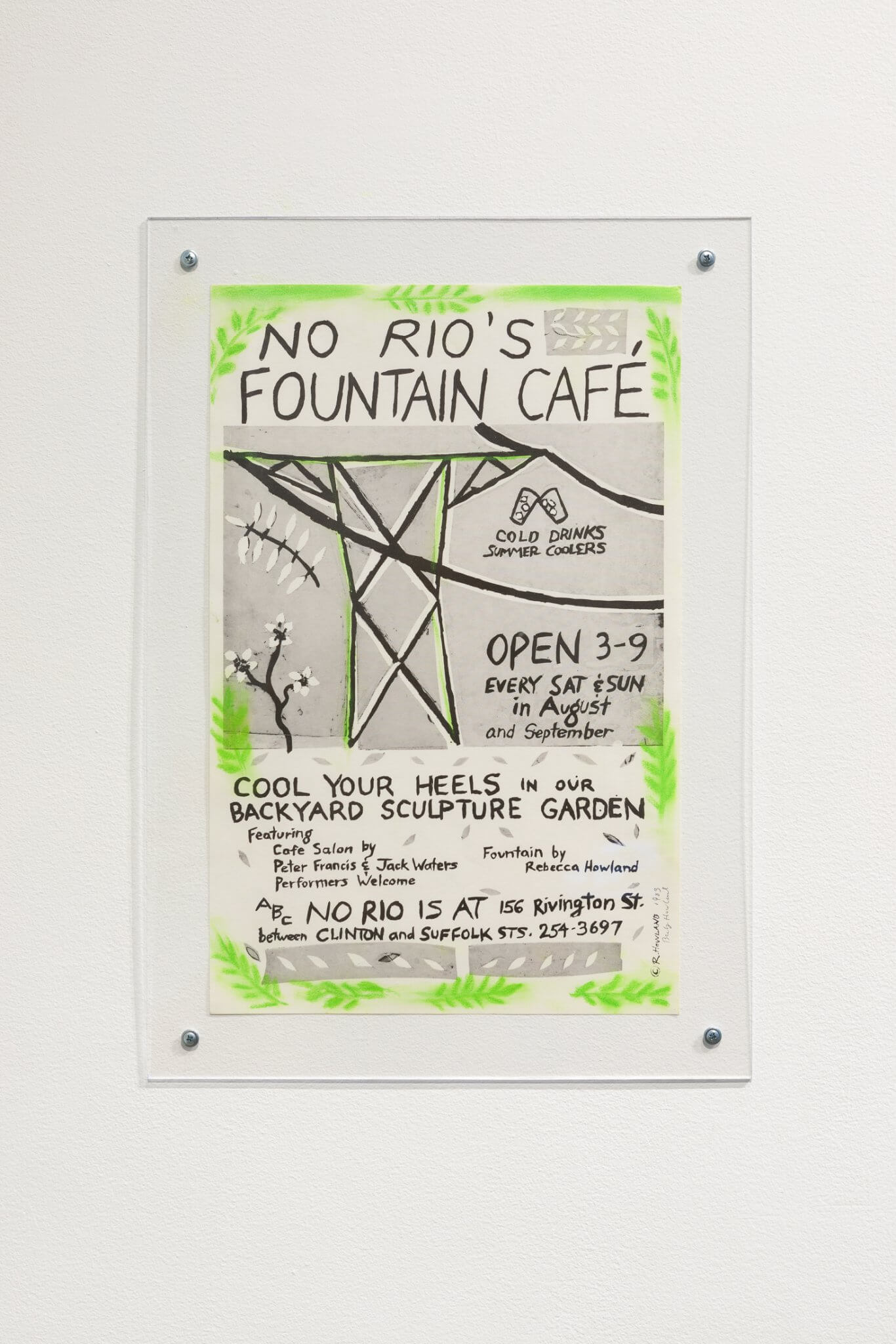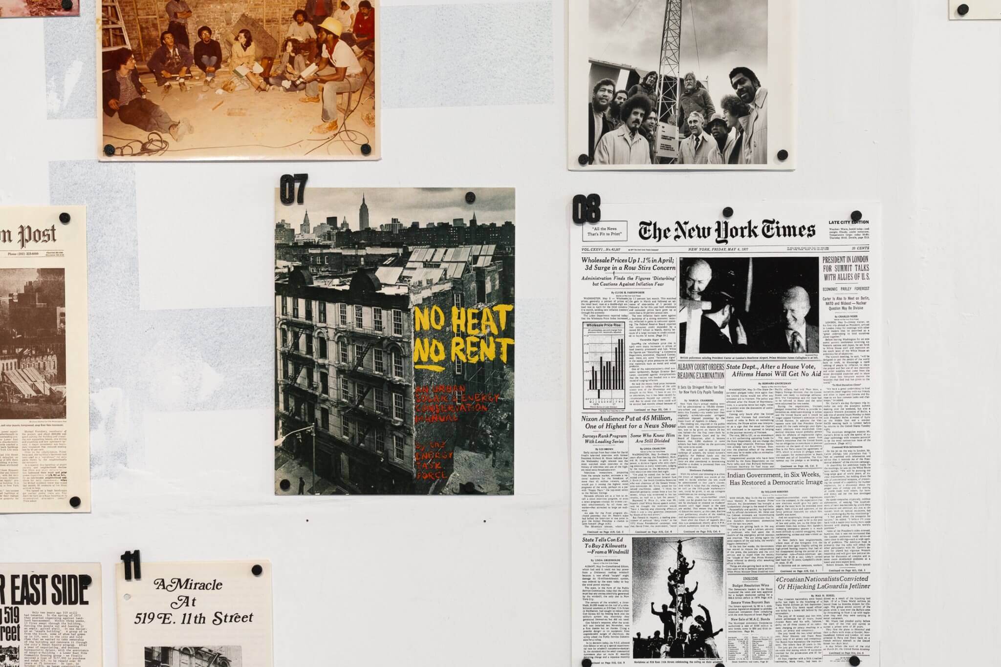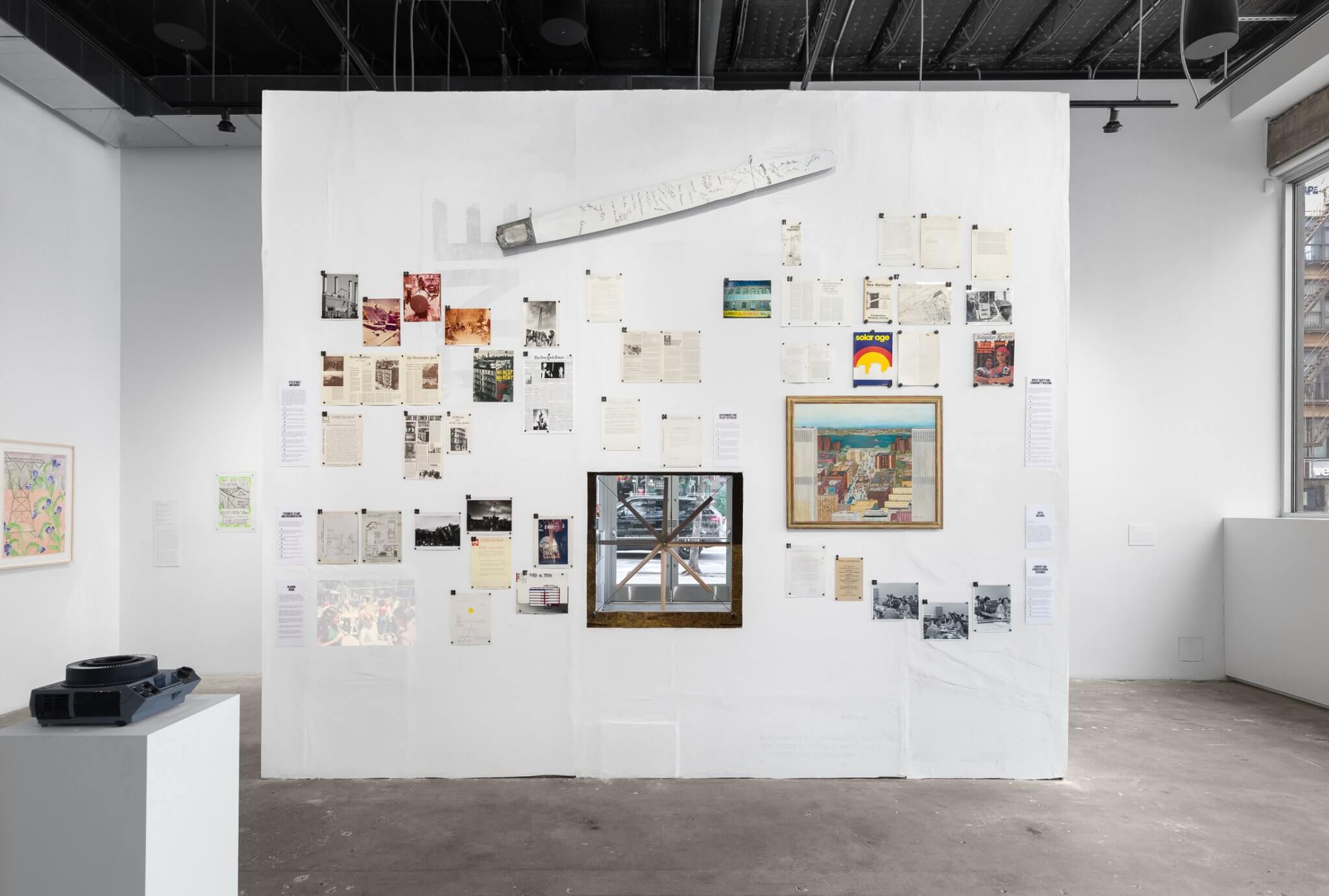 A wall built from discarded architectural elements sourced from exhibitions across the city, devised by New Affiliates, serves as the base for archival material gathered during an extensive research period, undertaken together with many of the individuals involved in the original sweat equity co-op at 519 E 11th Street. This includes photographs, film, legal documents, and a painting of the community by Ruth Nazario—an artist, a resident in the building, and a central figure in the neighborhood at that time. A cutout in the wall also houses Nick Raffel’s balsa wood fan, self-reflexively making visible and aiding the air flow throughout SI’s building. Installed nearby is a wall sculpture, Oil Tankers on Fire, and three watercolors of energy infrastructure combined with weeds, by Becky Howland. Howland is a cofounder of ABC No Rio, a collectively run community art and activism center on New York’s Lower East Side, for which she designed the poster featured here, for activities in and around her sculptural installation entitled Brainwash (1982).
