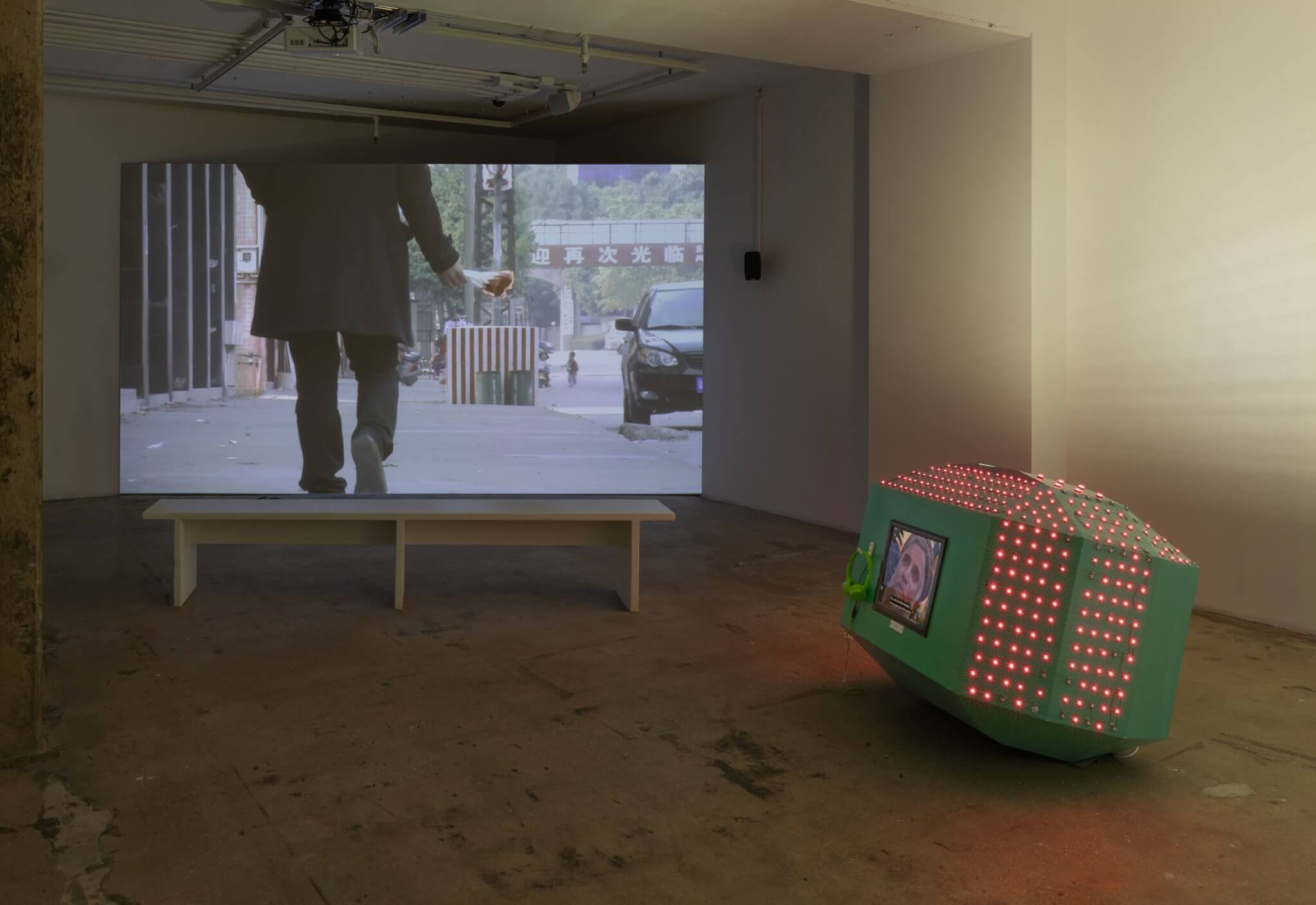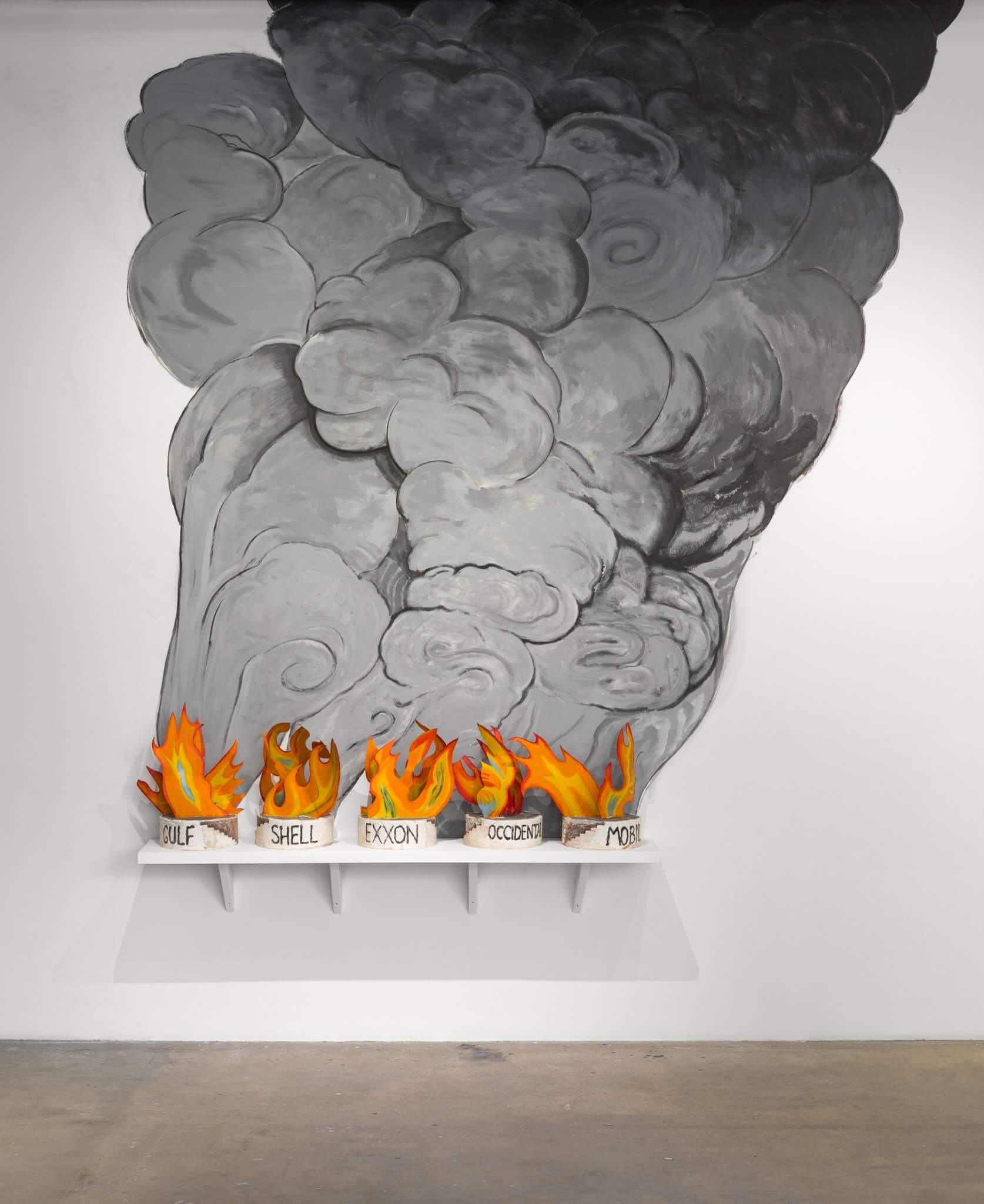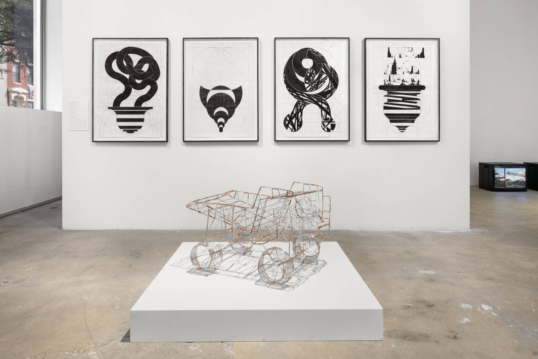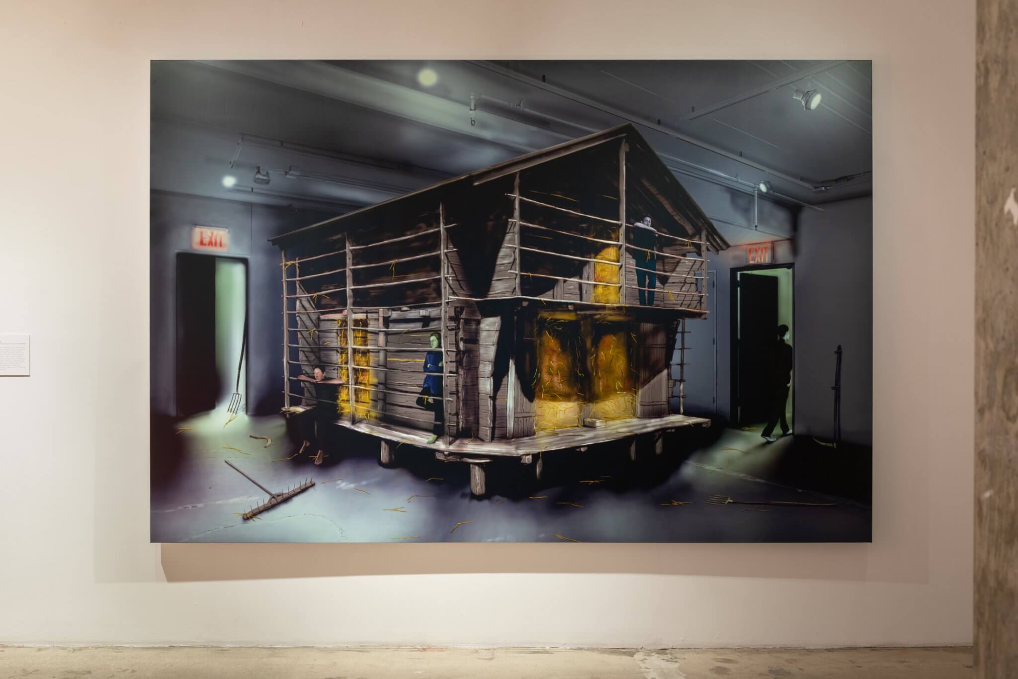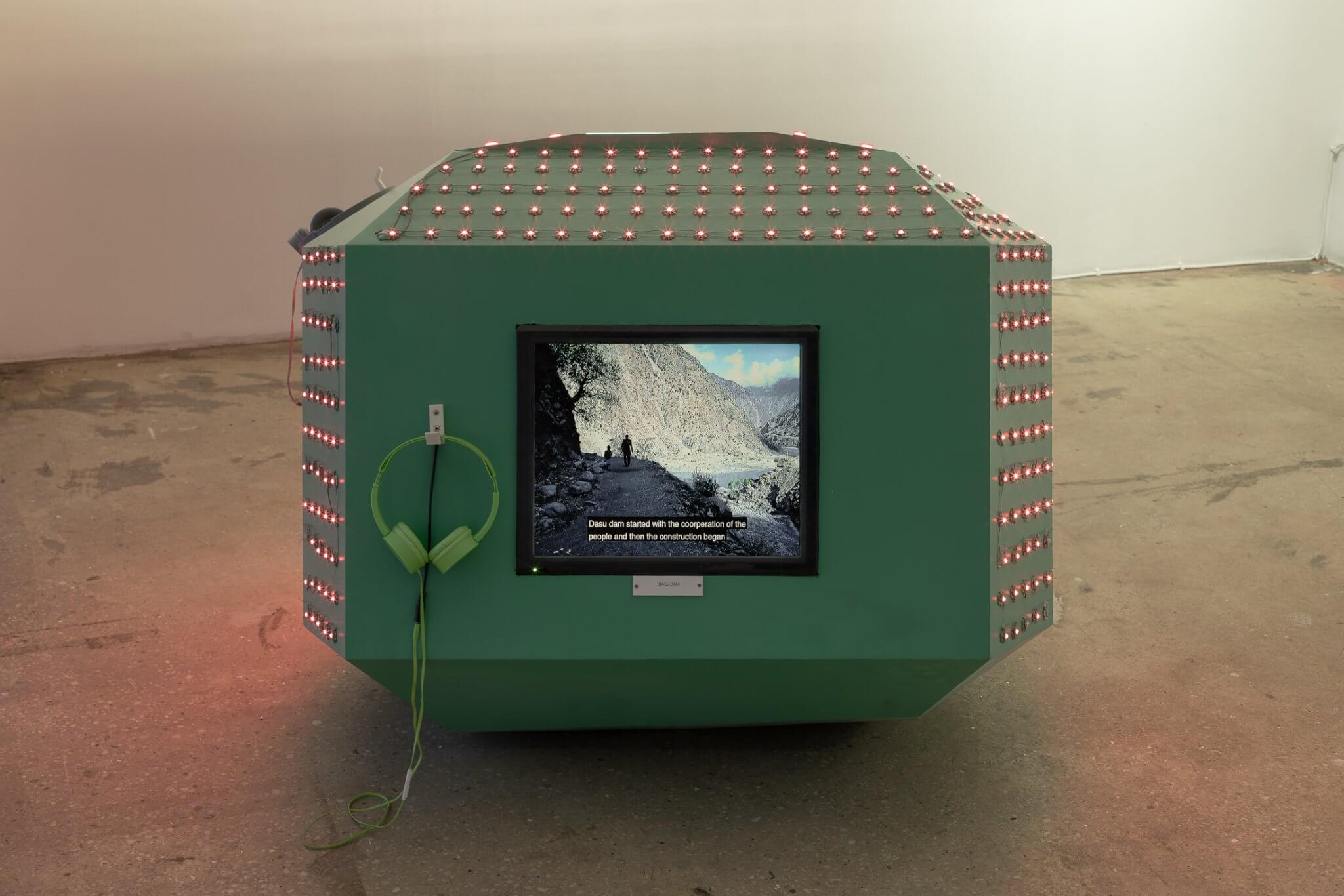 In the lower-level gallery, Louisa Gagliardi’s digitally rendered painting of an ambiguously glowing hay shed imagined within the space it is exhibited in, inhabited by four characters along with rakes and sickles strewn about, connects parochial pasts with digital futures. Facing the work is Liu Chuang’s video grappling with the rapid development, changing economies, and recent decline of industry in China juxtaposed with fire as one of the most ancient forms of energy harnessed by humans. Nearby, Saba Khan’s sculpture replicates the retro-futuristic shapes of hydropower plants installed with the support of the World Bank in the 1960s in post-partition Pakistan, addressing geopolitical implications of energy access.