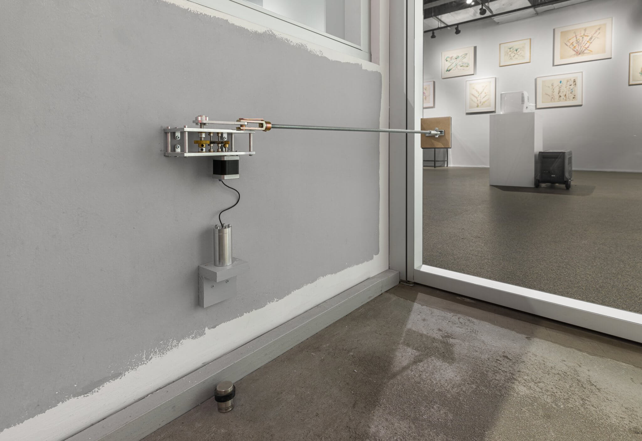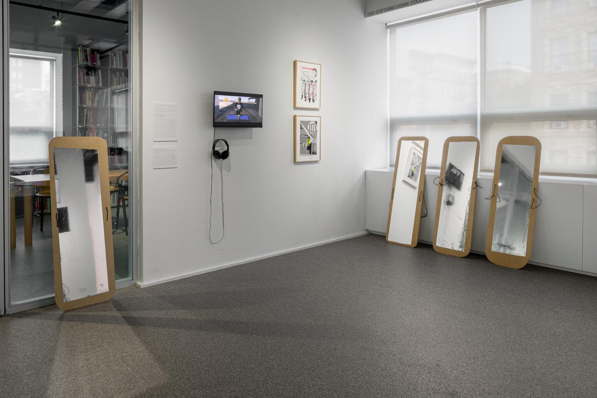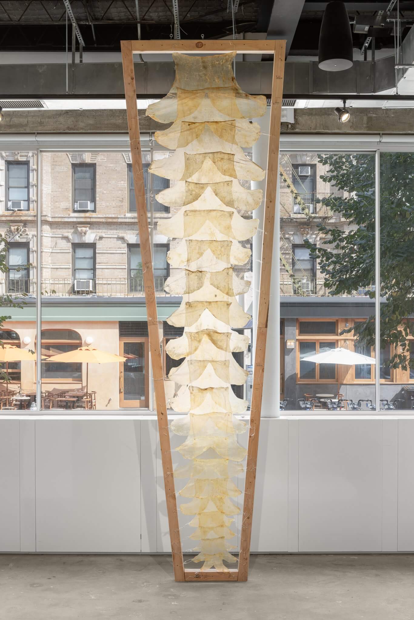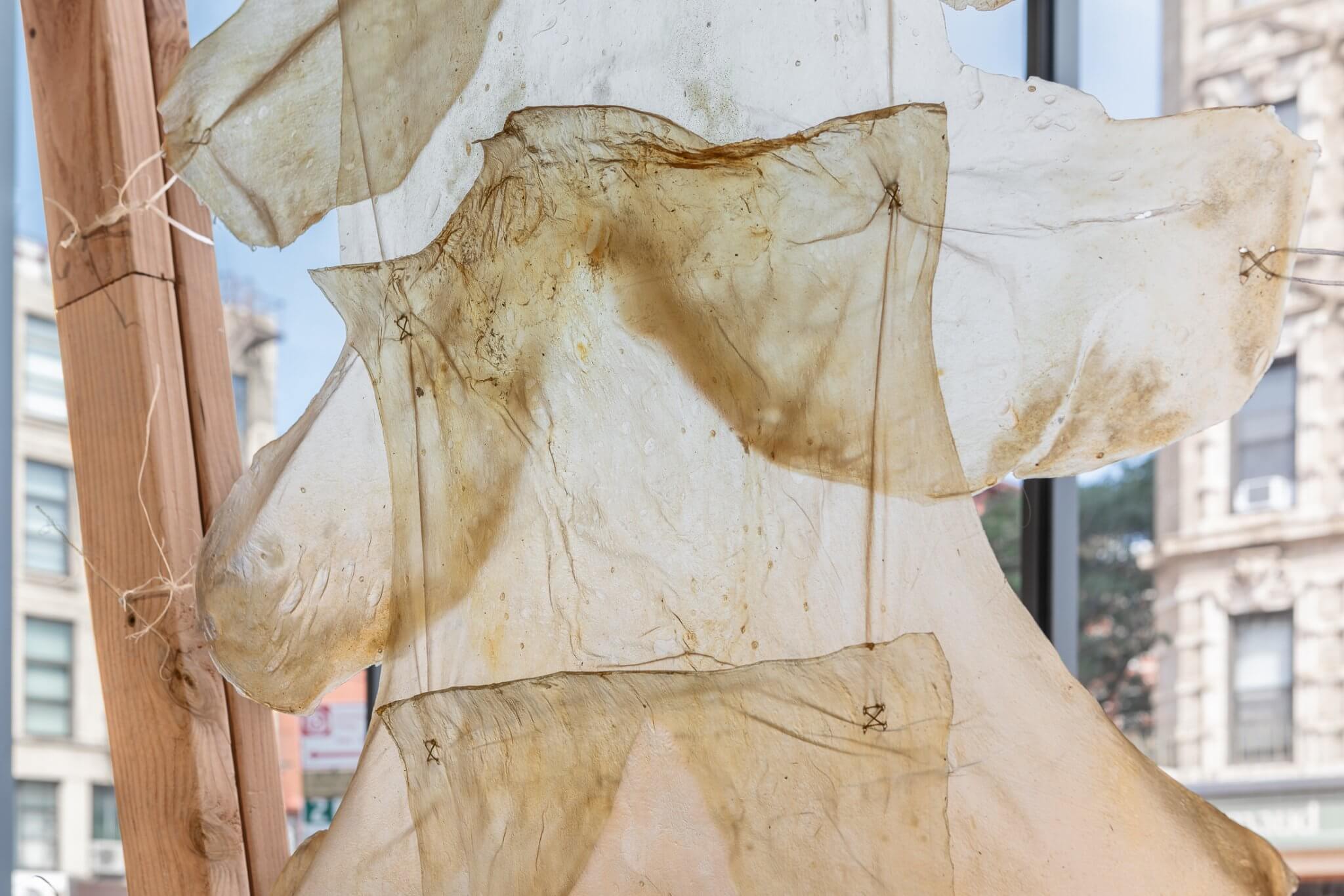 In the same gallery, Jean Katambayi Mukendi’s Afrolampe drawings and sculpture tend to global structural inequities in the extraction of copper for the production of renewable energy technologies in Lubumbashi, DRC, where resources are abundant but power cuts are common. Similarly, Ximena Garrido-Lecca’s two-channel video, filmed in Cerro de Pasco, Peru, shows the scars that mining enabled through US-supported infrastructure left in the landscape—an industry that continues to seriously affect the health of the community living in one of the most contaminated places in the world. On view in the small gallery is a new iteration of Vibeke Mascini’s installation Instar. The work consists of a battery charged with the energy derived from the ashes of confiscated and incinerated cocaine. The unit powers a nebulizer which releases a scented essence based on ozone, an adrenaline-inducing smell resembling that of the air when lightning is about to strike. Set against a view of St Marks Pl, Joar Nango’s installation reinvents windows made by Sámi communities from stretched halibut stomachs, an Indigenous technology utilizing the material’s insulating properties and translucency.