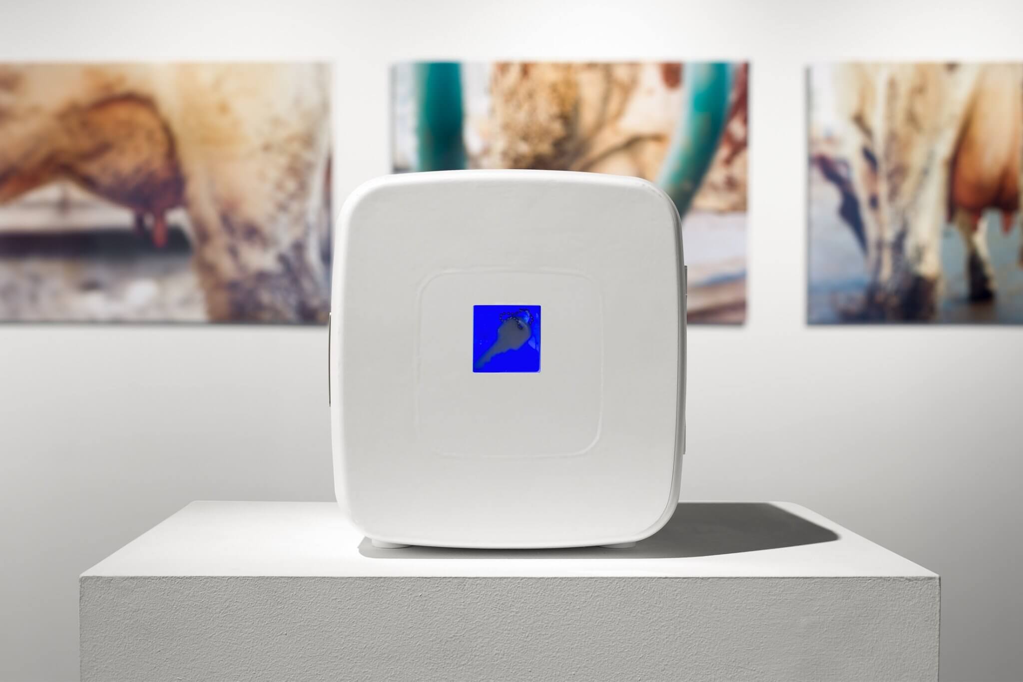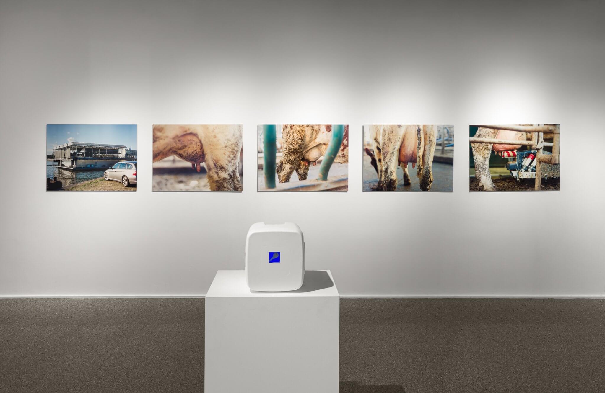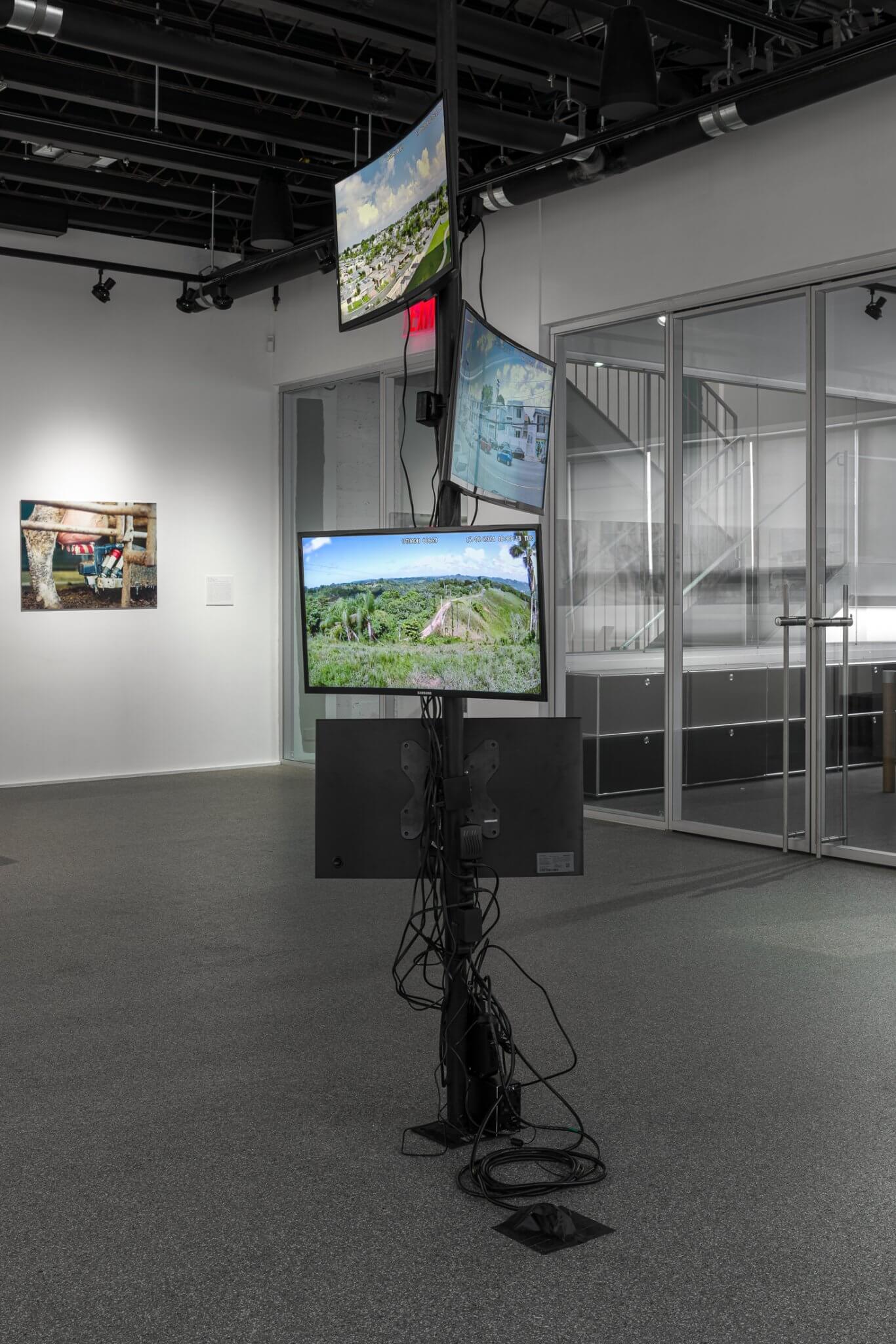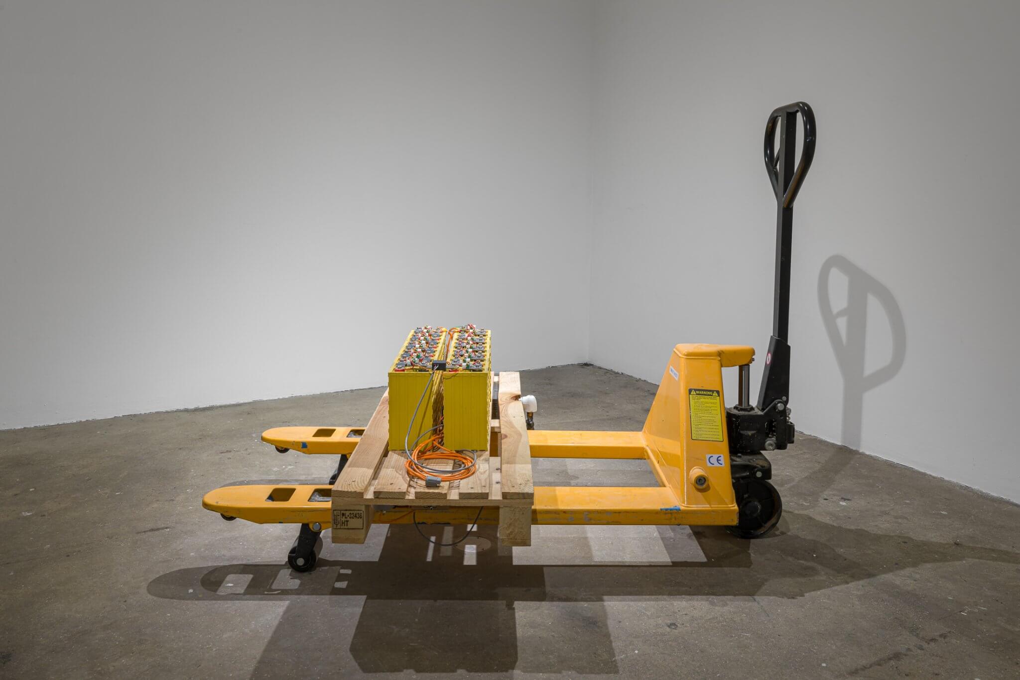On SI’s rooftop terrace, in the communal spirit of the 519 E 11th Street co-op, Haroon Mirza has created a solar panel installation that provides electrical charge for a sound piece by the artist as well as Ash Arder’s new installation on the second floor, comprising a fridge housing a sculpture made from perishable, culturally symbolic material. In accessing the second floor, visitors activate Agnieszka Kurant’s installation Living Currency, which turns the energy burnt by viewers as they open the door from kinetic into electrical energy stored in a battery. On view in the gallery is Gabriella Torres-Ferrer’s newly commissioned video installation transmitting live footage from four sites in Puerto Rico, whose infrastructure was devastated by Hurricane Maria in 2017. The cameras turn off and the broadcast is interrupted when the still frequent power outages occur. Nearby, Gina Folly’s simultaneously utopian and dystopian photographs document a floating solar-powered platform housing cows for milk production in the port of Rotterdam, addressing food, sustenance, and urban planning.
