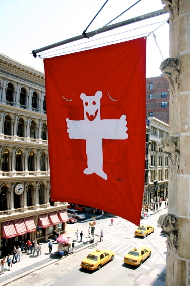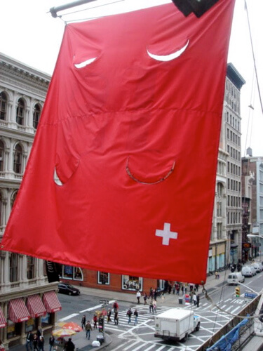 The Swiss Institute commissioned Olivier Mosset, a 2008 Whitney Biennial artist, to re-design the Swiss flag. Mosset merges both the red of Switzerland with that of Communism, so that the Red’s flag may hang on Broadway. On its backside, in a moment of detournement, Mosset inverts the SI logo to be IS, a tongue in cheek reference to Guy Debord and the International Situationists.