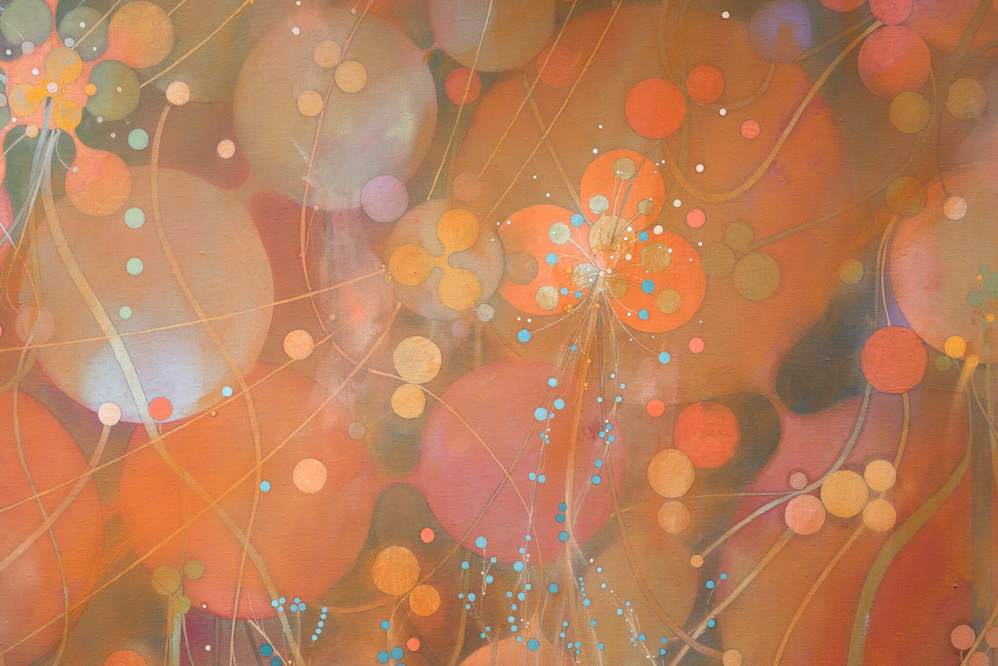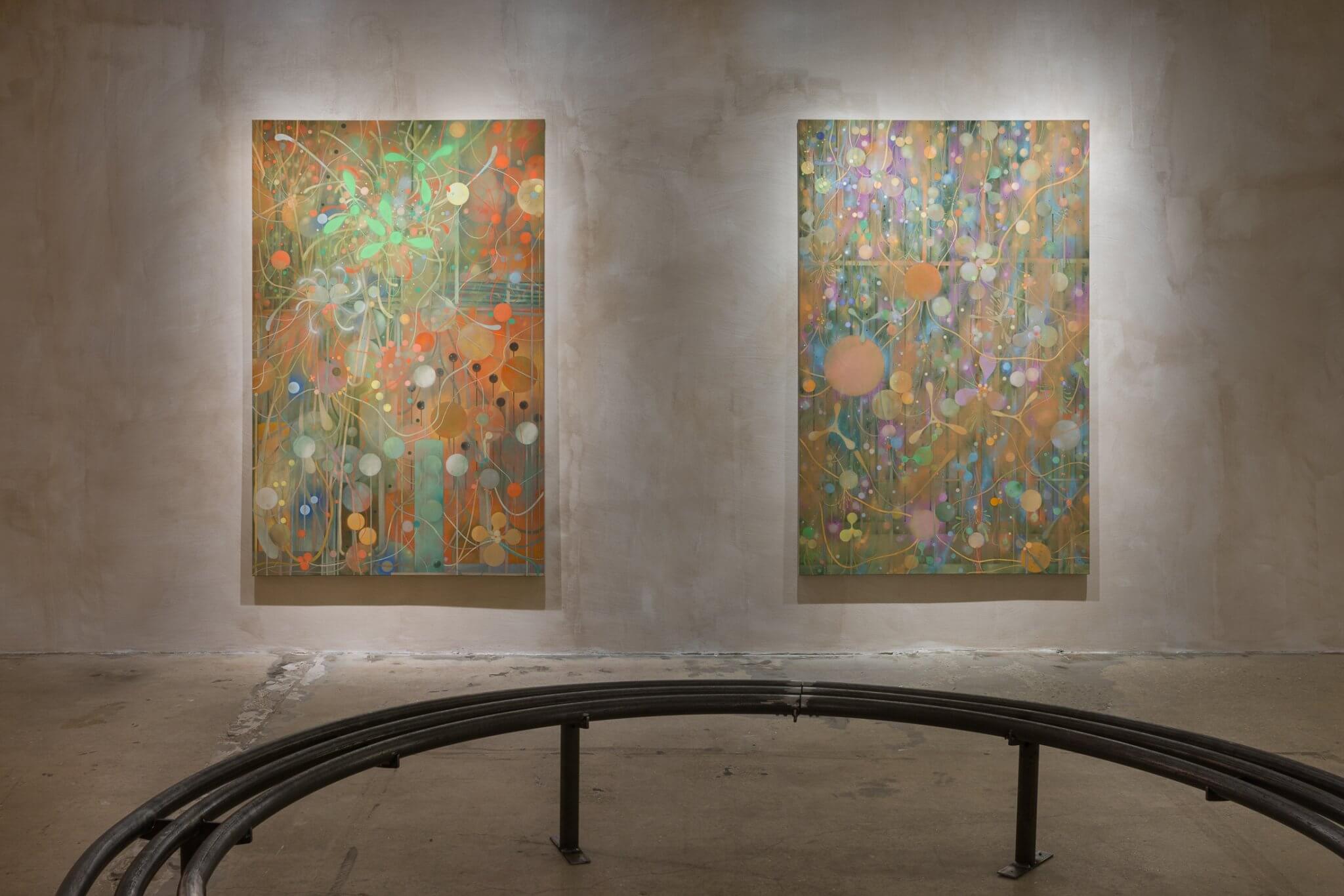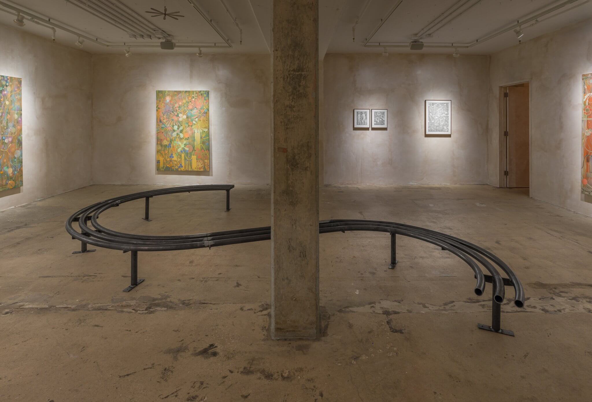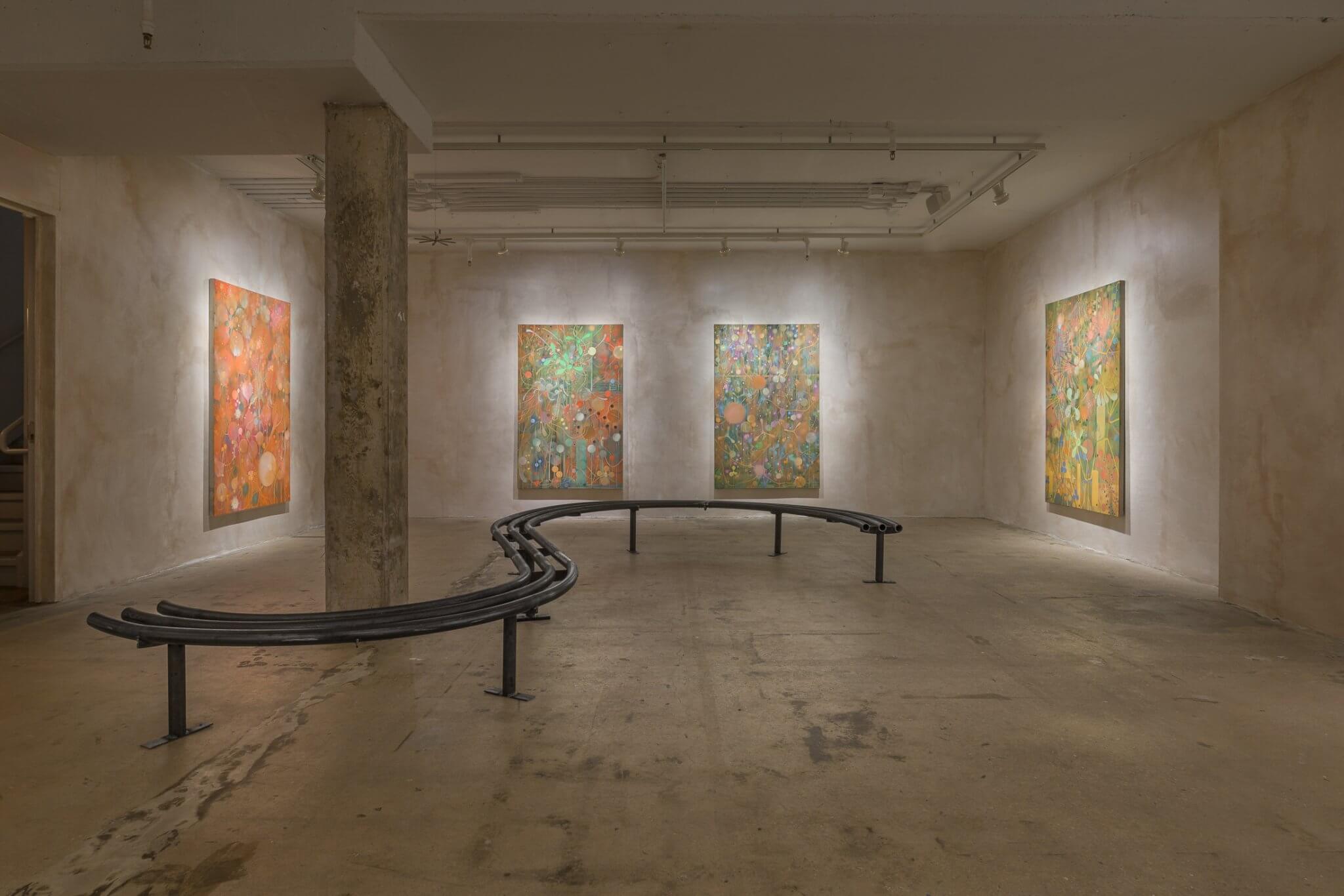 The exhibition invites visitors to linger and gaze into its kaleidoscopic networks, each of which possesses a harmony that suggests dreamy inertia. People rarely appear in Dénervaud’s work and when they do, they are usually suspended within the apparatus depicted. In Ozoned Station, each painting presents an opportunity to be subsumed by unfamiliar cycles of growth.