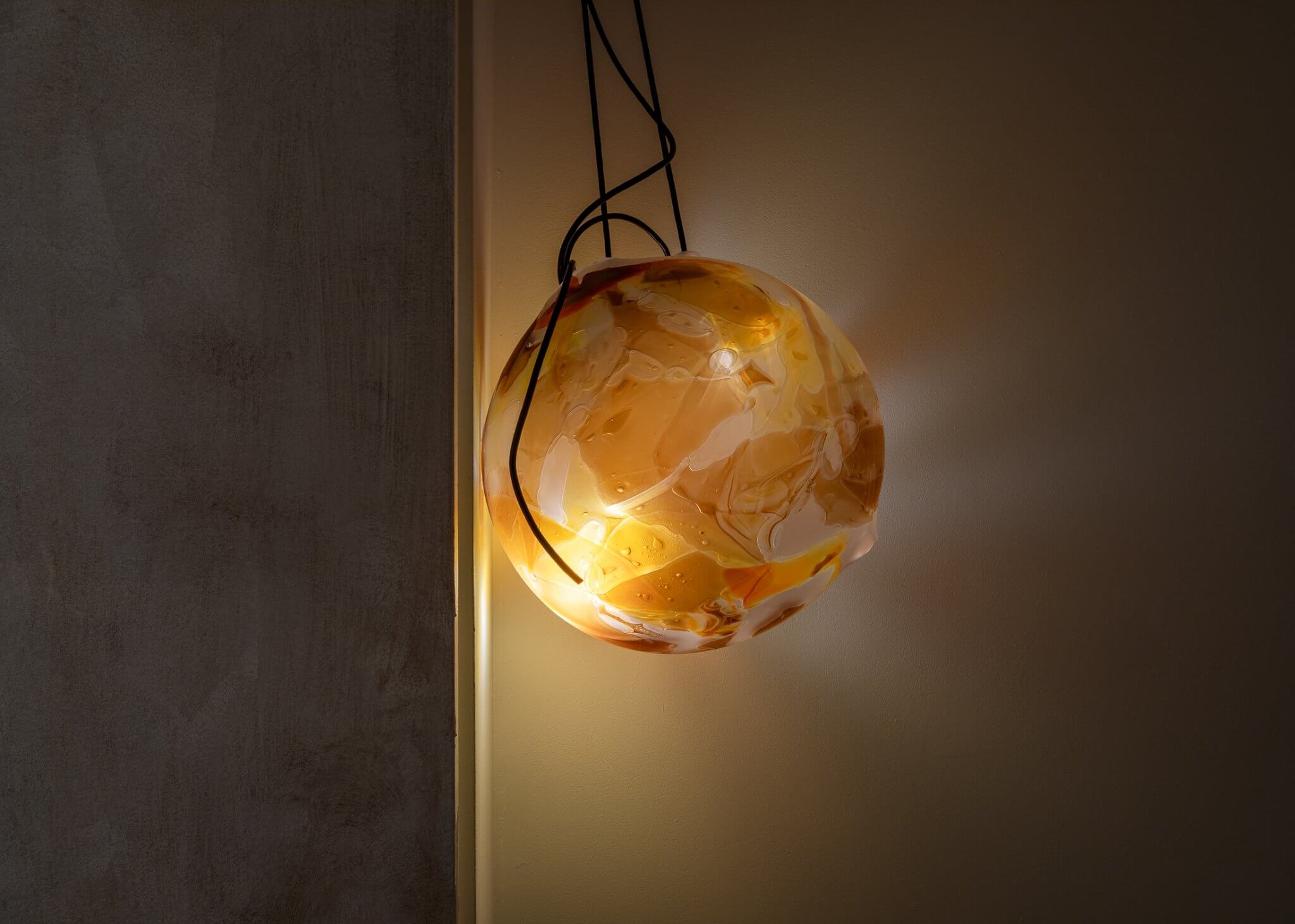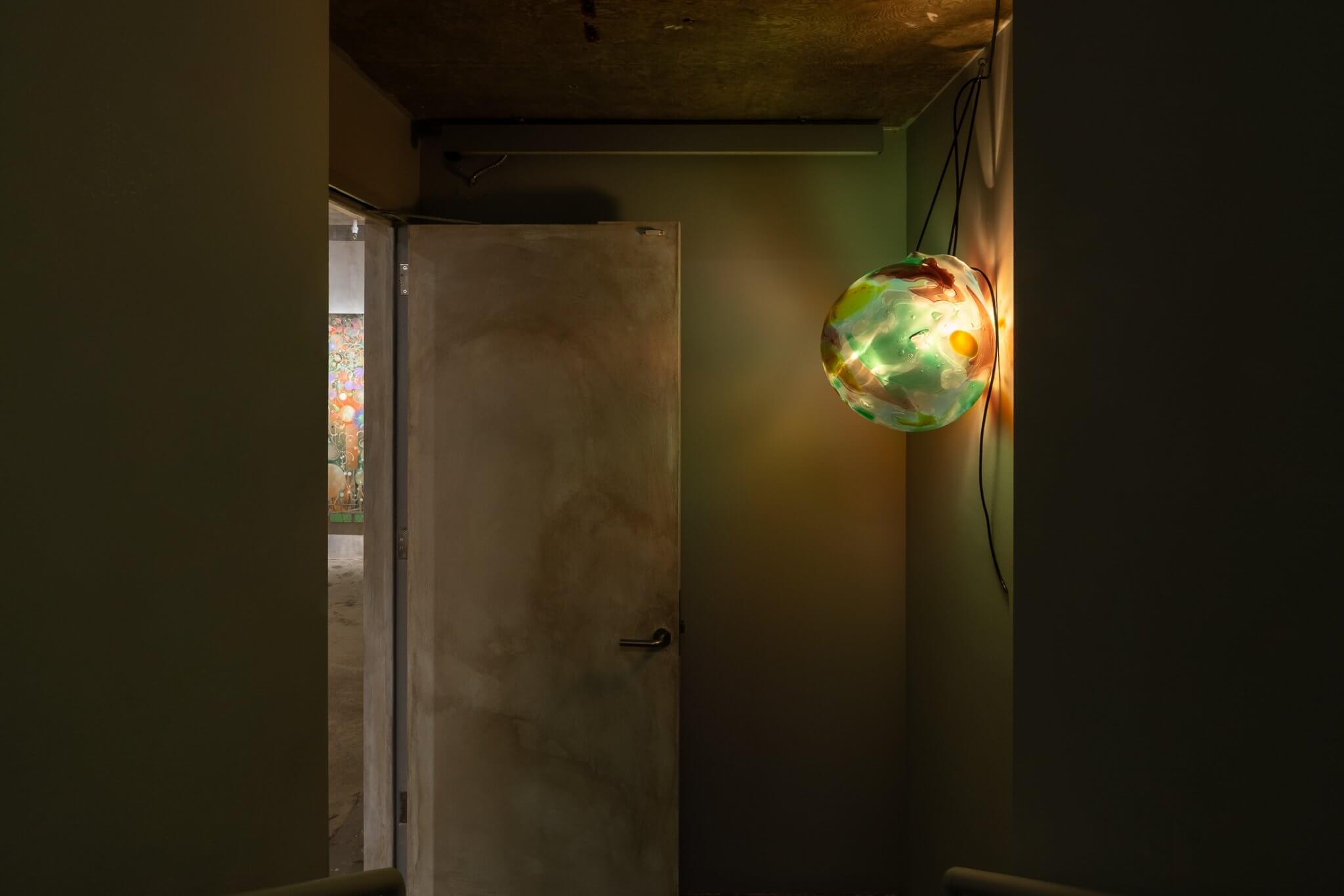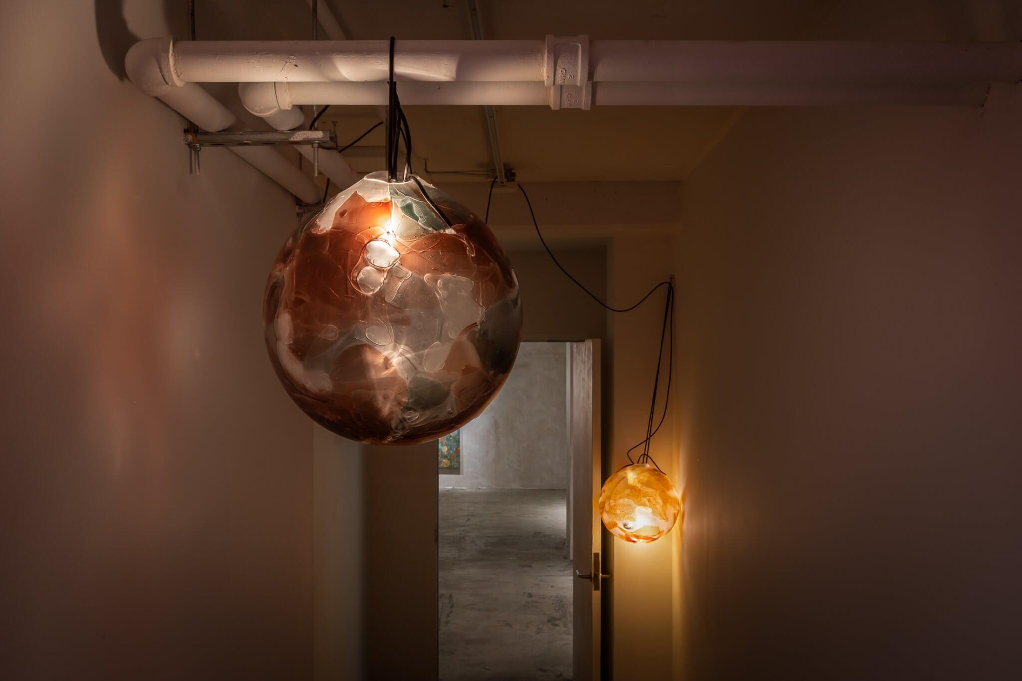 A residue coats the walls of the gallery. Evocative of the sticky dust that accumulates in an urban tunnel or on subway platforms, this patina is made by mixing paint with umber, a natural pigment whose artistic uses date to Neolithic cave painting, which is today burnt in coal-fired power plants to produce electricity. In the adjacent hallway and stairwell, hand-blown glass lanterns, like extracted organs or abandoned planets, hang loose from the ceiling and glow.