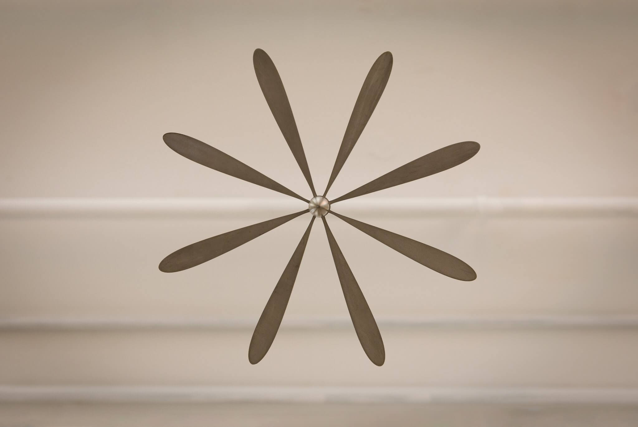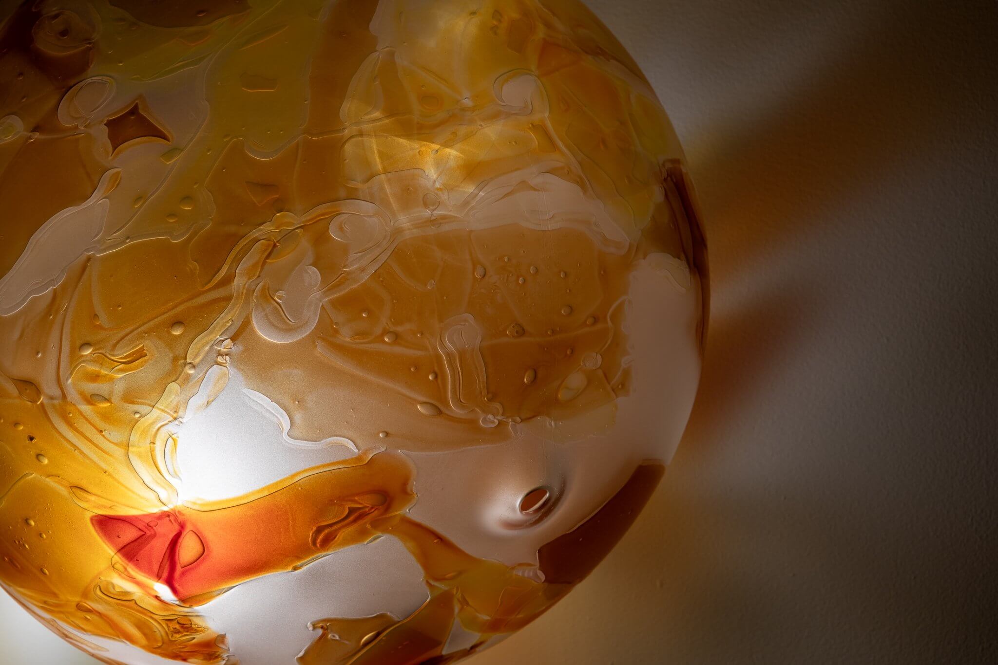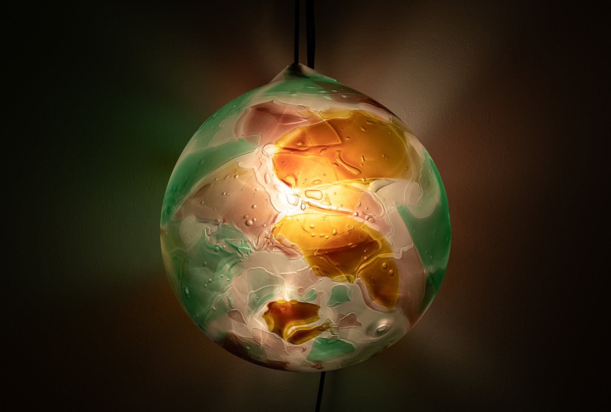 A residue coats the walls of the gallery. Evocative of the sticky dust that accumulates in an urban tunnel or on subway platforms, this patina is made by mixing paint with umber, a natural pigment whose artistic uses date to Neolithic cave painting, which is today burnt in coal-fired power plants to produce electricity. In the adjacent hallway and stairwell, hand-blown glass lanterns, like extracted organs or abandoned planets, hang loose from the ceiling and glow.