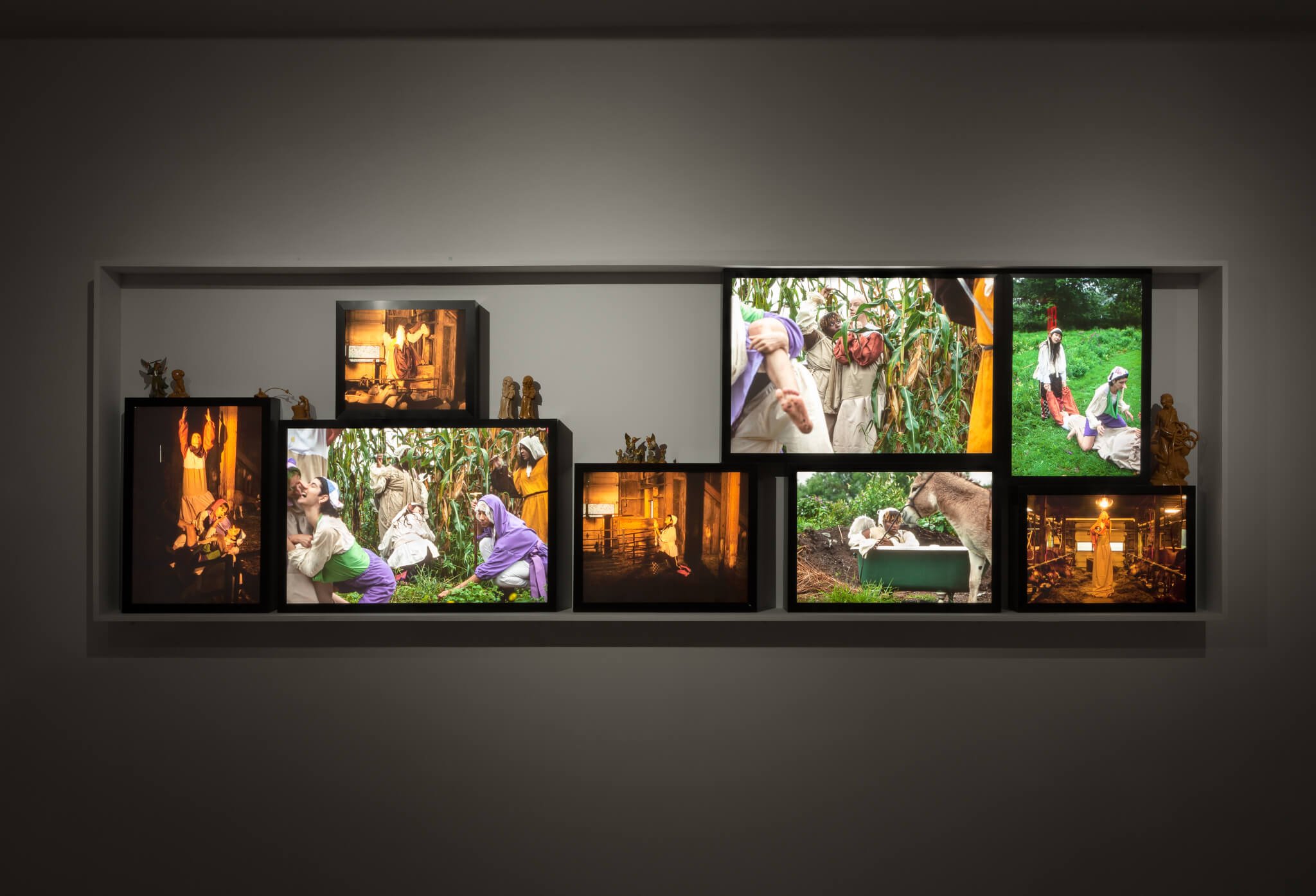 The Mirror of Simple Souls Who are Annihilated and Remain Only in Will and Desire of Love, 2018. Light-boxes, plastic religious figurines 48 x 149 x 7 in (121.9 x 378.5 x 17.8 cm). Courtesy of the artist, Bodega, New York, and Veda, Florence.