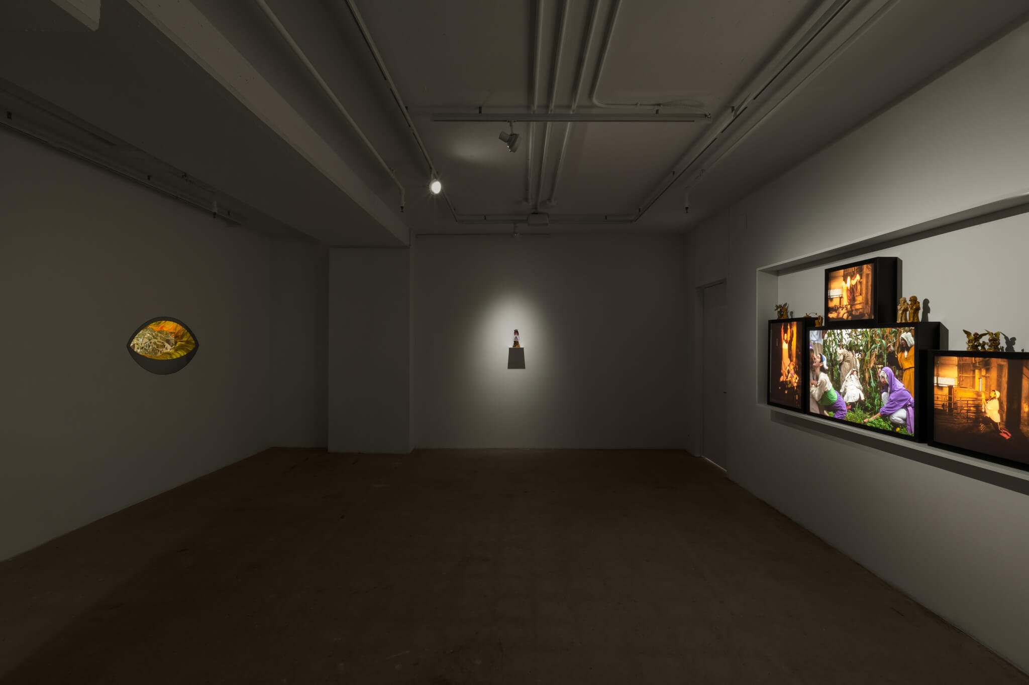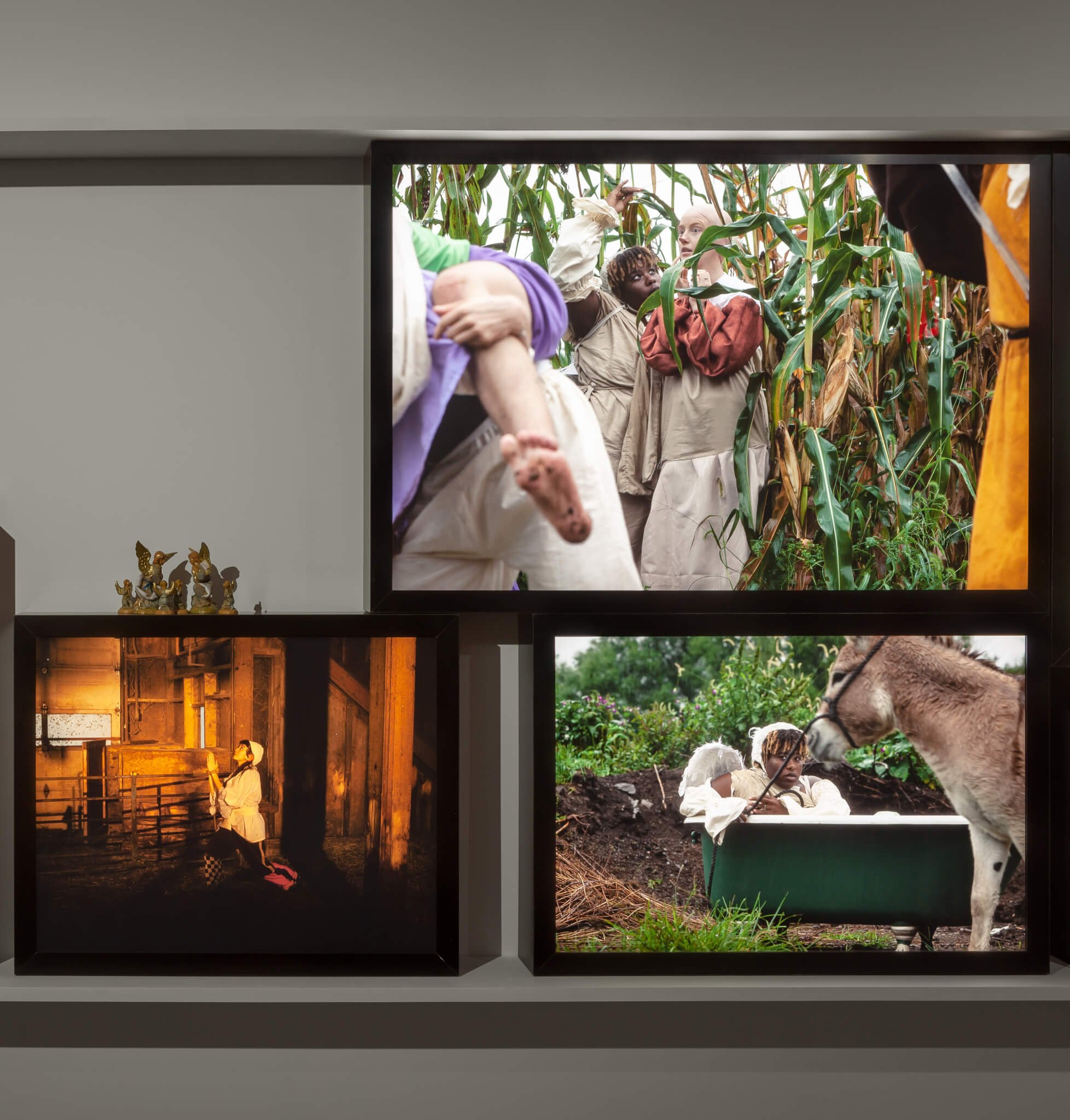 A series of photographic works, entitled The Mirror of the Simple Souls Who Are Annihilated and Remain Only in Will and Desire of Love (2018), is displayed on light boxes. Wearing theatrical, brightly colored costumes reminiscent of those used in school nativity plays, as well as prosthetic ears, wings and noses, a group of Silverman’s friends are pictured posing at a farm in upstate New York. Using familiar compositional strategies from Catholic iconography as well as William Blake etchings, the figures are captured in scenes of prayer and mischief, in a form of Biblical cosplay that suggests the endless variations on those scenes as well as a potential for infinite, and even subversive, interpretation.
