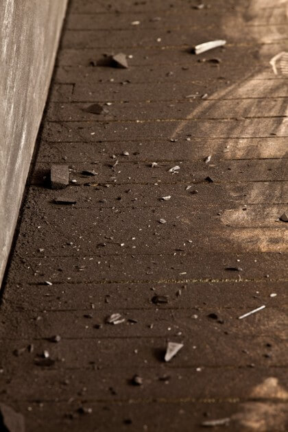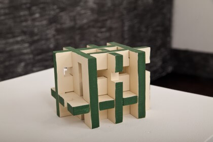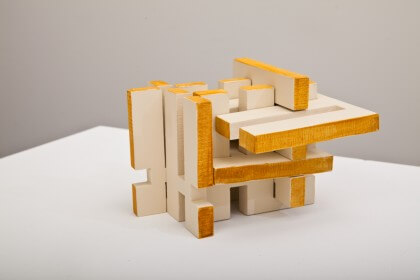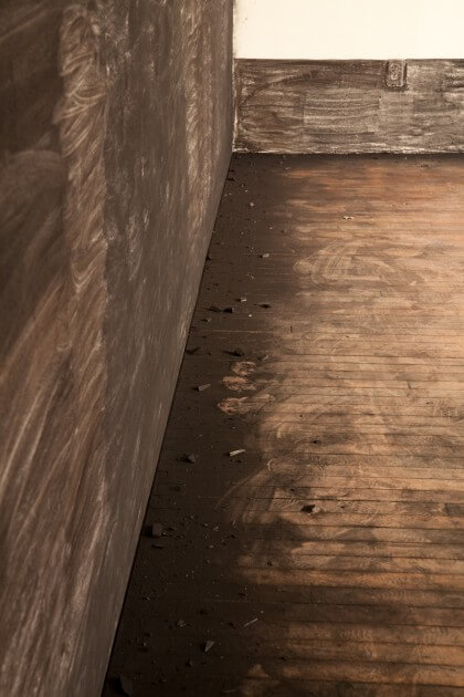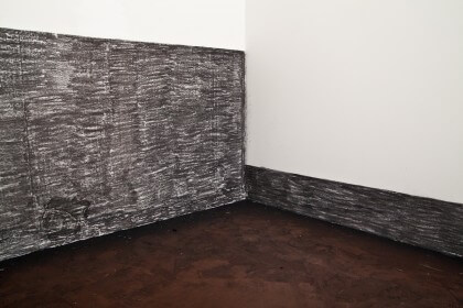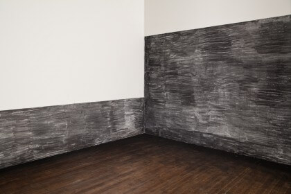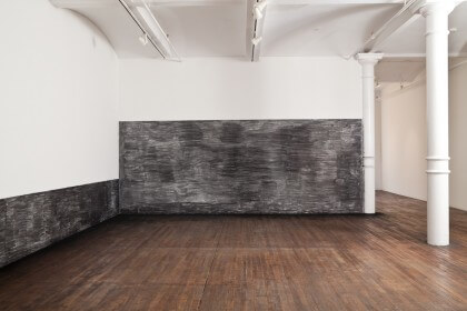 In her first institutional solo exhibition in the United States, Latifa Echakhch presents a new body of work. The site-specific installation Plaintes (complaints) is inspired by The Modulor, a system of measurements developed by Swiss architect Le Corbusier. Echakhch applies the architect’s measures to eight charcoal wall drawings, which create an obscure pattern throughout the gallery. In addition, she displays small wooden brainteasers on pedestals. On a formal level they allude to the bag of tricks of modernism. The piece is consequently entitled HLM, after the subsidized housing complexes in the French banlieue. Furthermore, the large windows on Broadway are painted in a bright yellow, based on the substance Gaya (E102), a food coloring used as an inexpensive substitute for saffron in Asian cooking.