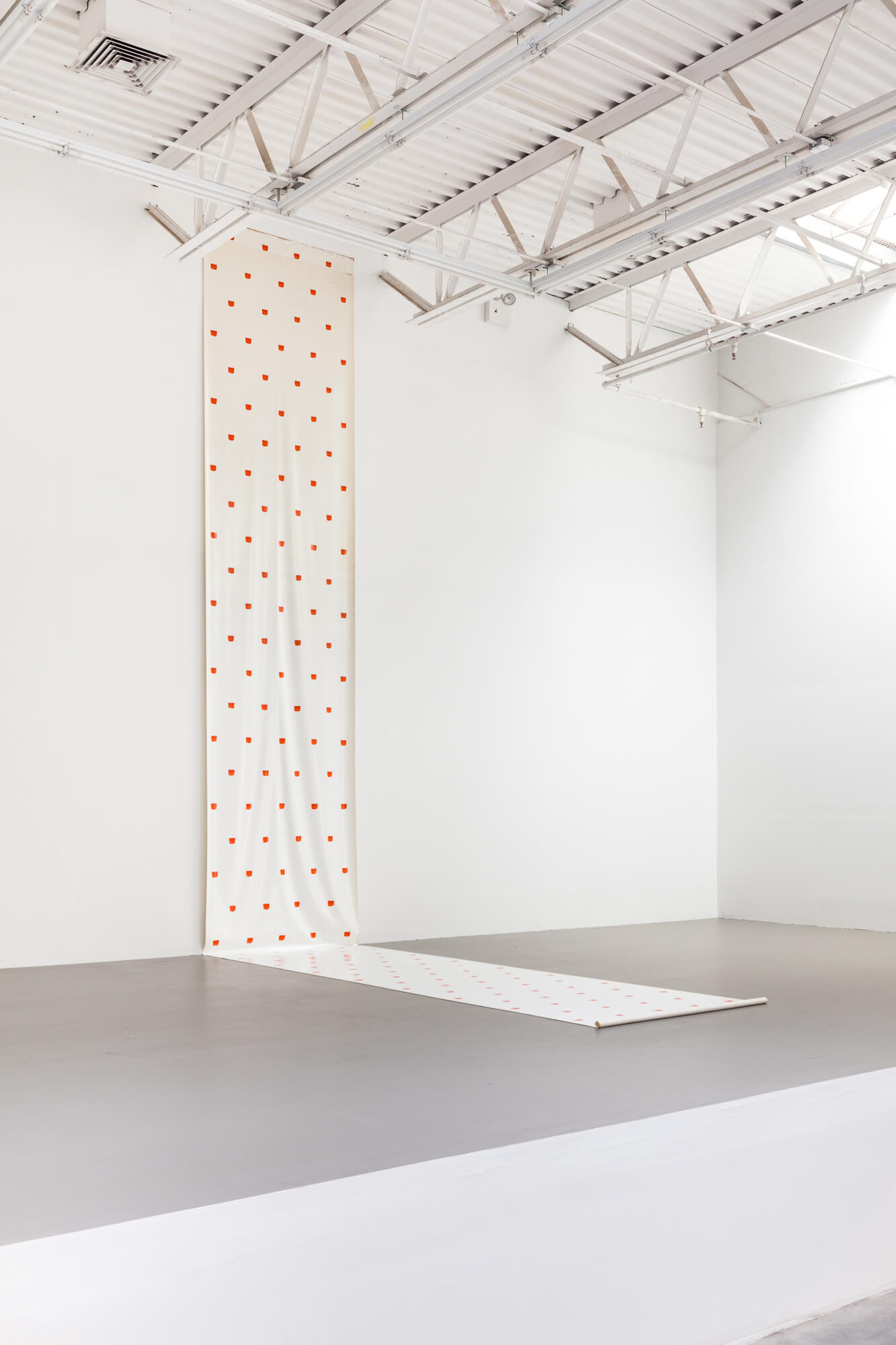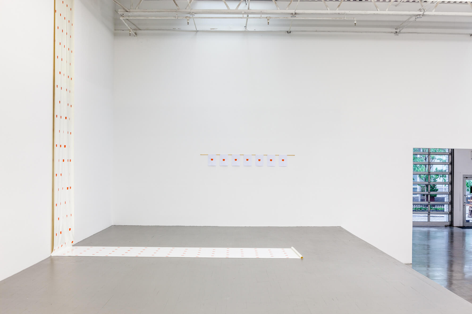 Since 1966, Niele Toroni (b. 1937, Muralto, Switzerland, lives and works in Paris) has applied imprints of a number 50 brush at regular intervals of 30 cm on a variety of surfaces and supports. For his first ever institutional solo show in NY and his first in the US in over 25 years, Swiss Institute presents an exhibition that spans close to 5 decades of the artist’s work, featuring imprints on waxed fabric, canvas, and paper, as well as new, site-specific works created for this show.