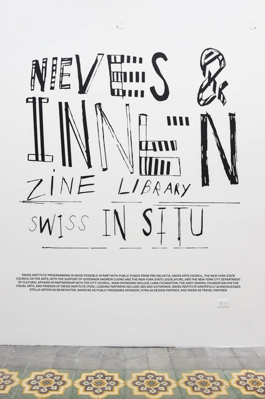 SWISS INSTITUTE PROGRAMMING IS MADE POSSIBLE IN PART WITH PUBLIC FUNDS FROM PRO HELVETIA, SWISS ARTS COUNCIL, THE NEW YORK STATE COUNCIL ON THE ARTS, WITH THE SUPPORT OF GOVERNOR ANDREW CUOMO AND THE NEW YORK STATE LEGISLATURE, AND THE NEW YORK CITY DEPARTMENT OF CULTURAL AFFAIRS IN PARTNERSHIP WITH THE CITY COUNCIL. MAIN SPONSORS INCLUDE LUMA FOUNDATION, THE ANDY WARHOL FOUNDATION FOR THE VISUAL ARTS, AND FRIENDS OF SWISS INSTITUTE (FOSI), LEADING PARTNERS INCLUDE UBS AND VICTORINOX. SWISS INSTITUTE GRATEFULLY ACKNOWLEDGES STELLA ARTOIS AS BENEFACTOR, SWISS RE AS PUBLIC PROGRAMS SPONSOR, VITRA AS DESIGN PARTNER, AND SWISS AS TRAVEL PARTNER.