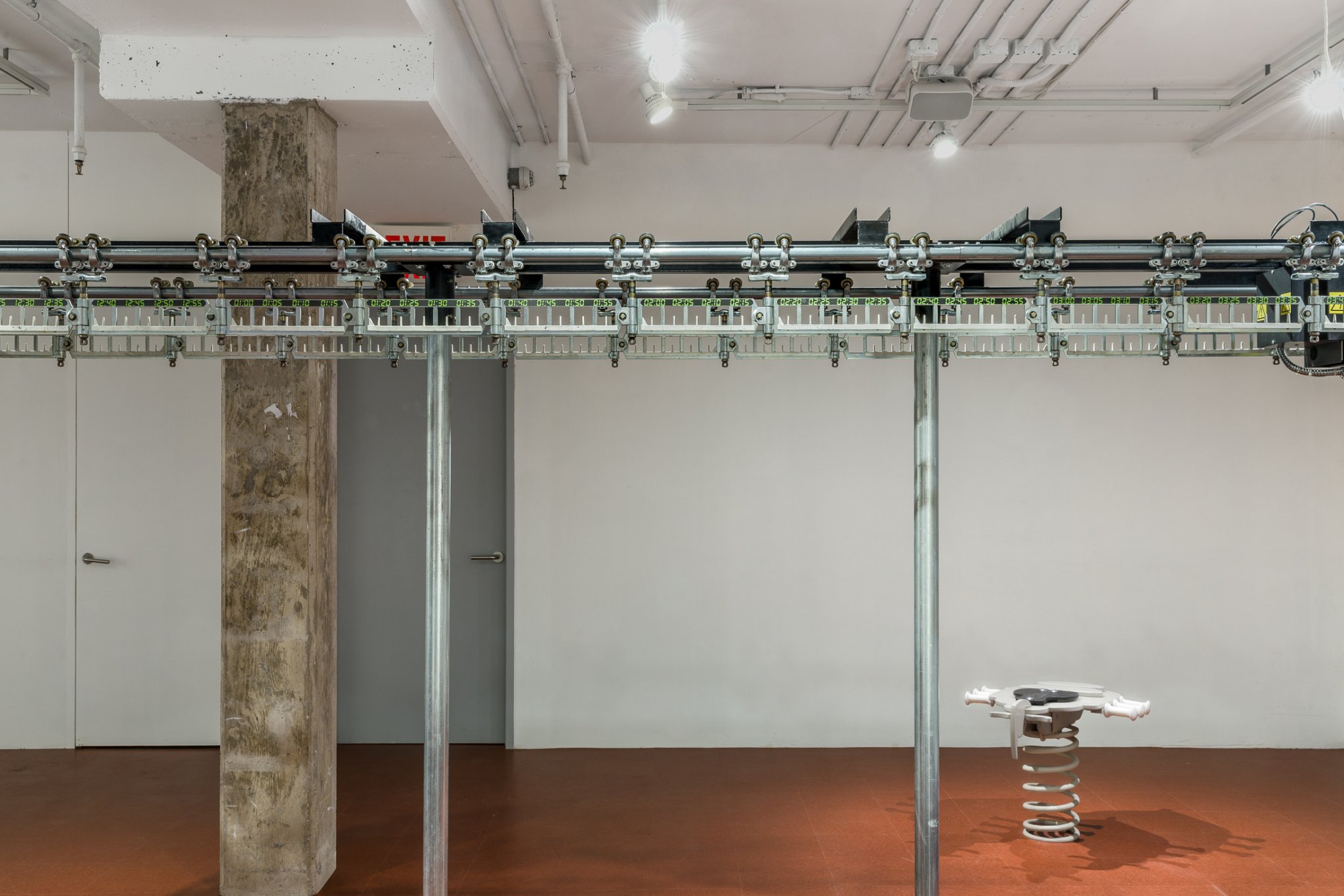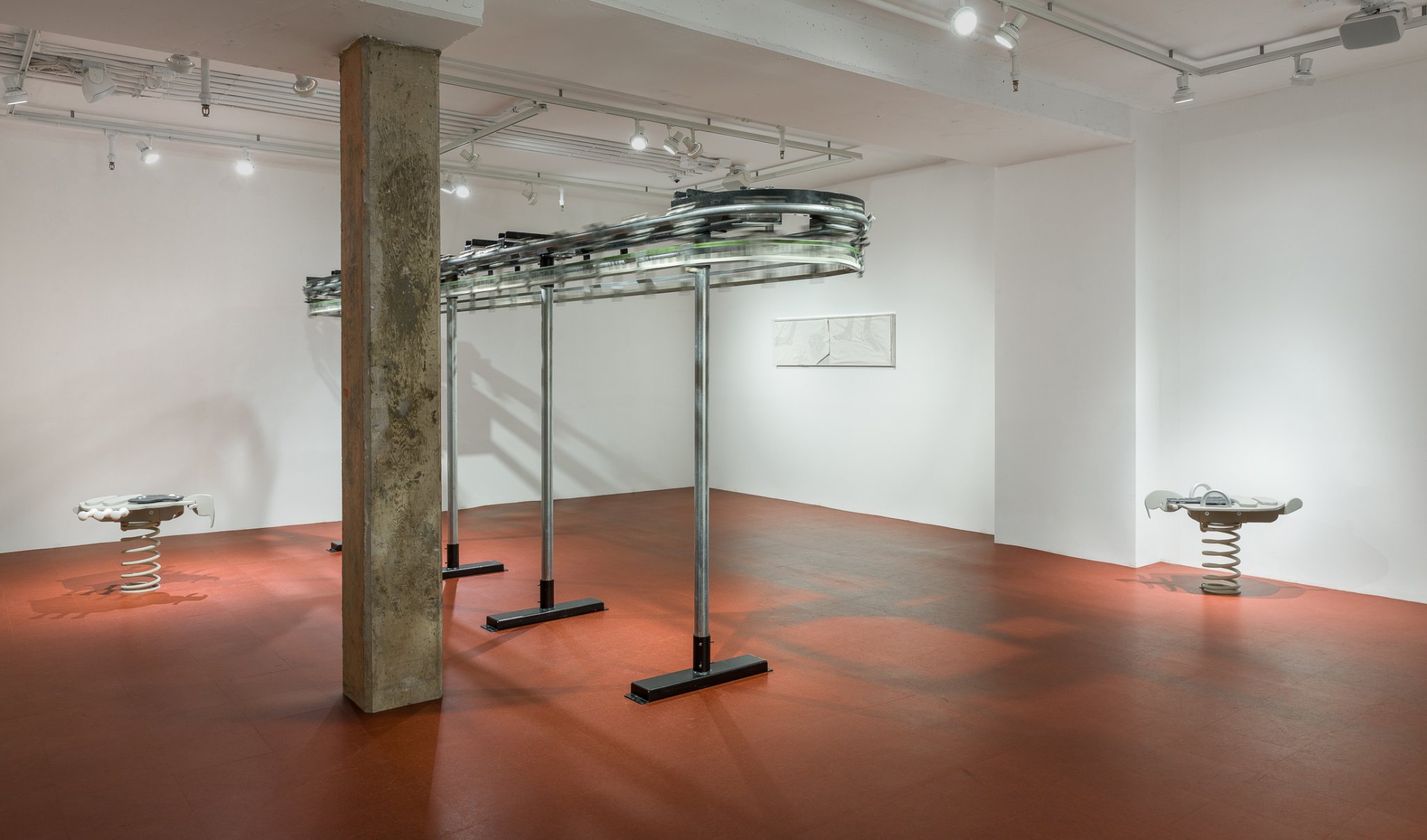 In the gallery, a garment conveyor cycles incessantly and generates a metallic rhythm. The numerals of a digital clock pass along this nervous circuit, an horological kopfkino. Four bedbugs, carved from wood, take form here as playground equipment, perched on spring coils. Varied in size, awkward and barbed with grips and handles, these parasites appear unable to accommodate riders. On the wall, silhouettes of fidgety bodies rendered in hand-made crochet reveal themselves within the fabric of rumpled bed sheets and pillowcases, evincing a night without sleep. These cut-outs, soft scabs, allude to bites and to healing.