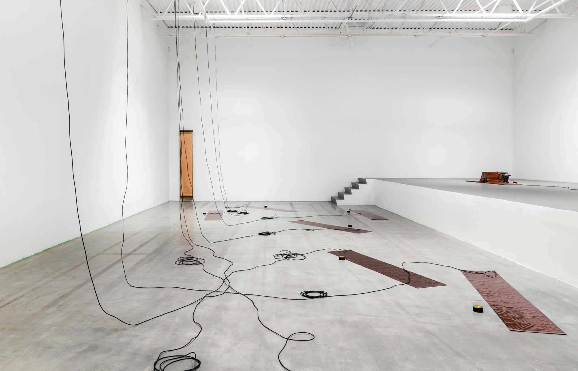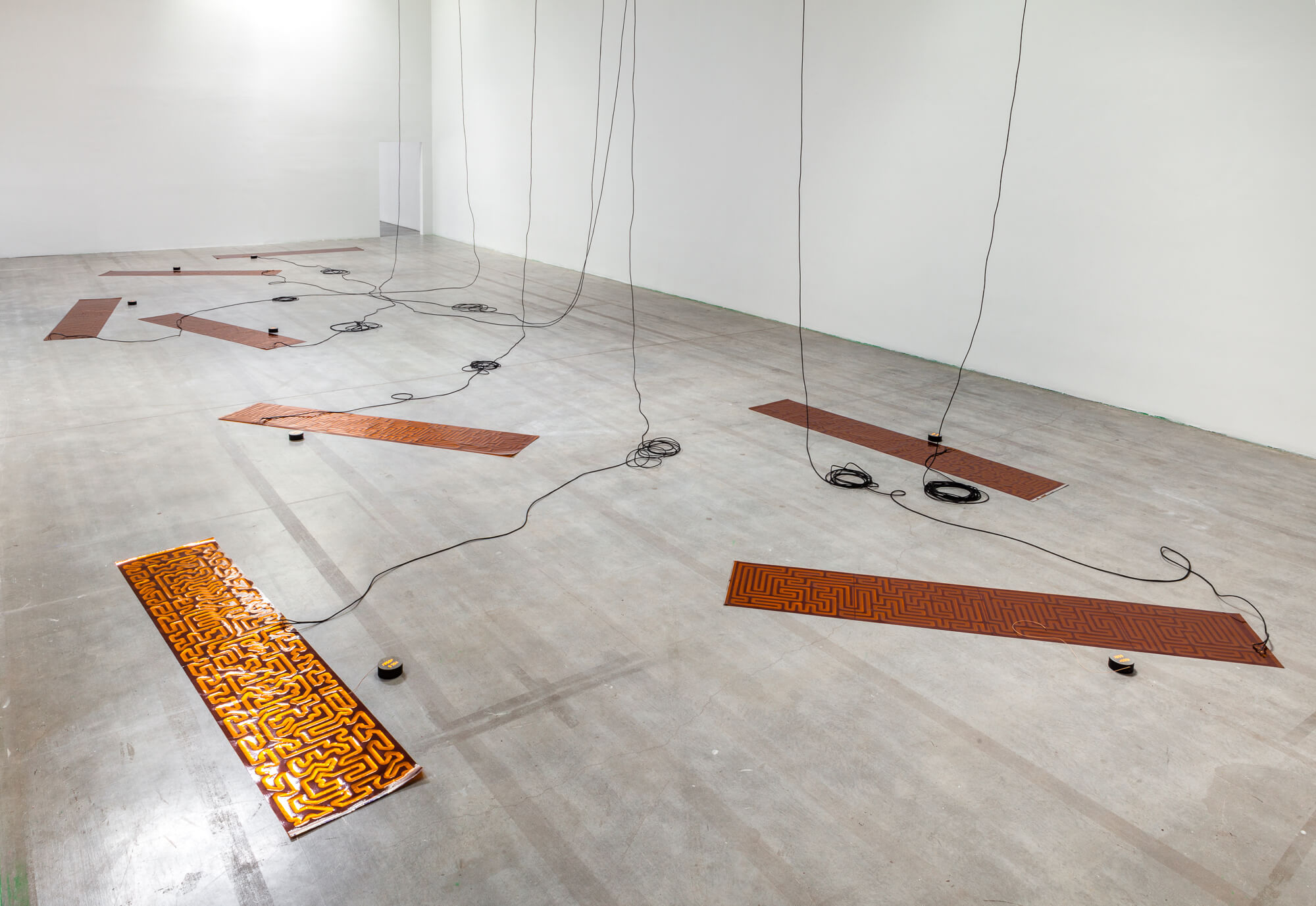 For Sam Lewitt’s first institutional solo exhibition in New York, entitled Less Light Warm Words, the artist has removed all of the fluorescent lights from the ceiling rig in Swiss Institute’s main gallery and redirected the total available electricity into custom-designed flexible copper heating circuits. These slim, sensitive micro heaters are larger versions of the kind used in precision technologies that require a regulated temperature in order to function smoothly, and are used everywhere from satellites to medical equipment. This transferal of energy – from light to heat, from ceiling to floor – reorganizes the building’s existing electrical infrastructure, delineating and redirecting usually imperceptible currents and flows.