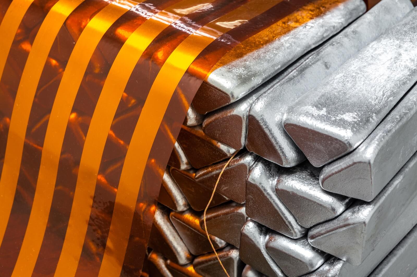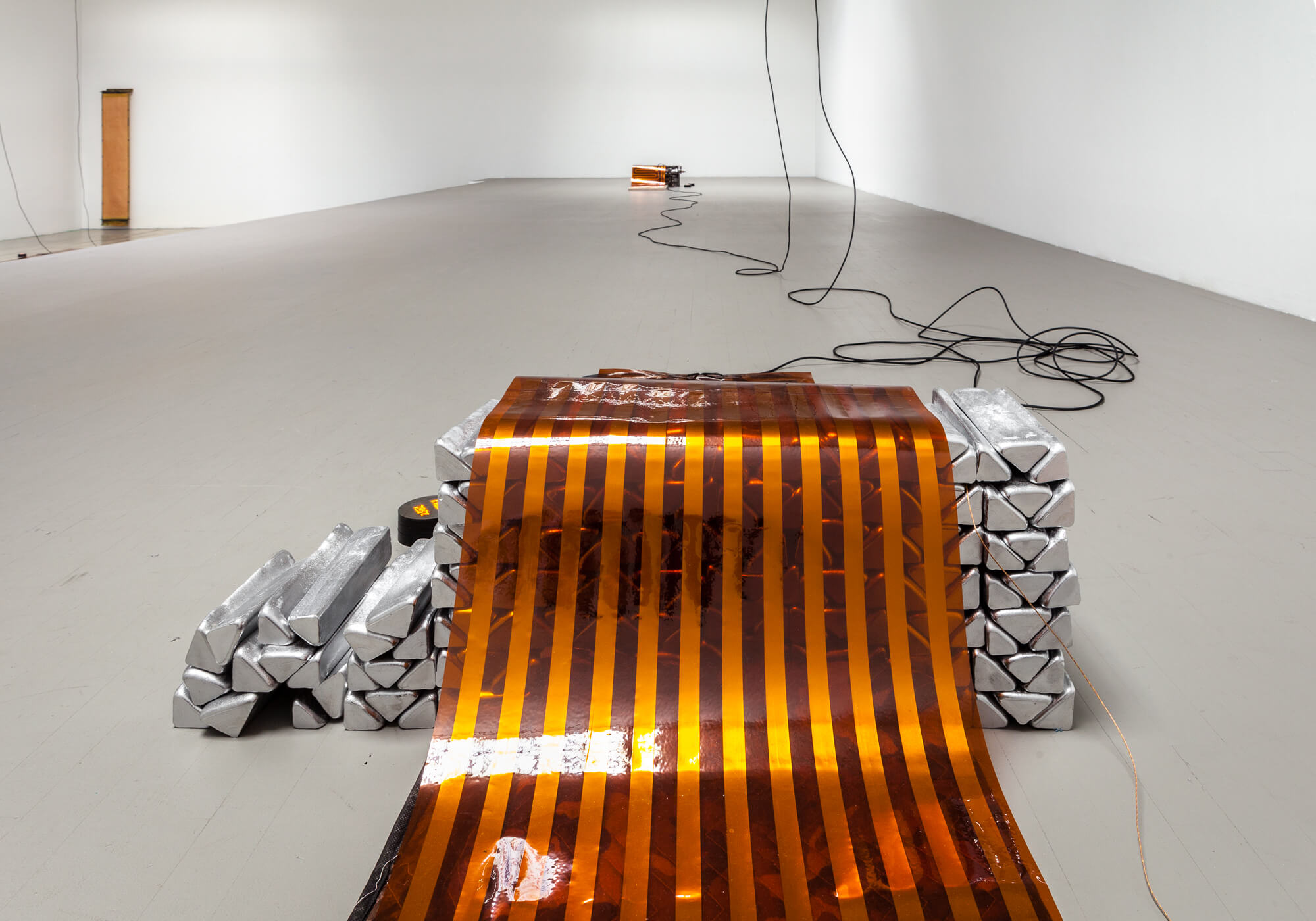 Weak Local Lineament (Warm Parts), 2015. Copper-clad plastic flexible heating circuit, insulated electrical wiring, 2 thermo sensors, aluminum ingots cast from engine blocks, transit blankets. 24 x 72 x 20 in.