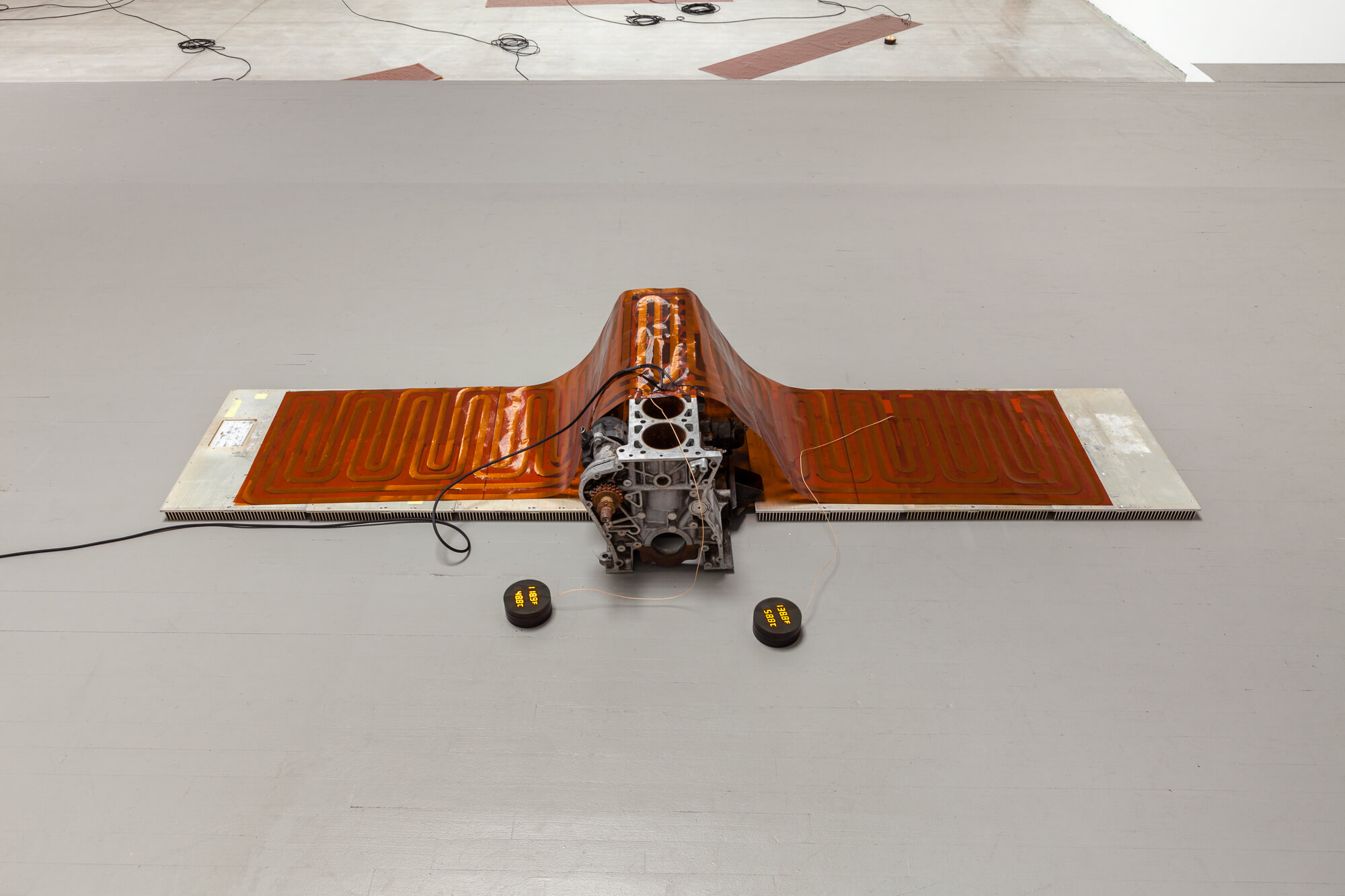 Weak Local Lineament (Jaguar), 2015-2016. Copper-clad plastic flexible heating circuit, insulated electrical wiring, 2 thermo sensors, aluminum heat sinks, straight-six cast aluminum engine block. 24 x 72 x 20 in.