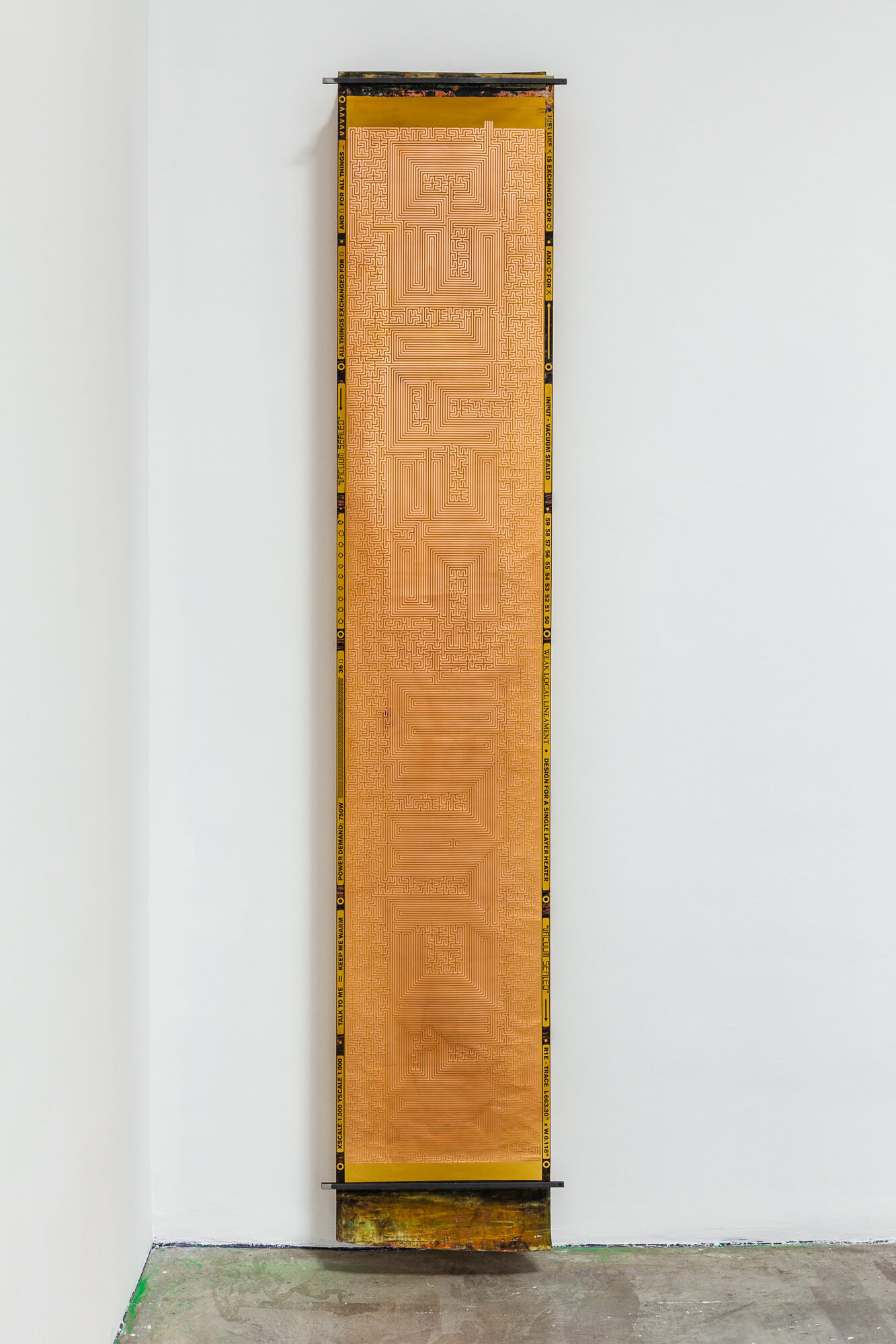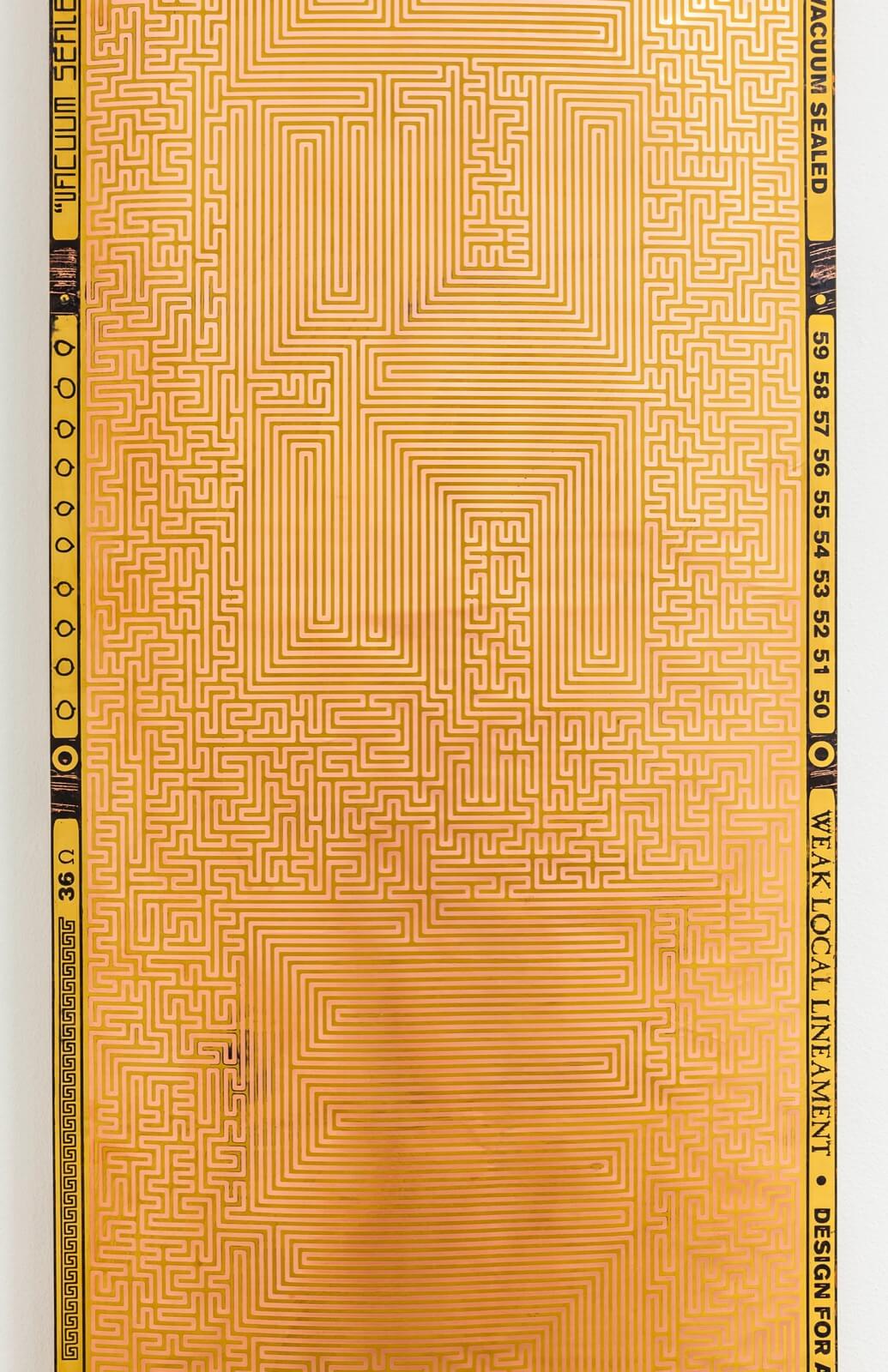 A Weak Local (VACUUM SEALED – Trace Revision 1E), 2016 . Etching on copper-clad plastic, steel brackets. 120 × 20 in.