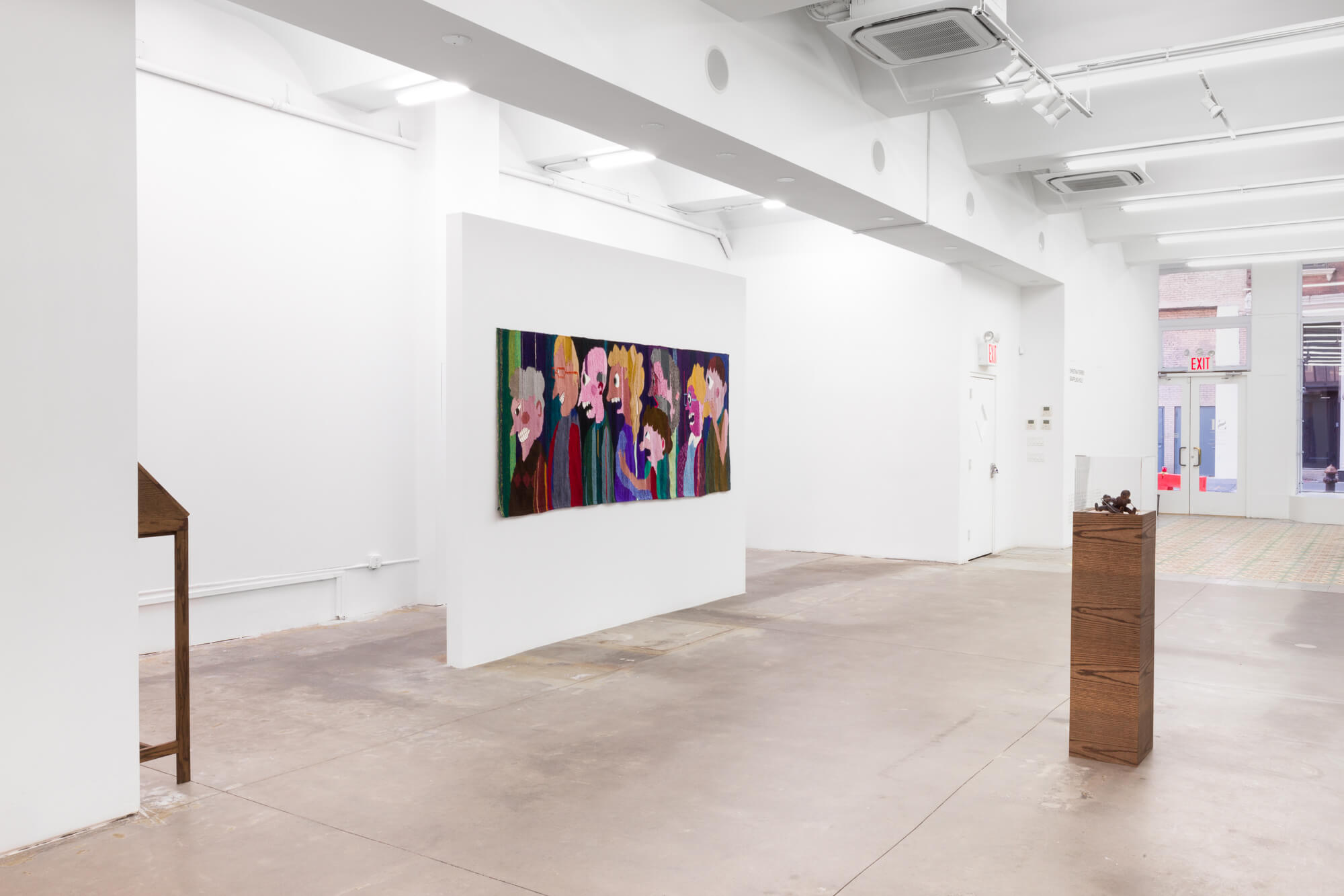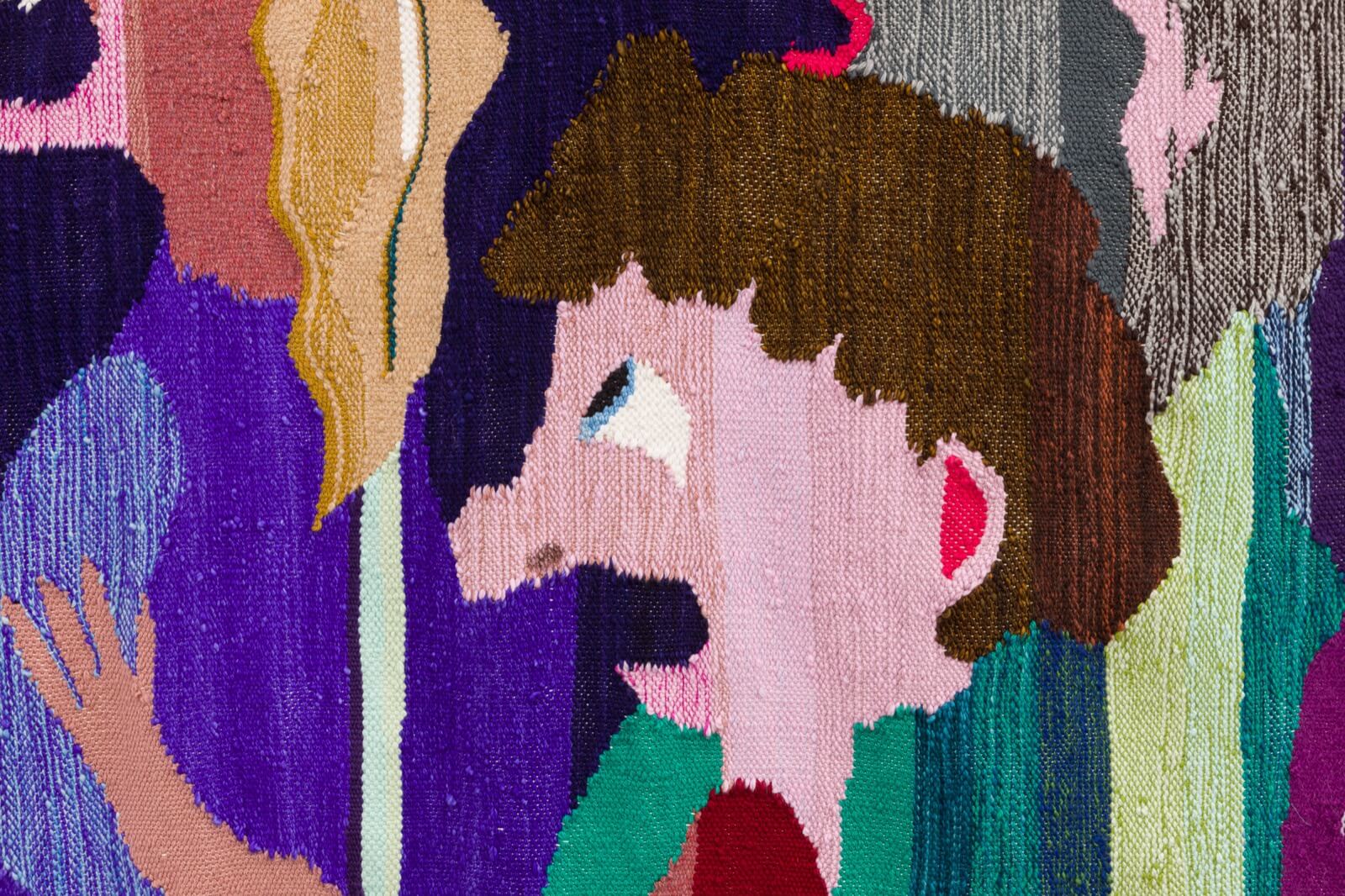 The exhibition continues Forrer’s exploration of the weave itself as a structure that holds and pulls imagery in and out of shape. The artist articulates warring bodies so that they appear tugged and wrenched by the structure underlying the weave, as though tensions in the atmosphere could be experienced literally. In one work, a dysfunctional lineage of bodies gives form to psychologically inherited conflicts that run through generations. In this hysteric image, individuals casually strangle the generations beneath them, perpetuating legacies of hostility and violence with exaggerated absurdity. In another piece, a long row of figures, all facing in the same direction, watch the same unseen event, aghast. Their expressions, at once wild, comical, dumbfounded and horrified, are nonetheless all caught in the glare of a spectacle.