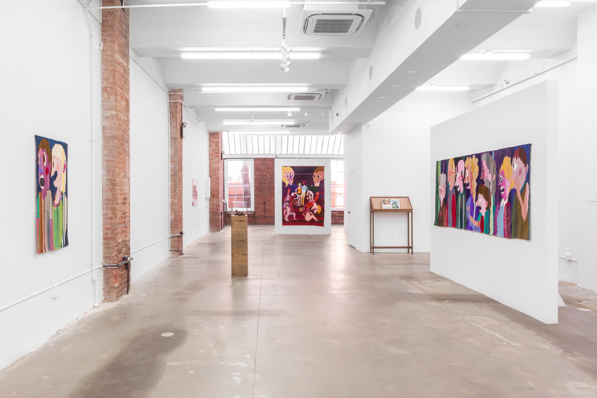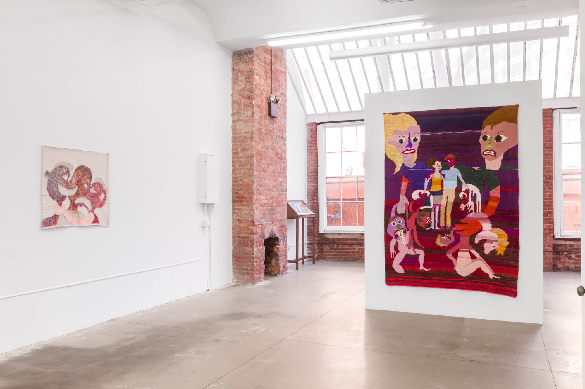 Christina Forrer’s tapestries are disquieting scenes in which naïve, wide-eyed figures are depicted in emotionally fraught situations and cartoonish conflicts. For Grappling Hold, the Swiss artist’s first institutional solo exhibition, Forrer has created several newly commissioned works that vividly illustrate anxieties and violent struggles.