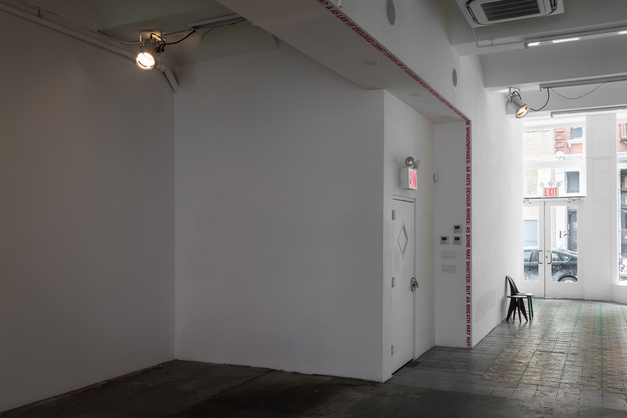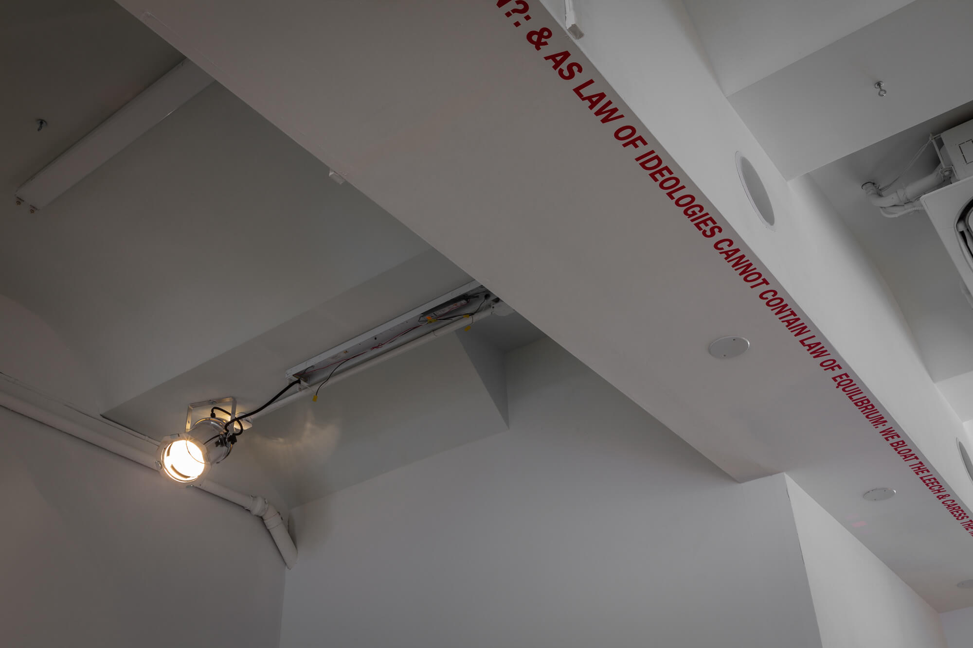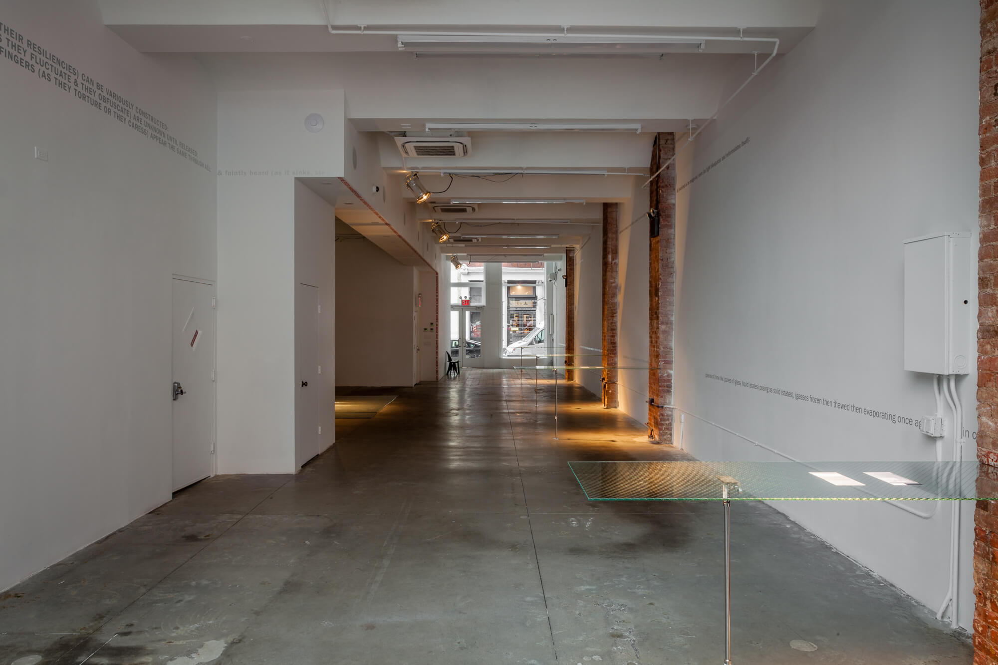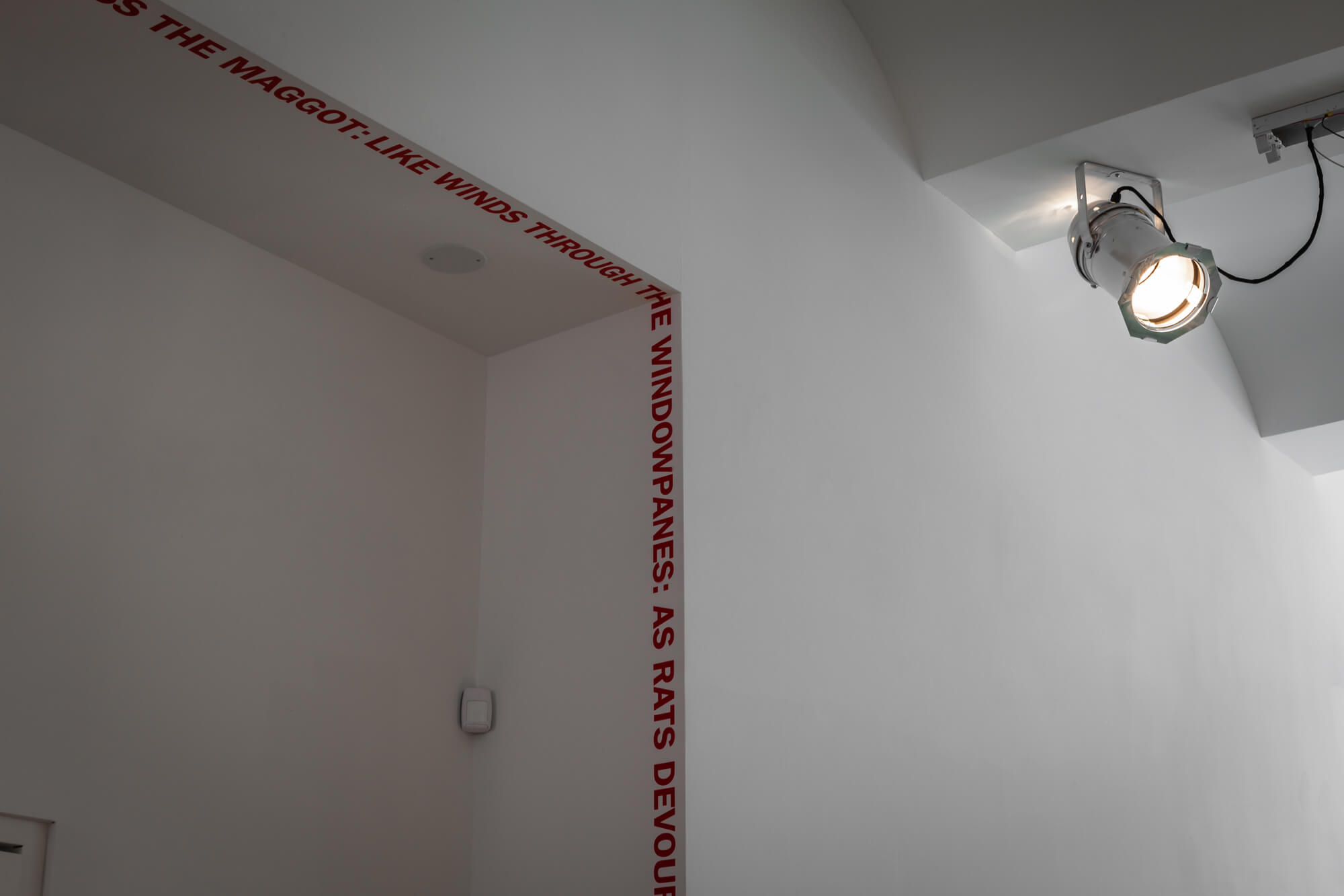 The installation concludes with The Tenderness of Maggots, a theatrical adaptation of Comte de Lautréamont’s (1846-1870) brutal, proto-Surrealist novel Les Chants de Maldoror, re-edited and re-configured for the stage by Studio for Propositional Cinema. Beginning with a short speech during the opening reception, and performed each Saturday during the duration of the exhibition, the narrator of the text gleefully confesses his gruesome and evil acts on a glass stage behind a “curtain” of text asking: AS WE ENTER UNWANTED FUTURES: ARE VIRUSES NOT ALSO SEEKING CONNECTIONS?: DO MAGGOTS NOT ALSO HAVE MOMENTS OF TENDERNESS?: &: WHAT CAN WE BUILD IN AN AGE OF WALLS?: WHAT CAN WE DISMANTLE IN AN AGE OF EROSION?…