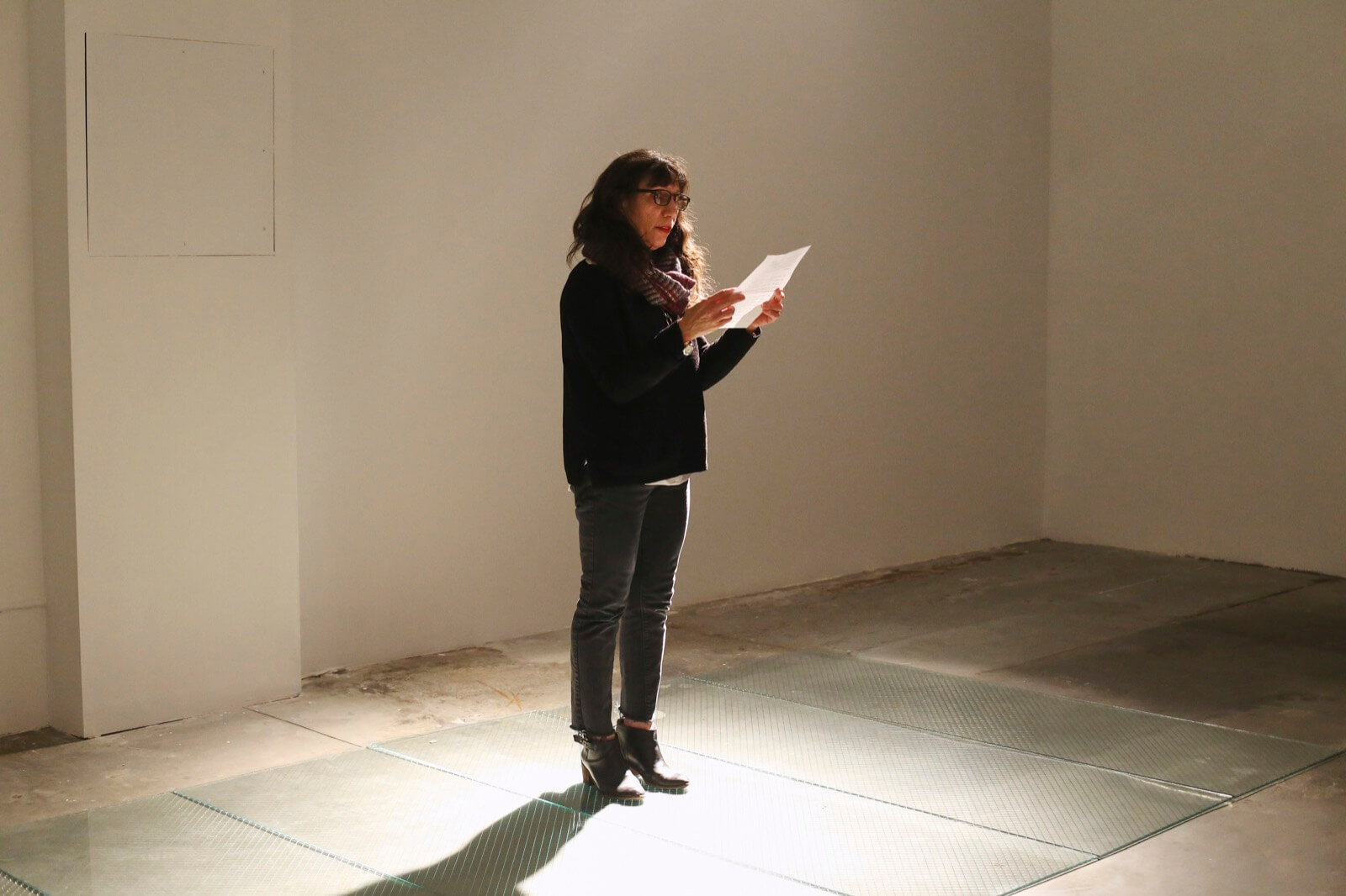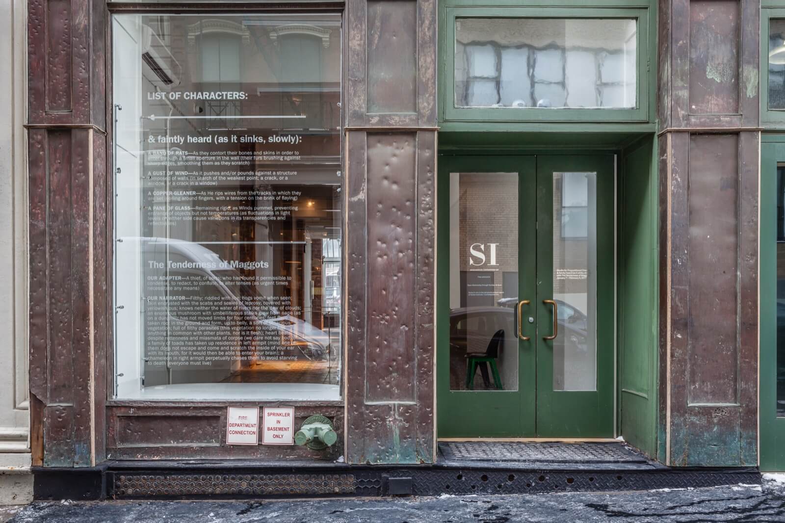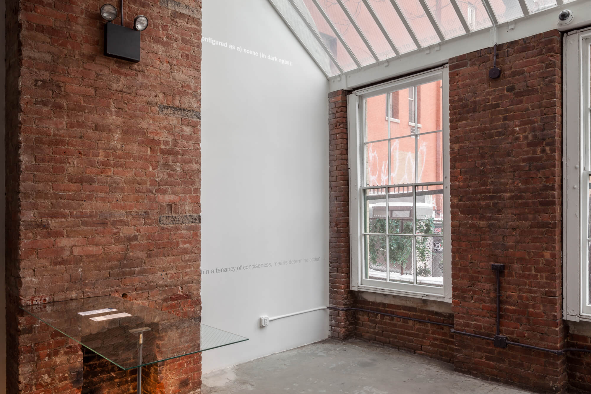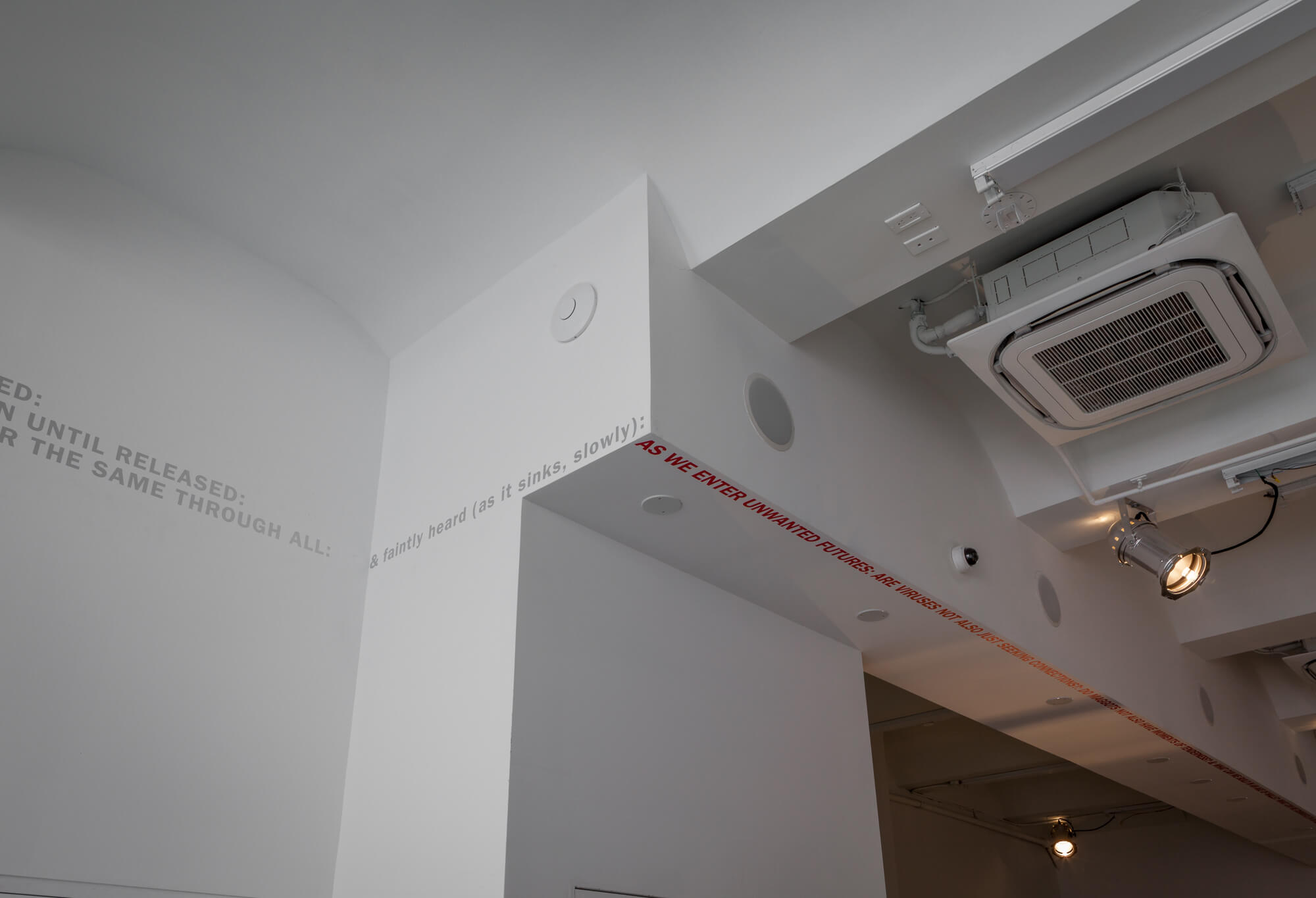 The installation concludes with The Tenderness of Maggots, a theatrical adaptation of Comte de Lautréamont’s (1846-1870) brutal, proto-Surrealist novel Les Chants de Maldoror, re-edited and re-configured for the stage by Studio for Propositional Cinema. Beginning with a short speech during the opening reception, and performed each Saturday during the duration of the exhibition, the narrator of the text gleefully confesses his gruesome and evil acts on a glass stage behind a “curtain” of text asking: AS WE ENTER UNWANTED FUTURES: ARE VIRUSES NOT ALSO SEEKING CONNECTIONS?: DO MAGGOTS NOT ALSO HAVE MOMENTS OF TENDERNESS?: &: WHAT CAN WE BUILD IN AN AGE OF WALLS?: WHAT CAN WE DISMANTLE IN AN AGE OF EROSION?…