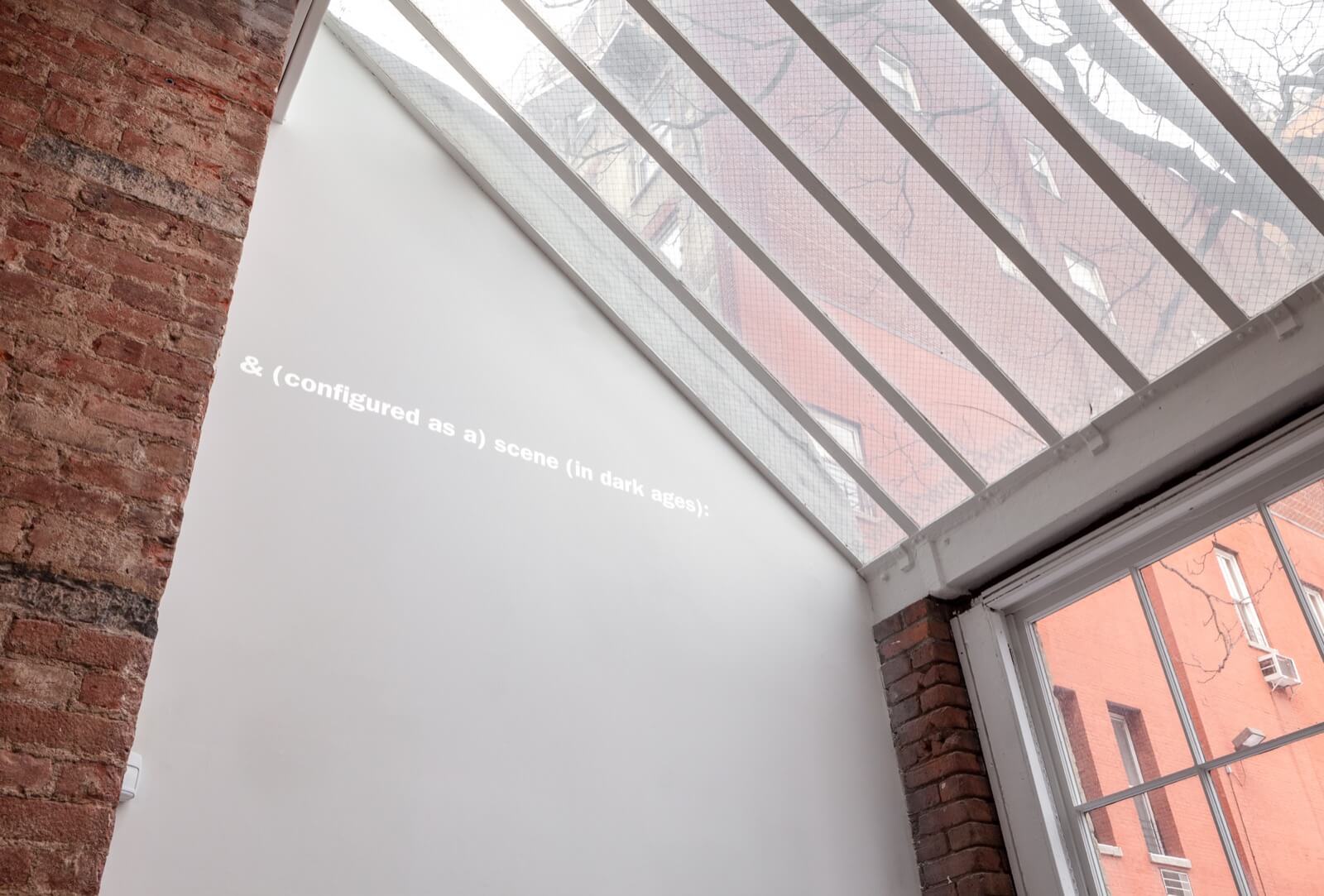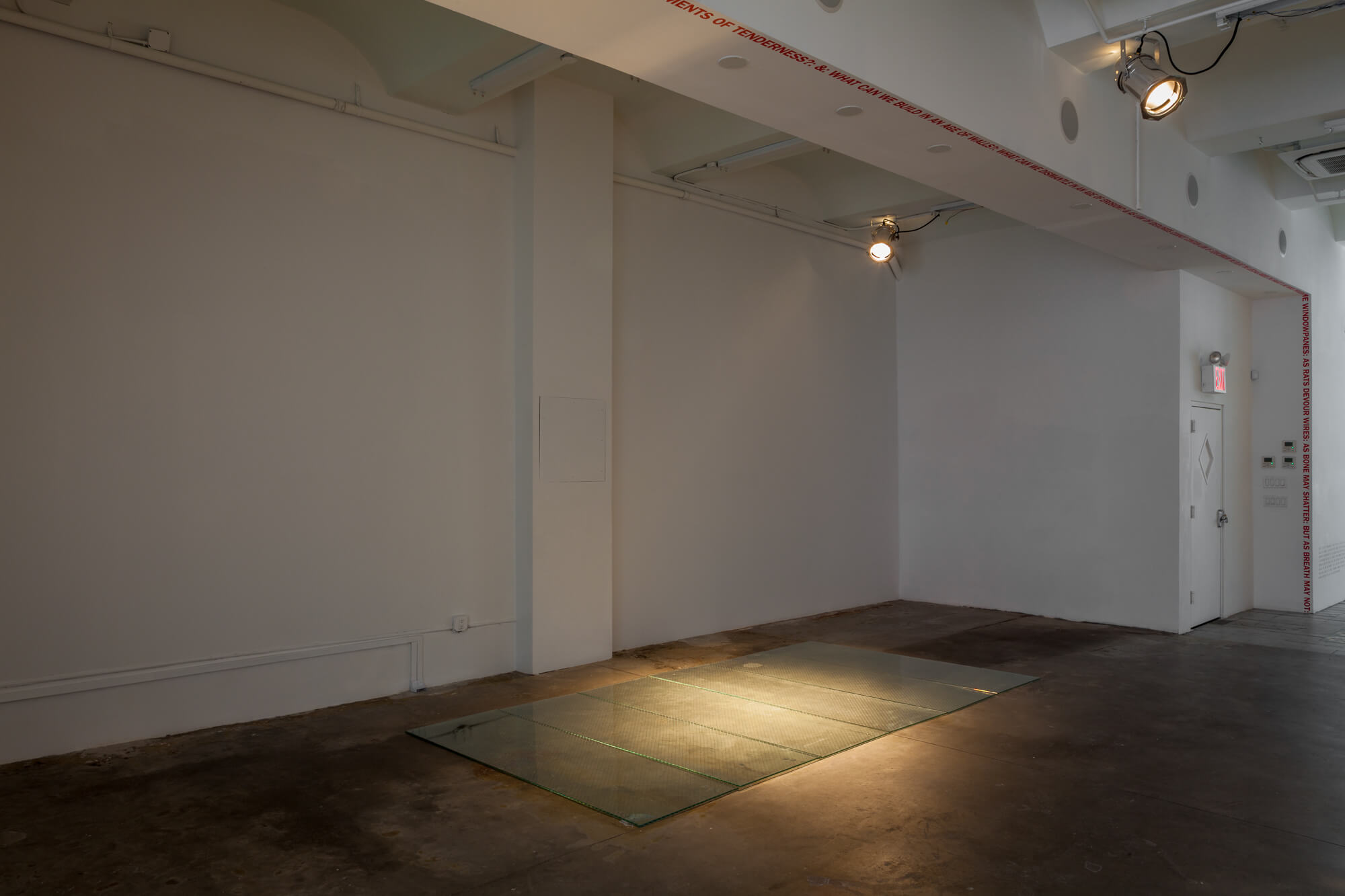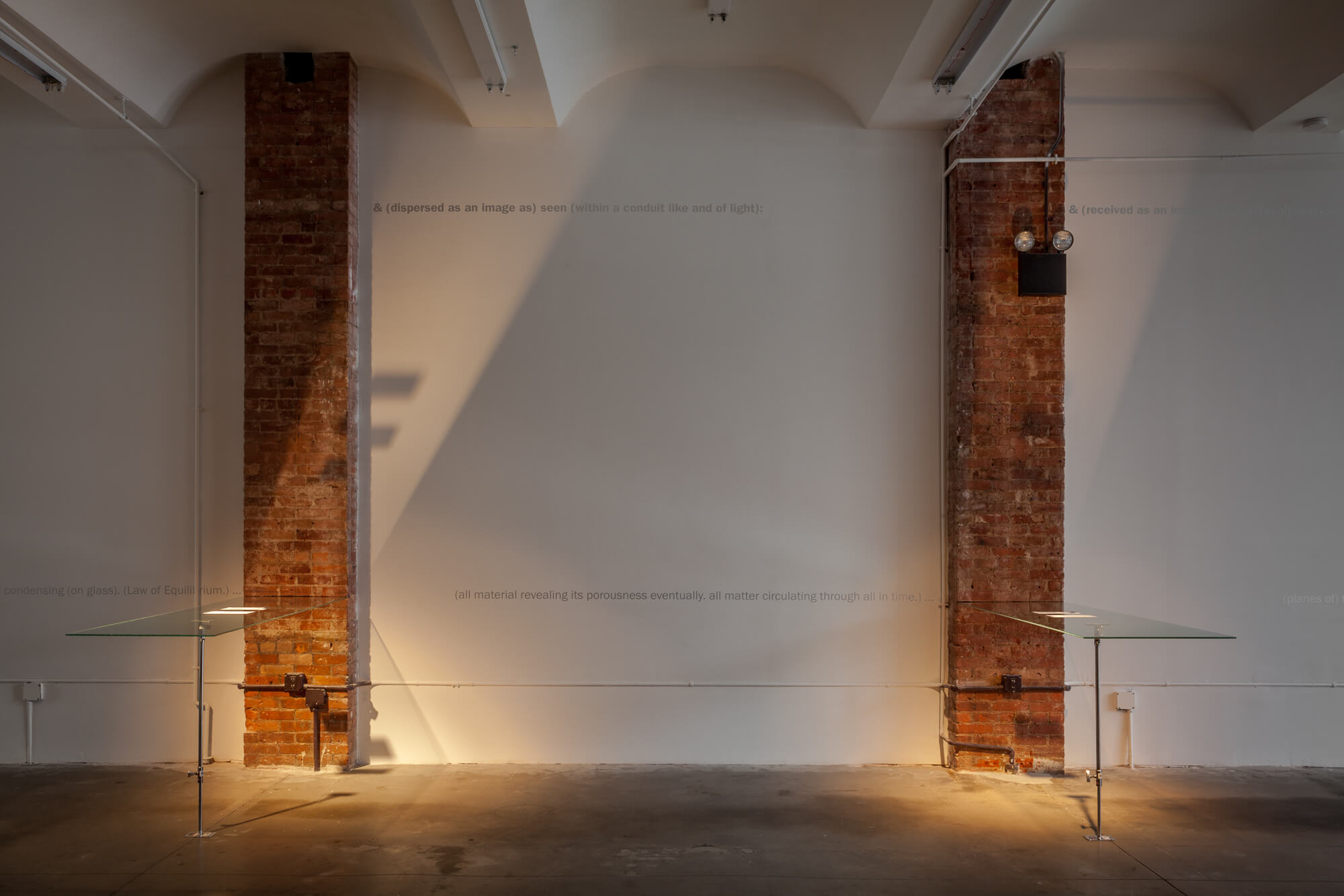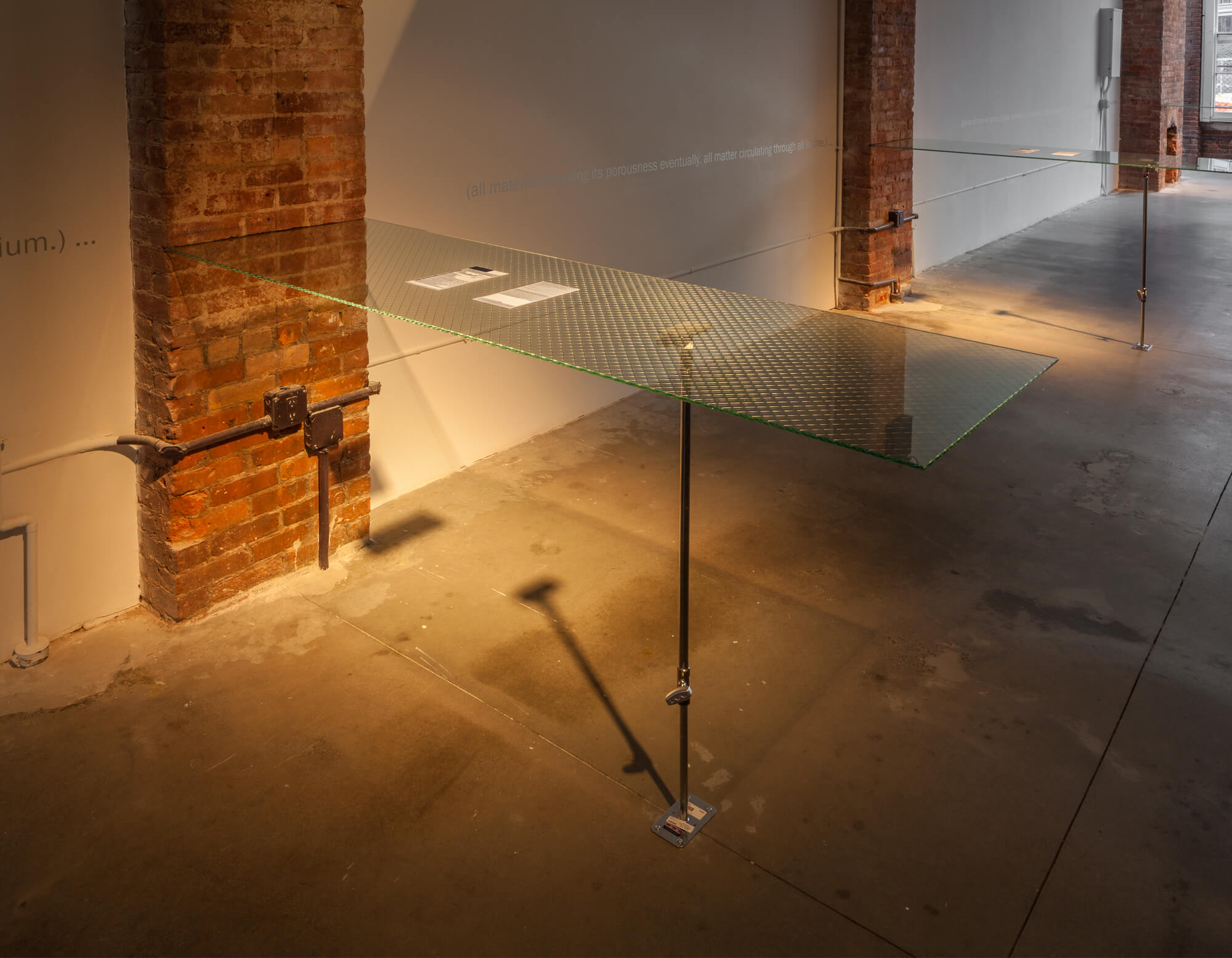The installation concludes with The Tenderness of Maggots, a theatrical adaptation of Comte de Lautréamont’s (1846-1870) brutal, proto-Surrealist novel Les Chants de Maldoror, re-edited and re-configured for the stage by Studio for Propositional Cinema. Beginning with a short speech during the opening reception, and performed each Saturday during the duration of the exhibition, the narrator of the text gleefully confesses his gruesome and evil acts on a glass stage behind a “curtain” of text asking: AS WE ENTER UNWANTED FUTURES: ARE VIRUSES NOT ALSO SEEKING CONNECTIONS?: DO MAGGOTS NOT ALSO HAVE MOMENTS OF TENDERNESS?: &: WHAT CAN WE BUILD IN AN AGE OF WALLS?: WHAT CAN WE DISMANTLE IN AN AGE OF EROSION?…