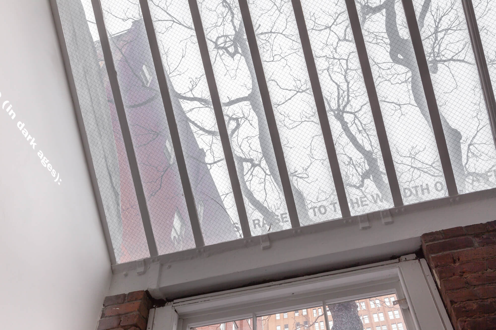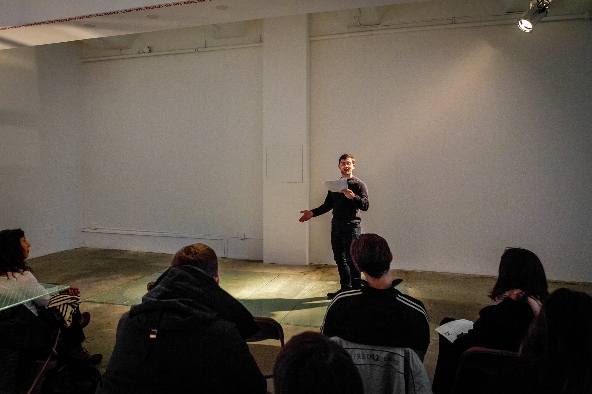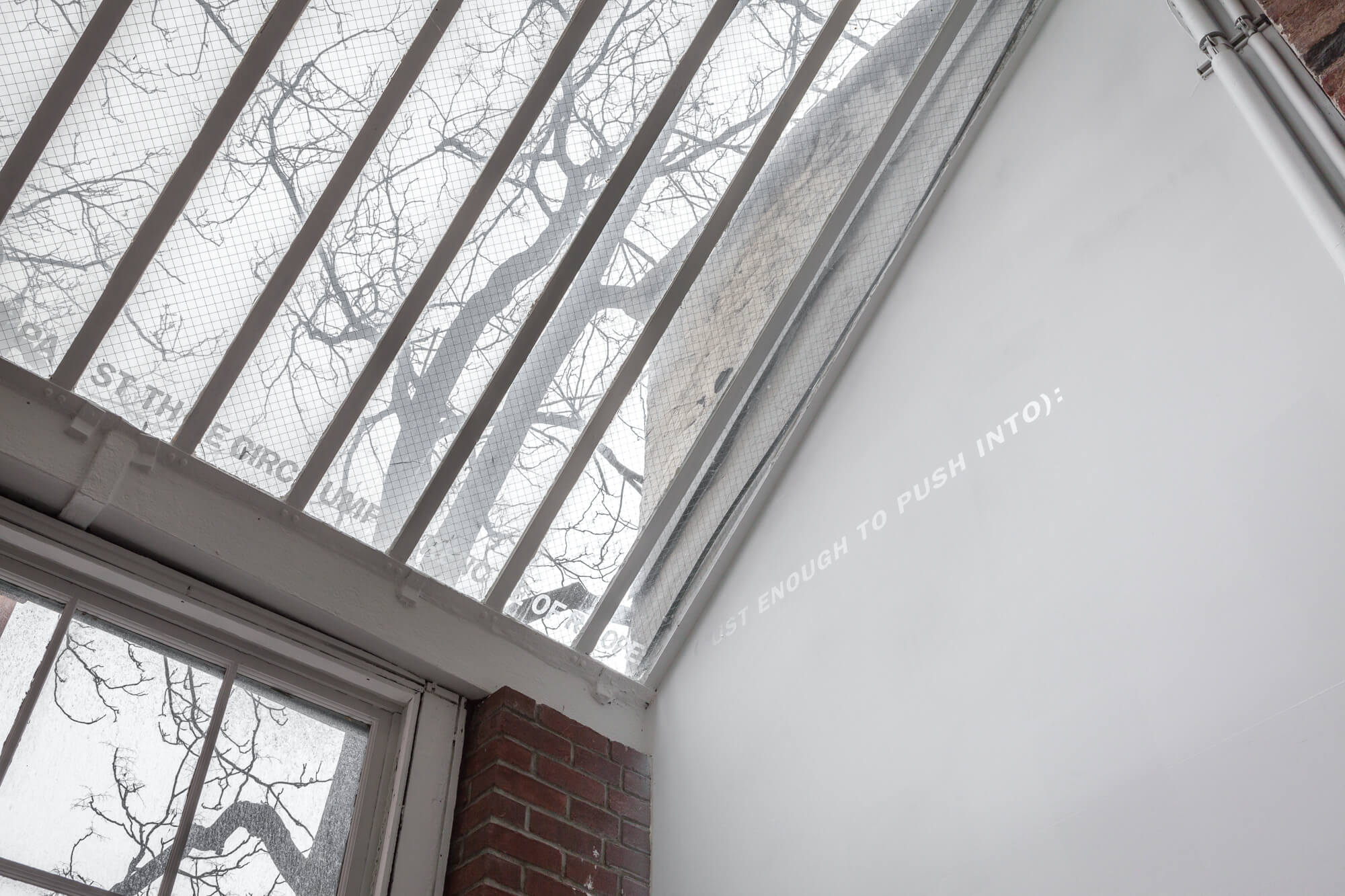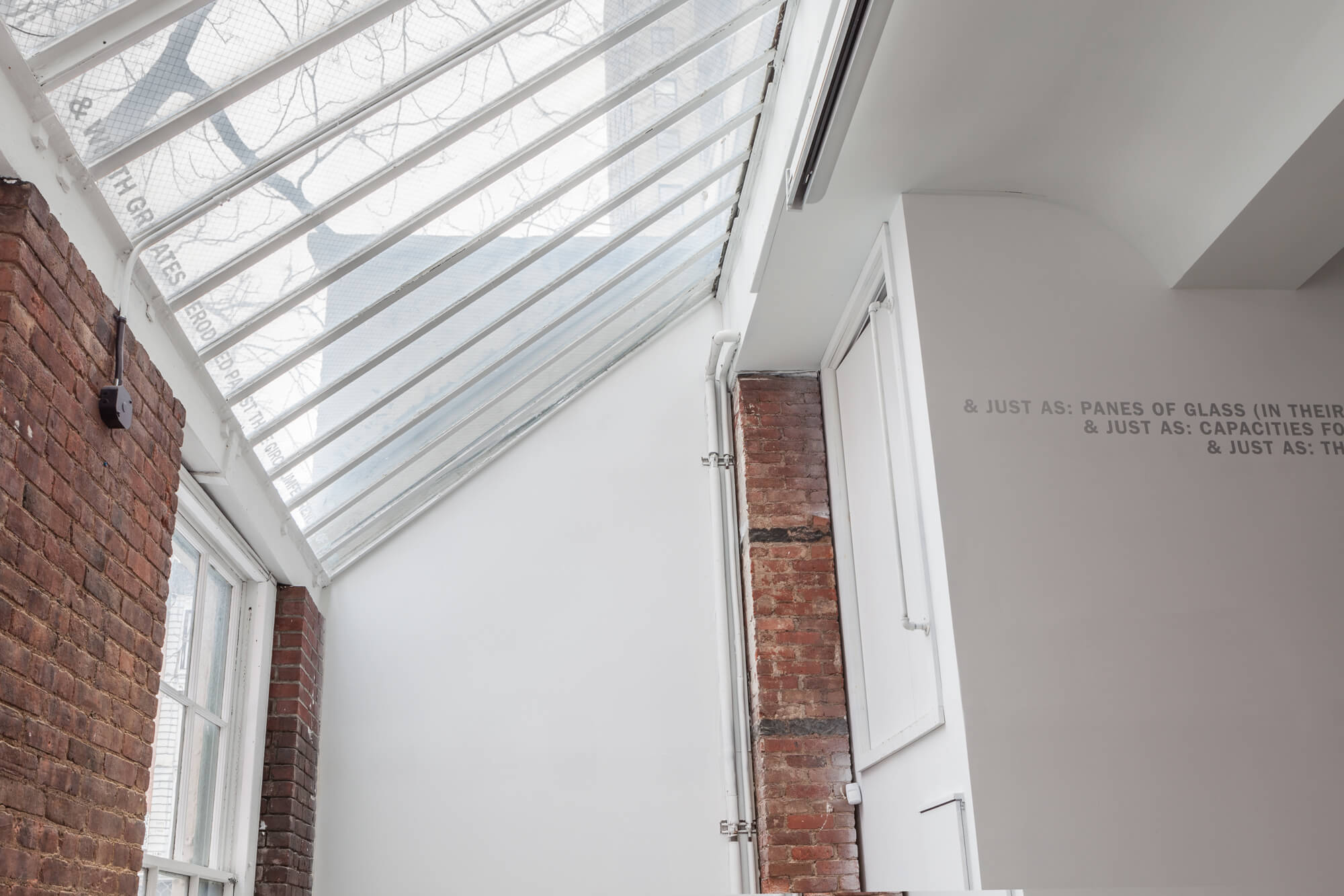 The installation concludes with The Tenderness of Maggots, a theatrical adaptation of Comte de Lautréamont’s (1846-1870) brutal, proto-Surrealist novel Les Chants de Maldoror, re-edited and re-configured for the stage by Studio for Propositional Cinema. Beginning with a short speech during the opening reception, and performed each Saturday during the duration of the exhibition, the narrator of the text gleefully confesses his gruesome and evil acts on a glass stage behind a “curtain” of text asking: AS WE ENTER UNWANTED FUTURES: ARE VIRUSES NOT ALSO SEEKING CONNECTIONS?: DO MAGGOTS NOT ALSO HAVE MOMENTS OF TENDERNESS?: &: WHAT CAN WE BUILD IN AN AGE OF WALLS?: WHAT CAN WE DISMANTLE IN AN AGE OF EROSION?…