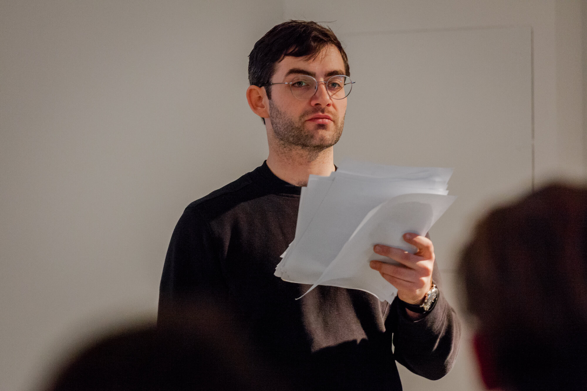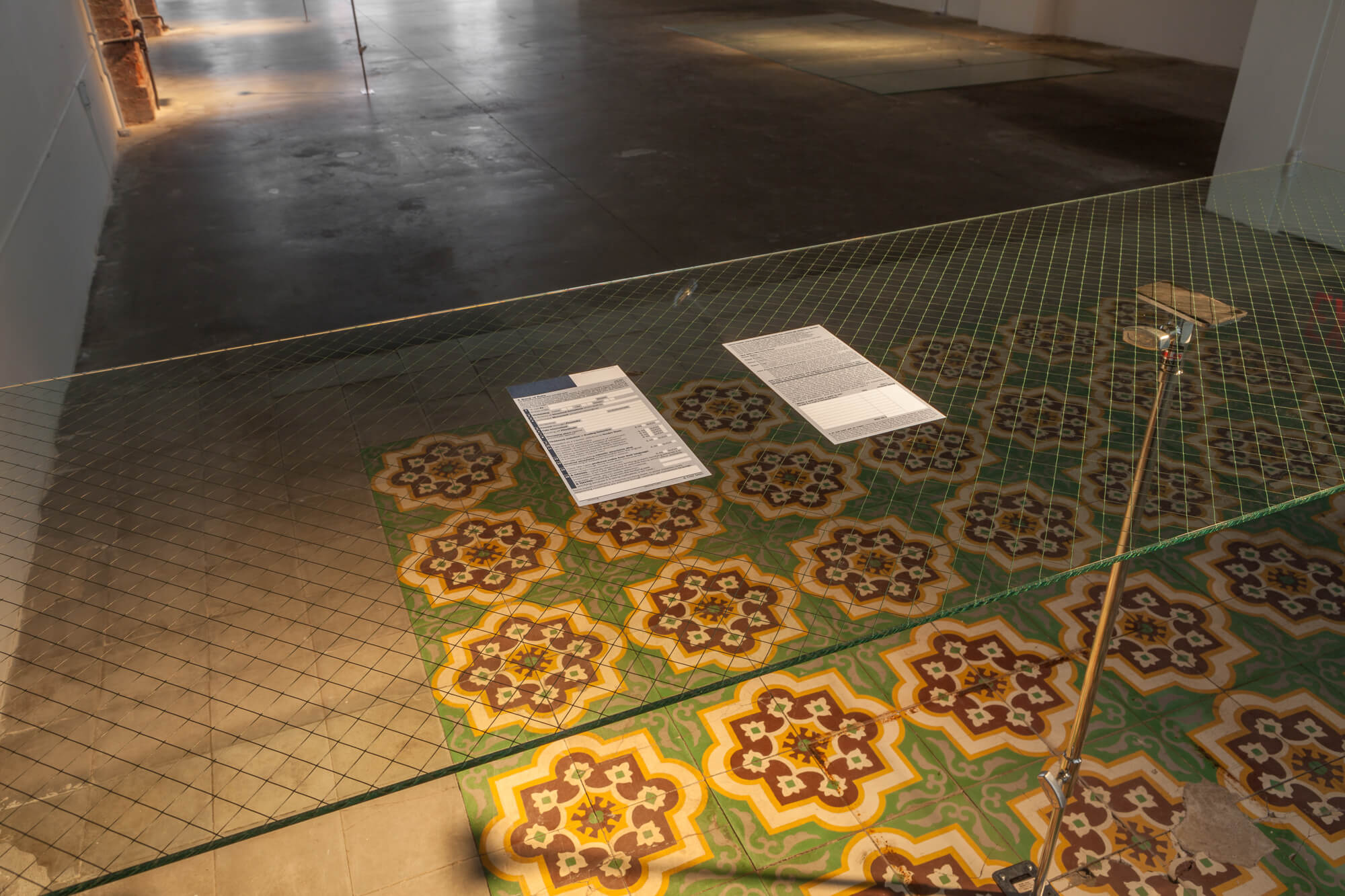 The first play, & faintly heard (as it sinks, slowly):, by Studio for Propositional Cinema, is installed in the exhibition space as a wall text, printed documents, and scenographic elements. The play is enacted by the spectator as they read and traverse the space, and contains four monologues by the play’s central characters – A BAND of RATS, A GUST of WIND, A COPPER-GLEANER, and A PANE of GLASS. Their soliloquies are printed in the style of the US Immigration Customs Declaration form, a legal document that must be filled in by all persons entering the country.