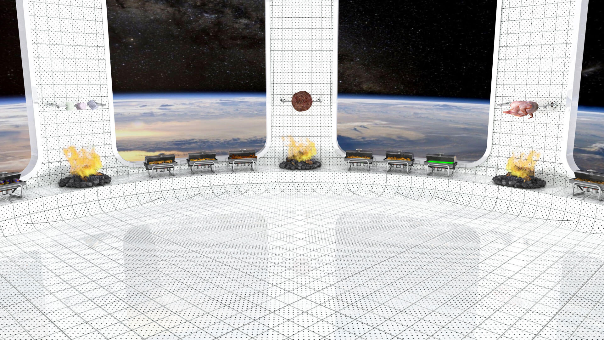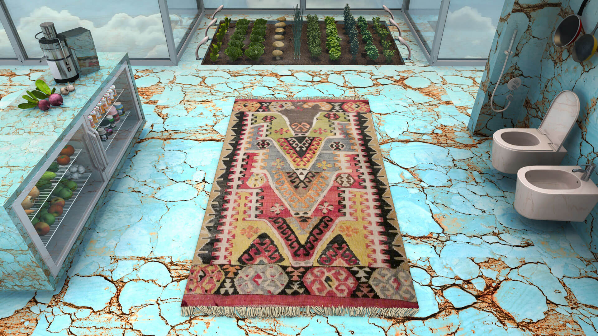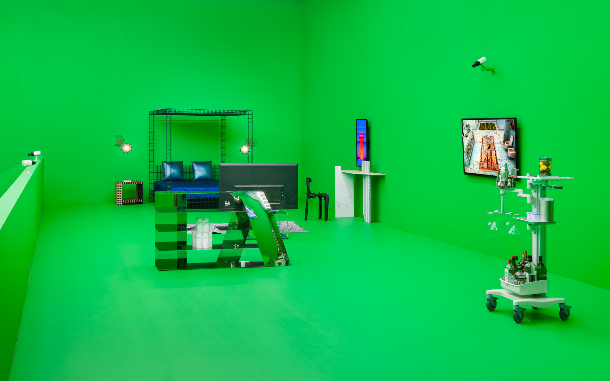 In addition to serving as a platform for new design, PAVILLON DE L’ESPRIT NOUVEAU is also an interactive, architectural experience. Divided into softly delineated zones, each increasing in levels of privacy, the exhibition design by architect and artist Shawn Maximo makes use of digital rendering technology and Chroma key compositing. The 21st century show home incorporates scenarios of different domestic environments, exploring the blurred lines in a culture of digital escapism and surveillance.