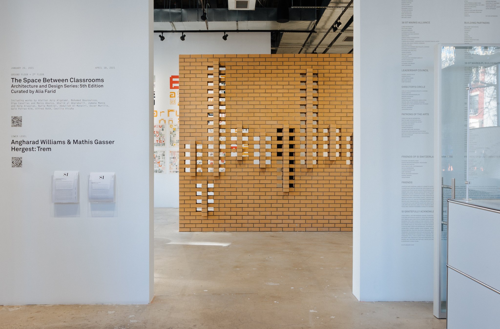 SI gratefully acknowledges the support of the VIA Art Foundation, the Barjeel Art Foundation, David Zwirner, the SI Architecture & Design Council, and the Cultural Services of the French Embassy. Production support for The Space Between Classrooms is kindly provided in part by the Arab Fund for Arts and Culture. Special thanks to Media Partner PIN–UP. SI wishes to thank the lenders to the exhibition: the Archive of the Institute for the History and Theory of Architecture (gta) at ETH Zürich; Betty Boyd Dettre Library and Research Center, National Museum of Women in the Arts; Commonwealth and Council, Los Angeles; Frequencies Project Foundation; kamel mennour, Paris/London; and the artists. Alia Farid wishes to thank Alison Coplan, Huda Abdulmughni, Soleil Gharbeih, Clara Dublanc, Jess Clifford, Hunter Gilliland and Simon Castets.