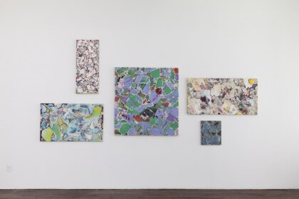 Pavel Büchler’s series Modern Paintings (1999-2000) dissimulates a no less mechanical act into so many visual clichés of abstraction. Reminiscent of generic modern art, the series is culled from flea-market bought paintings which are un-stretched, inserted in a washer, and reconstituted by the artist on a stretcher such that they resemble Art Brut abstractions.