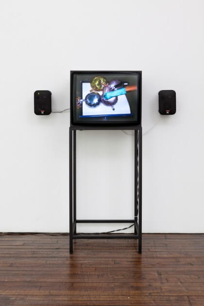 Alex Hubbard’s contemporary classic Cinépolis (2007), ironically underpinned by the principles of action painting and the flashy aesthetics of Pop Art, is a fitting counterpart to Büchler’s period pieces. Accompanied by a Foley soundtrack, this video portrays Hubbard subjecting a small movie screen to a series of ruinous gestures, such as torching a group of metallic balloons and then tarring and feathering the screen.