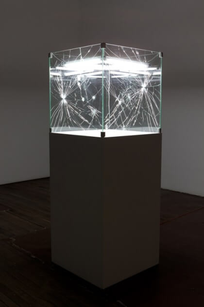 Although effectively destroyed, Monica Bonvicini’s White (2003), which consists of a cube of fractured safety glass, housing a square armature of illuminated neon tubes, nonetheless seeks to resist destruction, which will be unequivocal in the two following works.