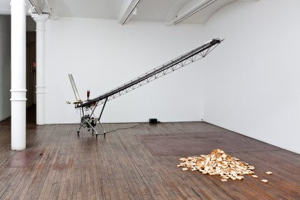 Among the works that more directly engage the question of consumption can be found Johannes Vogl’s absurd, homemade contraption Untitled (Machine To Produce Jam Breads, 2007) which produces pieces of bread with jam on them and thus addresses questions of overproduction and consequently waste.