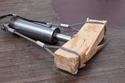 Arcangelo Sassolino’s Untitled (2007) perceives technology as a brute, destructive force, which cannot be disassociated from environmental issues. A hydraulic arm that gradually pushes into and senselessly destroys a large block of wood, Untitled consumes with a methodical and massive appetite.