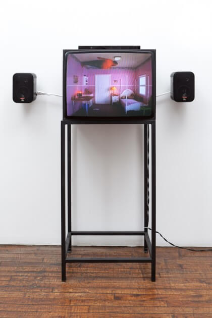 The circularity of this work is carried to another (il)logical extreme in Martin Kersel’s video Pink Constellation (2001). This video features the artist and alternatively a dancer negotiating the topples and turns of a room, which has been outfitted with the accoutrements of a teenage girl, as it rotates end over end, thus transfiguring the somersaulting contents into unrecognizable dreck.