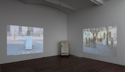 The slapstick humor of this piece finds a rather dry counterpart in Jimmie Durham’s classic sculpture St. Frigo (1996) and its corresponding video installation, Stoning the Refrigerator (1996). The result of beginning his daily routine for ten days in a row by throwing cobblestones at a refrigerator for one hour, this piece speaks to an iconoclastic form of destruction as a daily, self-affirmative ritual. This demolishing element of comedy becomes rather dramatic in the final two works in this part of the exhibition.