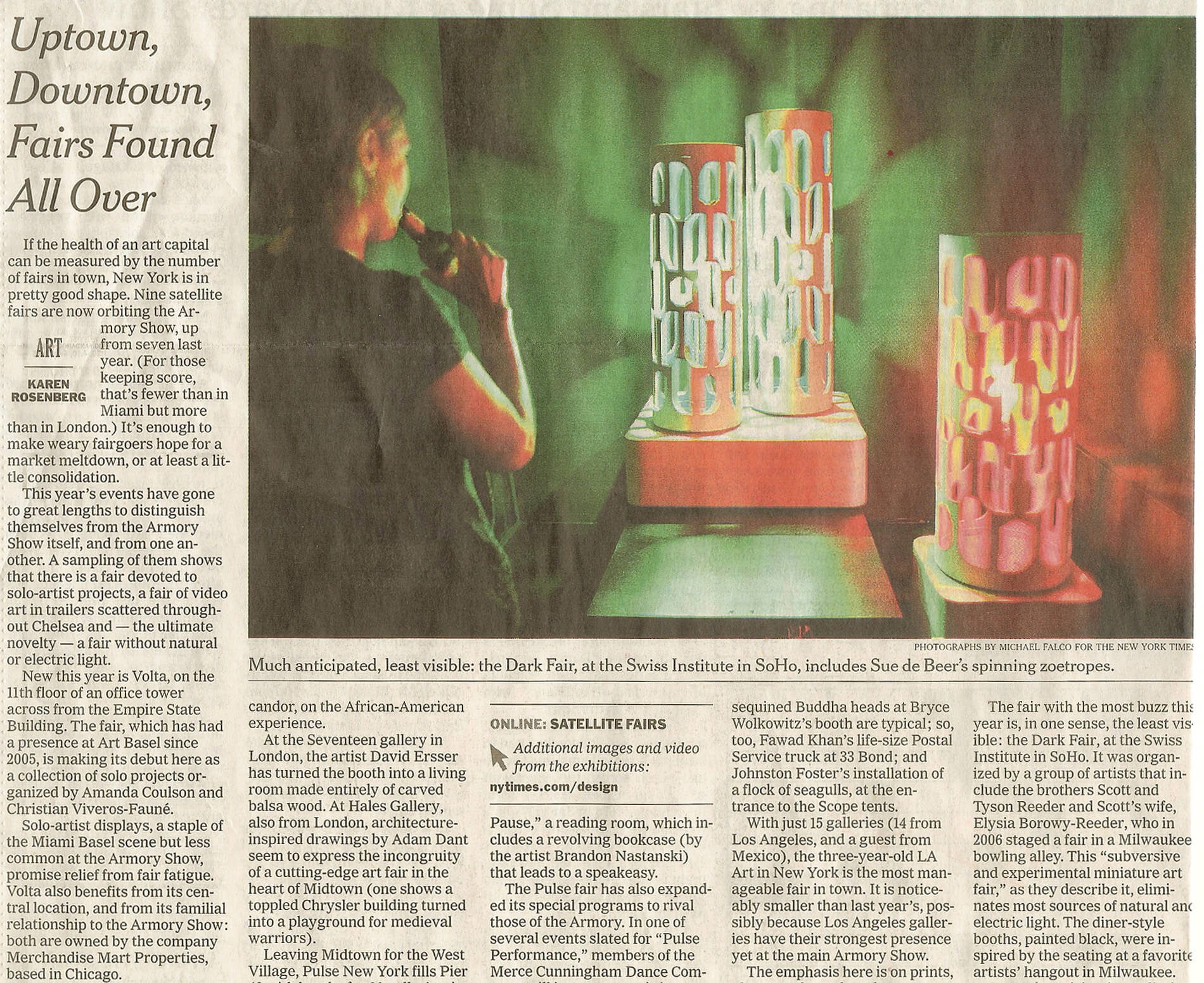 …The fair with the most buzz this year, is in one sense, the least visable: the Dark Fair, at the Swiss Institute in Soho. It was organized by a group of artists that include the brothers Scott and Tyson Reeder and Scott’s wife, Elysia Borrowy-Reeder, who in 2006 staged a fair in a Milwaukee bowling alley. This “subversive and experimental, miniature art fair,” as they described it, eliminates most sources of natural and electric light. The diner-style booths, painted black, were inspired by the seating at a favorite artists’ hangout in Milwaukee…