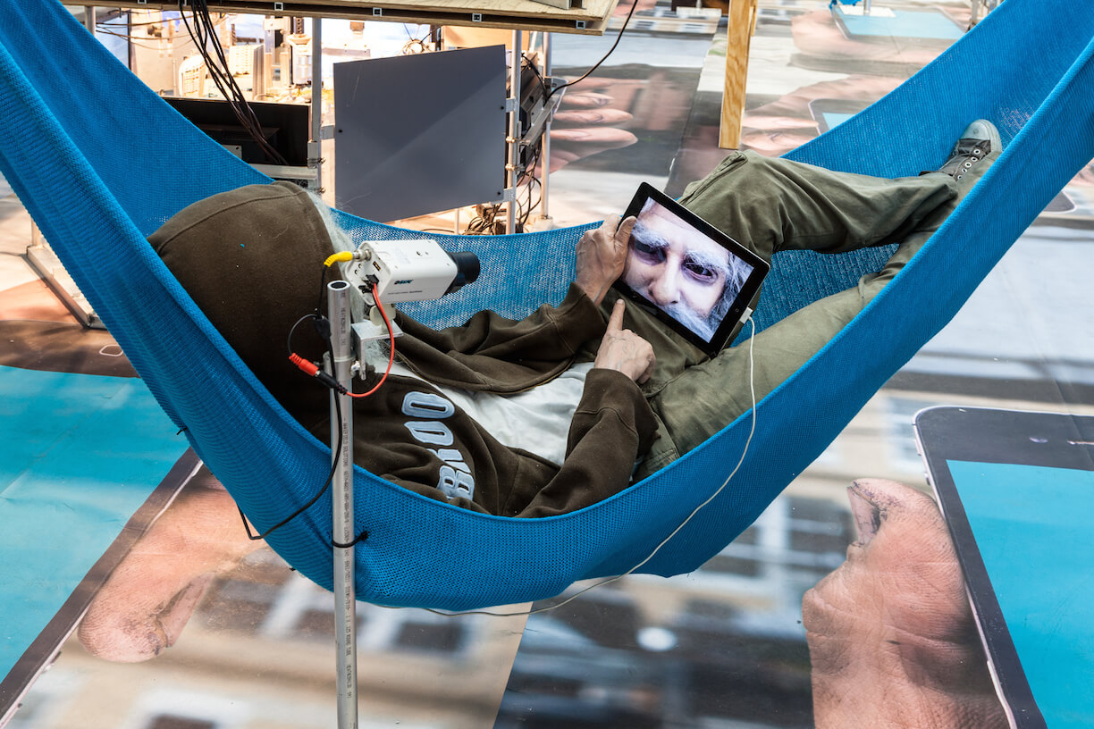 M.C. Escher meets Eugene Debs in this madcap installation with sinister undertones. Visitors enter through a series of arches, designed to suggest the silver cases of MacBook Pros. A nearby monitor reveals an image of the viewer caught in an endless succession of screens—a digital hall of mirrors. A maze, made of panels displaying images of iPods and iPhones, contains hidden cameras that place portraits of gallerygoers into advertisements for the devices. Underlying the obvious messages—our every move is being subsumed by digital culture—is a subtler call of fair labor practices. The blue fabric that unfurls throughout the space issues from a hand-operated knitting machine, and miniature anti-suicide nets refer to the less than optimal working conditions at Apple’s factories in China. Through April 28. (Swiss Institute, 18 Wooster St. 212-925-2035.)