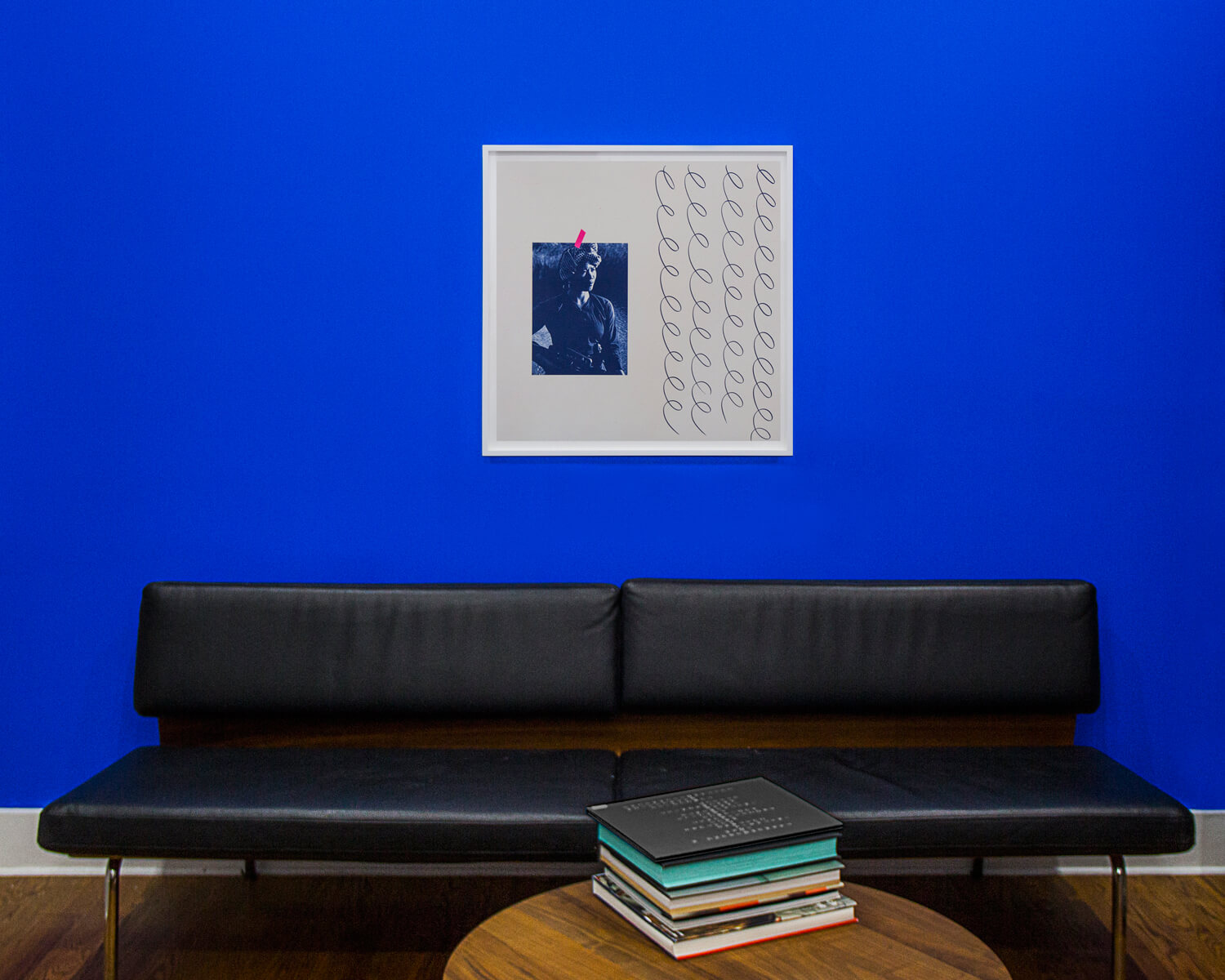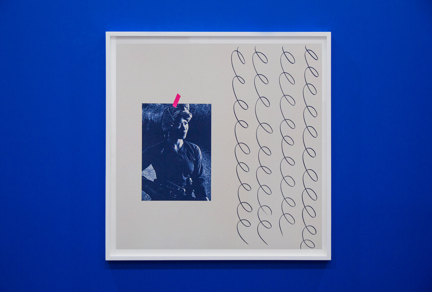 In Féminaire, her 2017 exhibition at David Kordansky Gallery, Mai-Thu Perret created a tableau of monumental figures, comprising nine female soldiers and one dog at rest atop a plateau-like white plinth. An exploration of militant women returns in Les Guérillères (Viet Cong), which features a photograph of an unidentified woman holding a machine gun in repose, seemingly taped to a backing that features four black bands of looping scrawl.